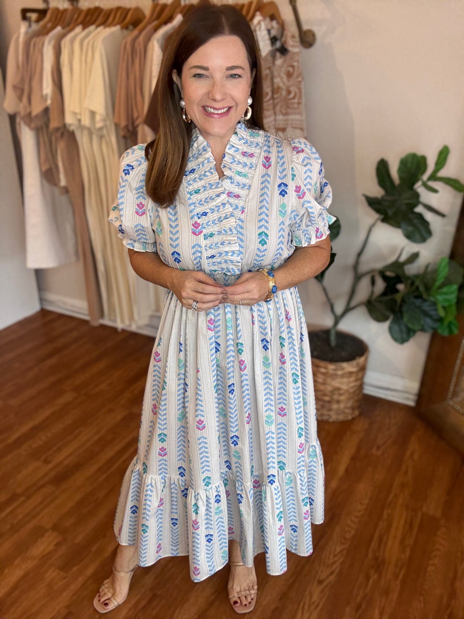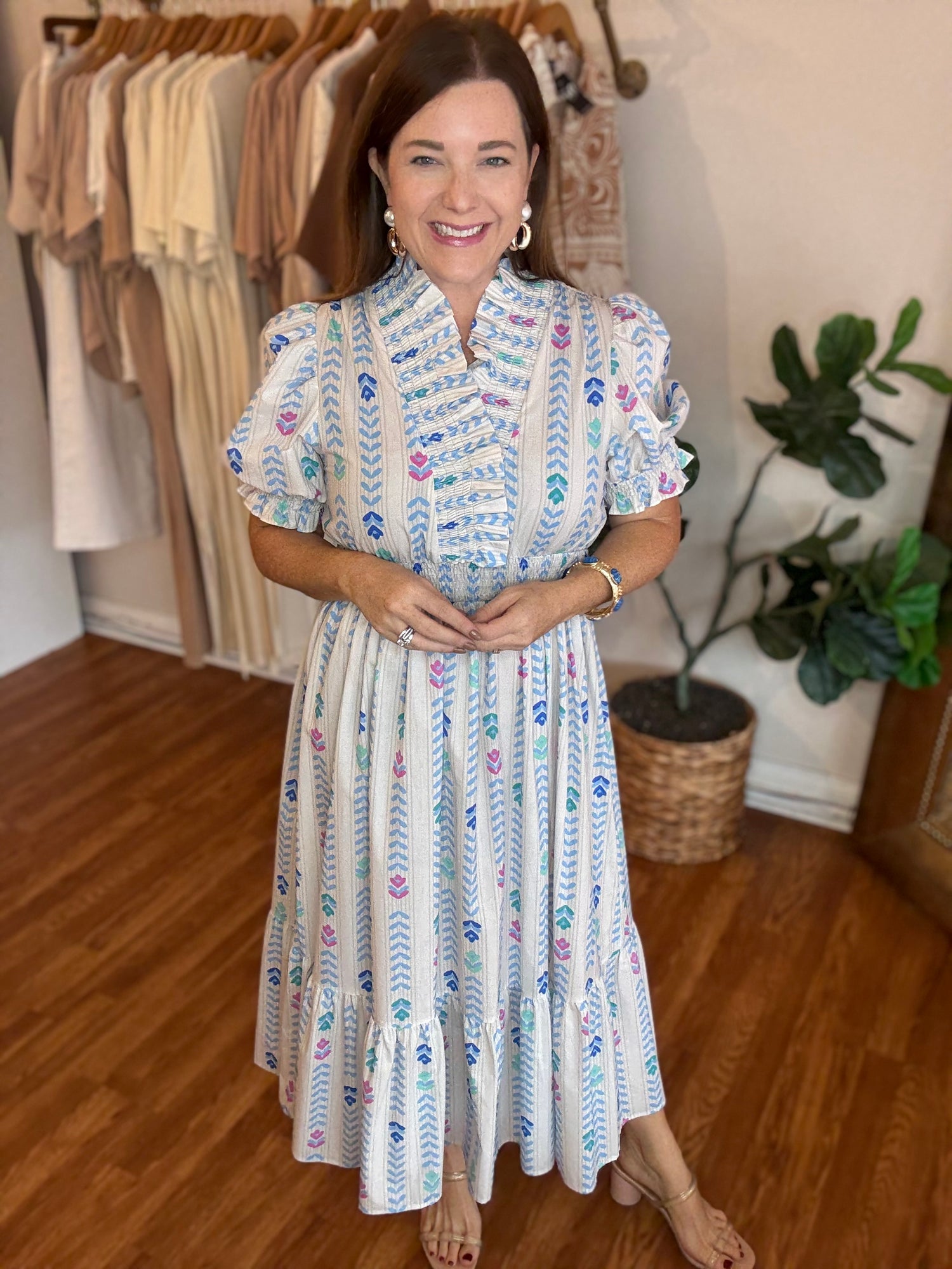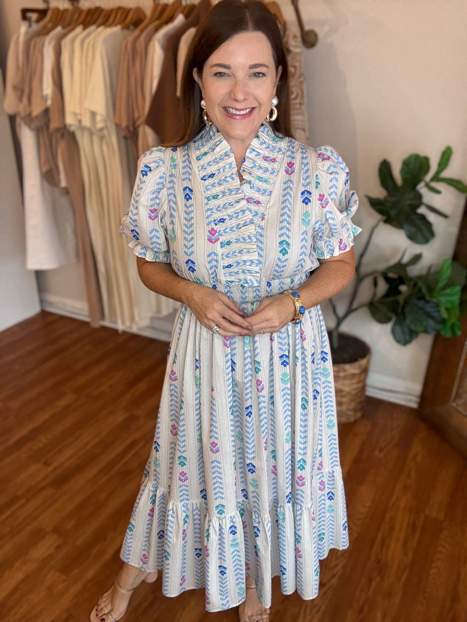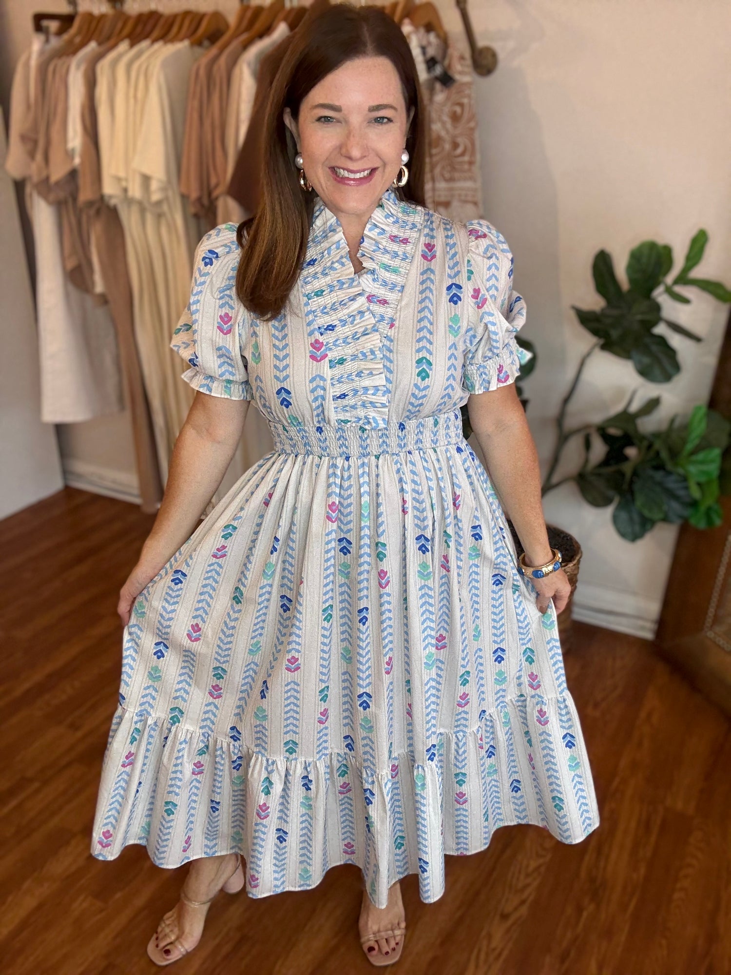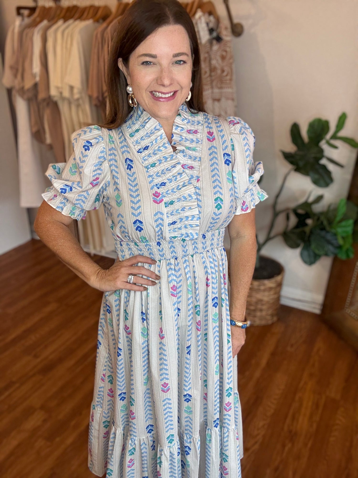 Discover the perfect dress for any occasion with our Back to Good Dress! The trendy bloom print adds a touch of elegance while the subtle off white with pops of color brings a fun and playful touch. The preppy high collar and elastic waist provide both style and comfort, making this dress a must-have in your wardrobe. These have no stretch and run true to size. Candace is 5’4”, size 6/8, bra 38c, and wearing a small.