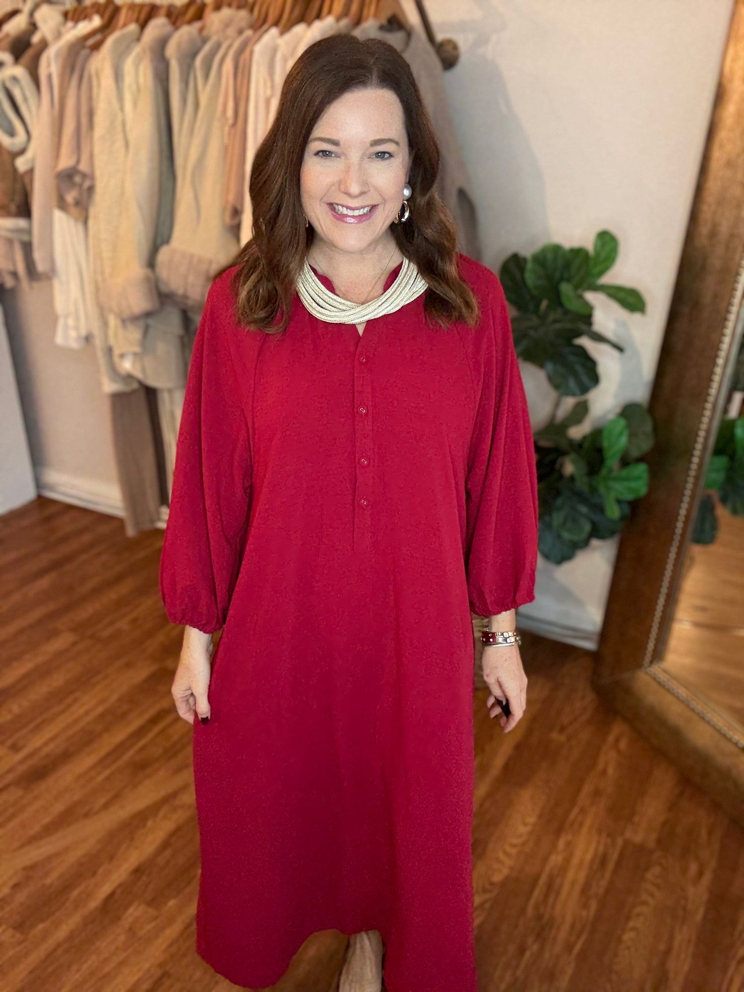 Embrace effortless elegance with the Cherished Moments Dress, a stunning ruby red piece designed for all-day comfort. The relaxed loose fit flatters every silhouette while allowing freedom of movement, making it perfect for everything from casual outings to weekend gatherings. Practical hidden pockets add functionality without compromising the dress's sophisticated aesthetic. This versatile wardrobe essential combines timeless style with modern convenience, ensuring you look and feel your best no matter where the day takes you. These have a slight amount of stretch and run generous in size. Candace is 5'4", size 6/8, bra 38c, and wearing a small.