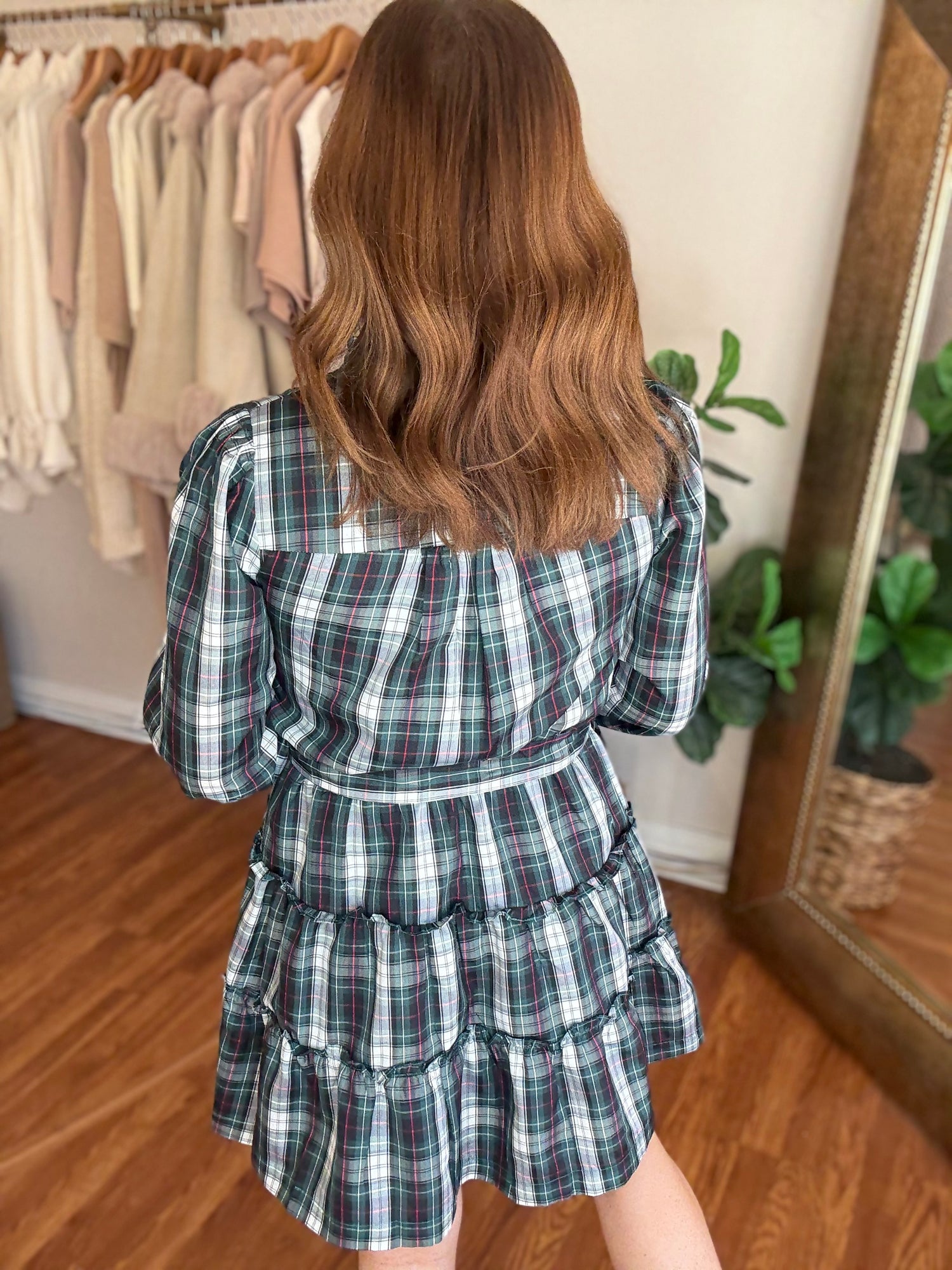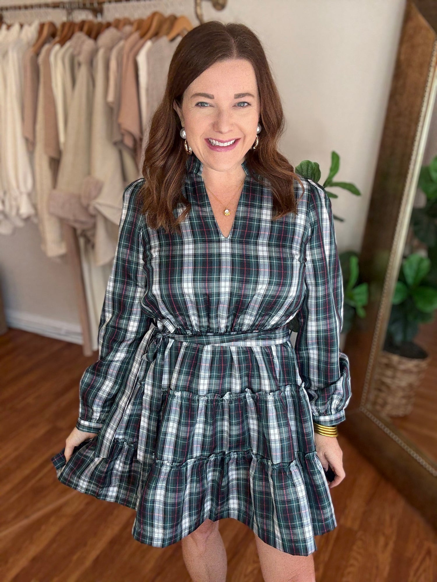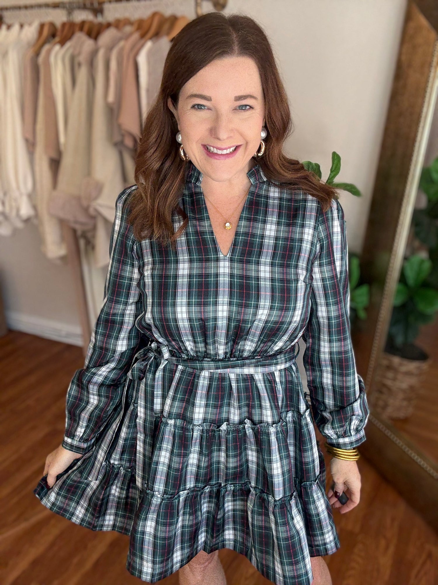 Get ready for the holiday season in style with our Home for the Holidays Dress! This dress features a classic tartan pattern that will make you stand out at any event. The tiered skirt adds a playful touch, while the pockets provide practicality. Make a statement and feel confident in this festive dress! These have no stretch and run true to size. Candace is 5’4”, size 6/8, bra 38c, and wearing a small.