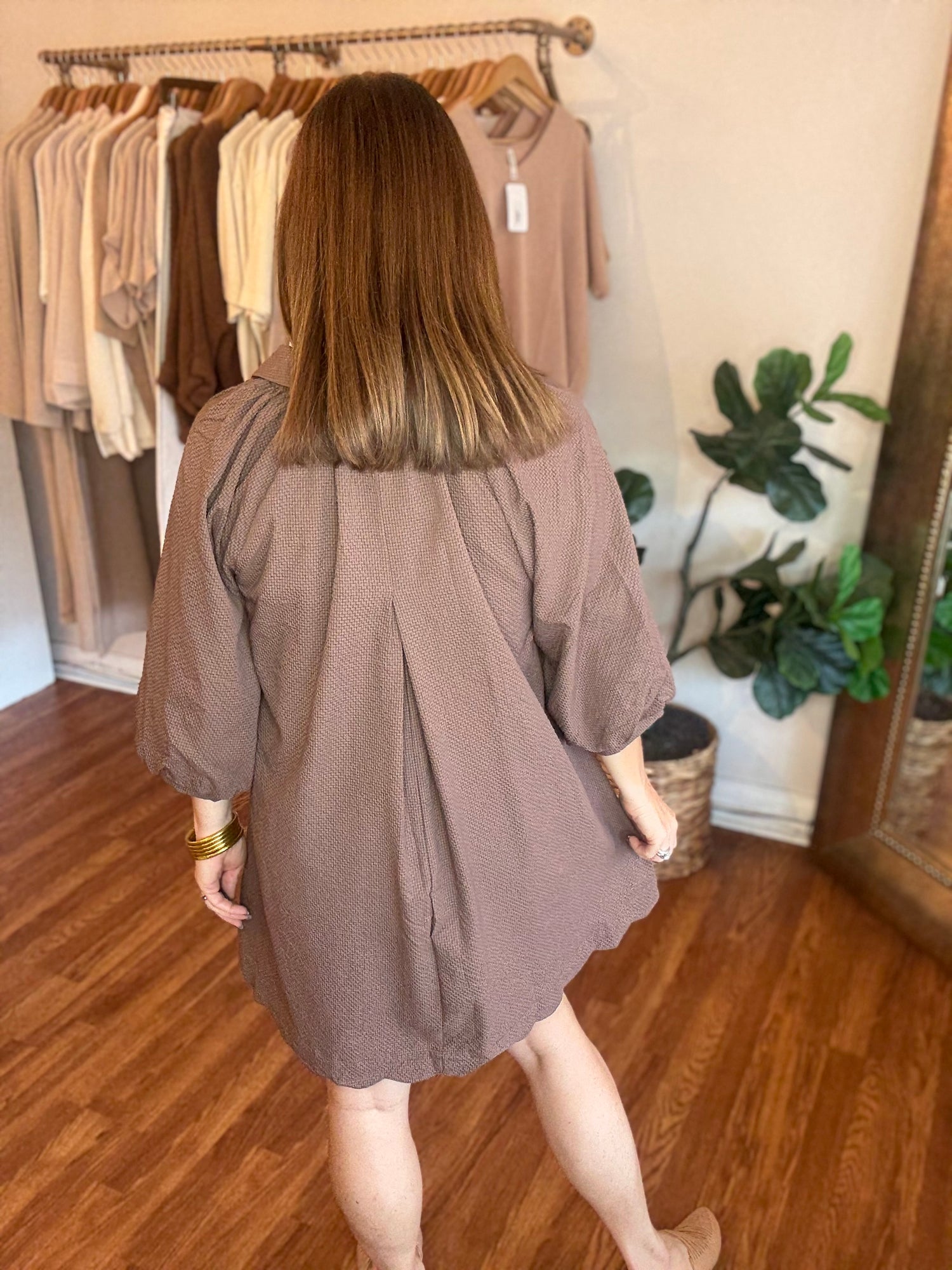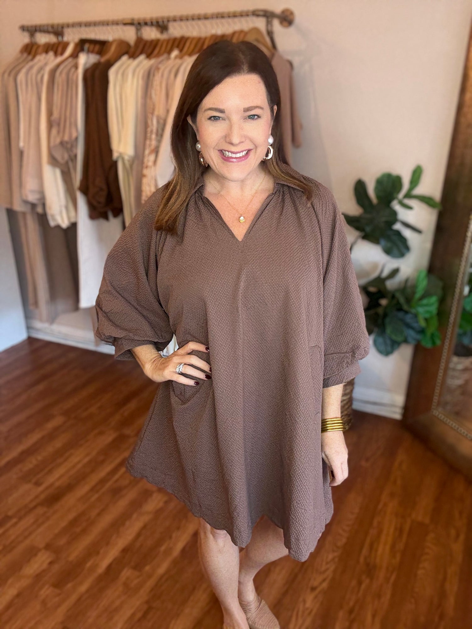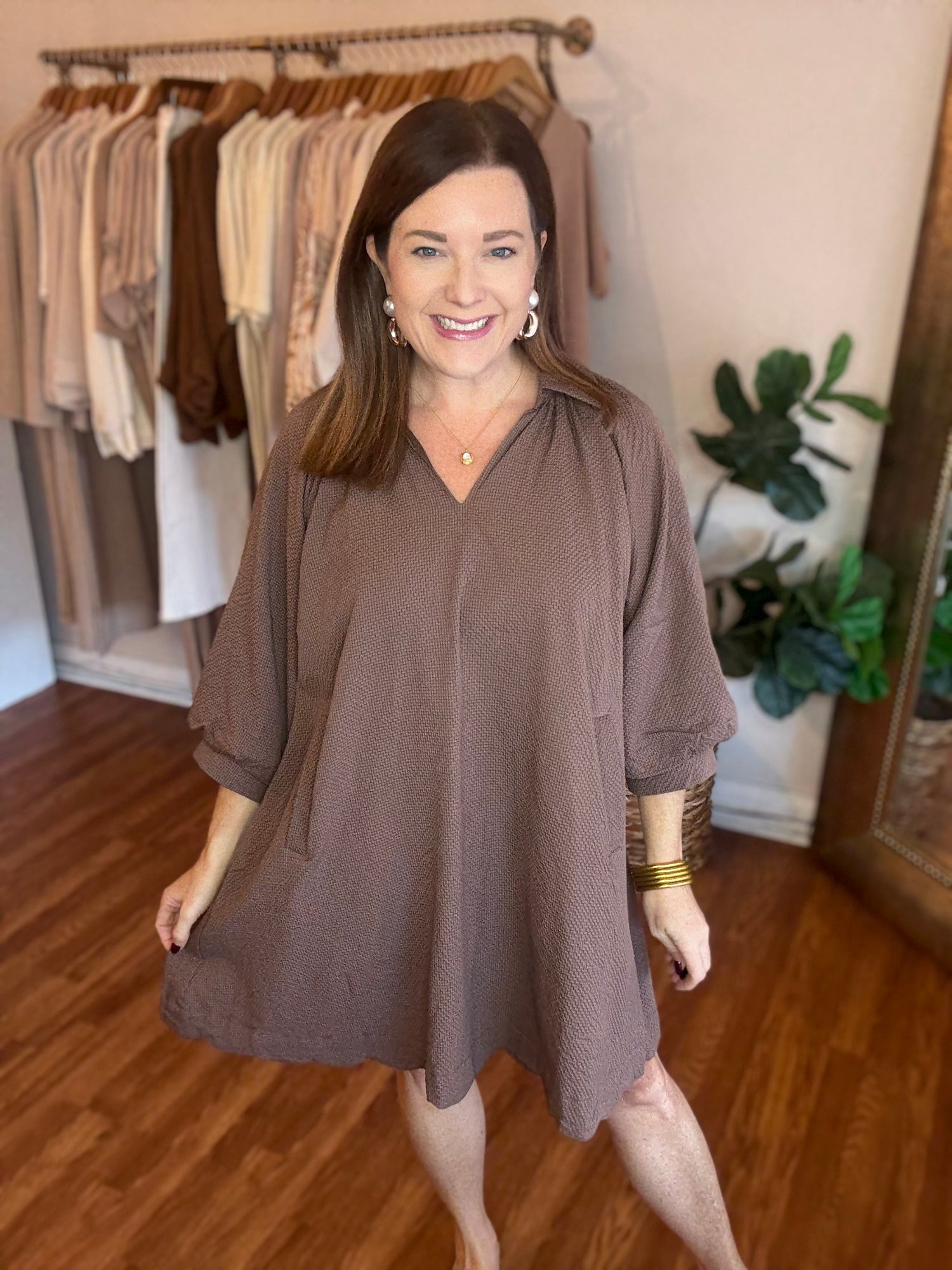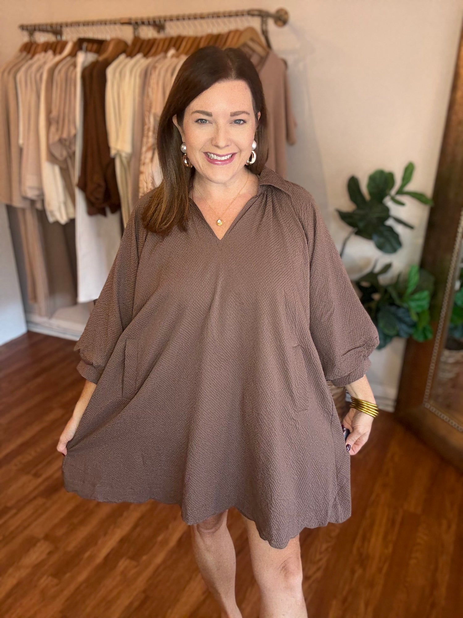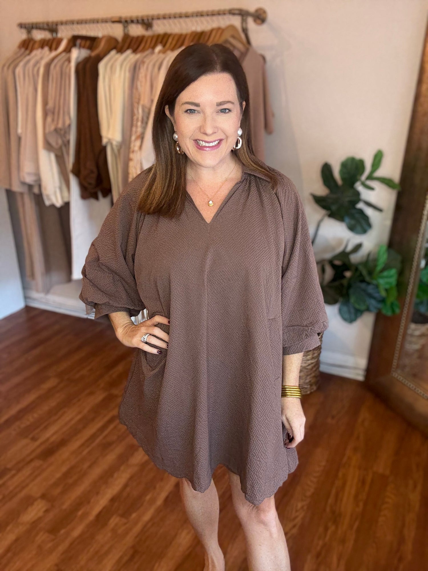 The On Your Time Dress is the perfect fall staple, boasting a rich, seasonal color that enhances your autumn wardrobe. Its scalloped hem adds a delicate, feminine finish, while the loose, oversized fit ensures comfort and effortless style. Equipped with handy pockets and a fully lined interior, this dress combines practicality with elegance—making it your go-to choice for cozy days and casual outings alike. These have no stretch and run generous in size. We recommend sizing down in this one. Candace is 5'4", size 6/8, bra 38c, and wearing a small.