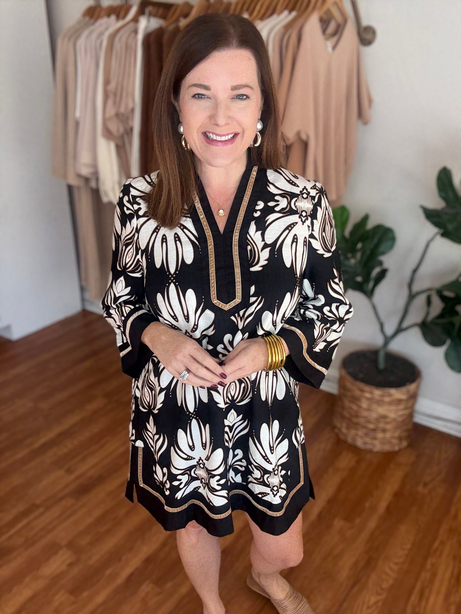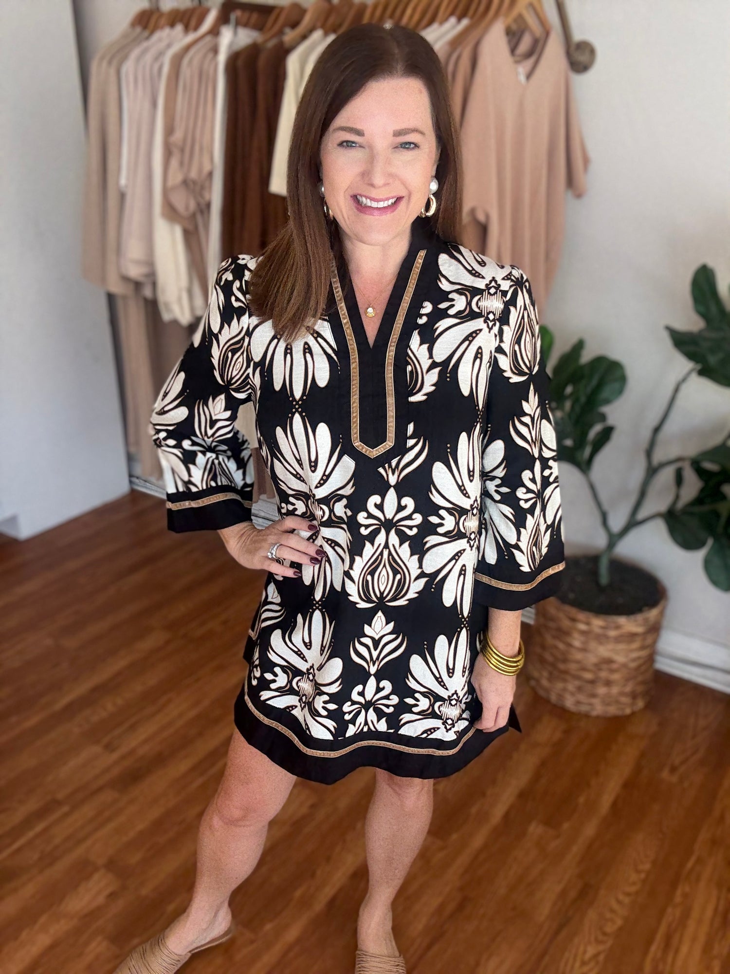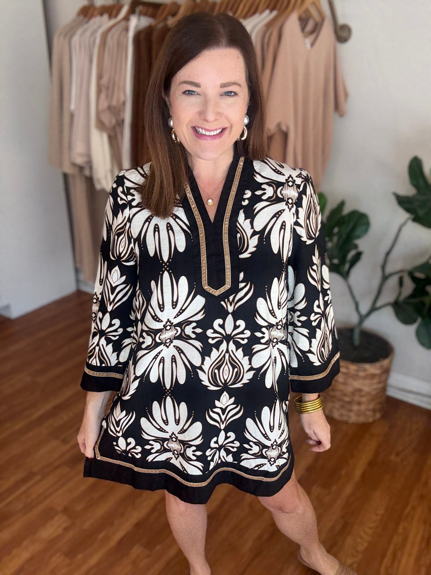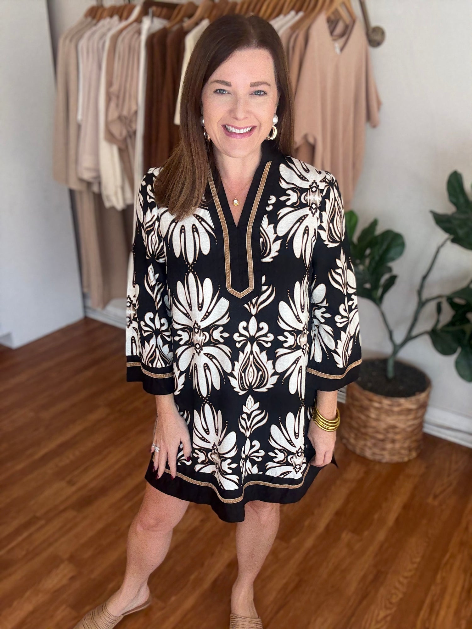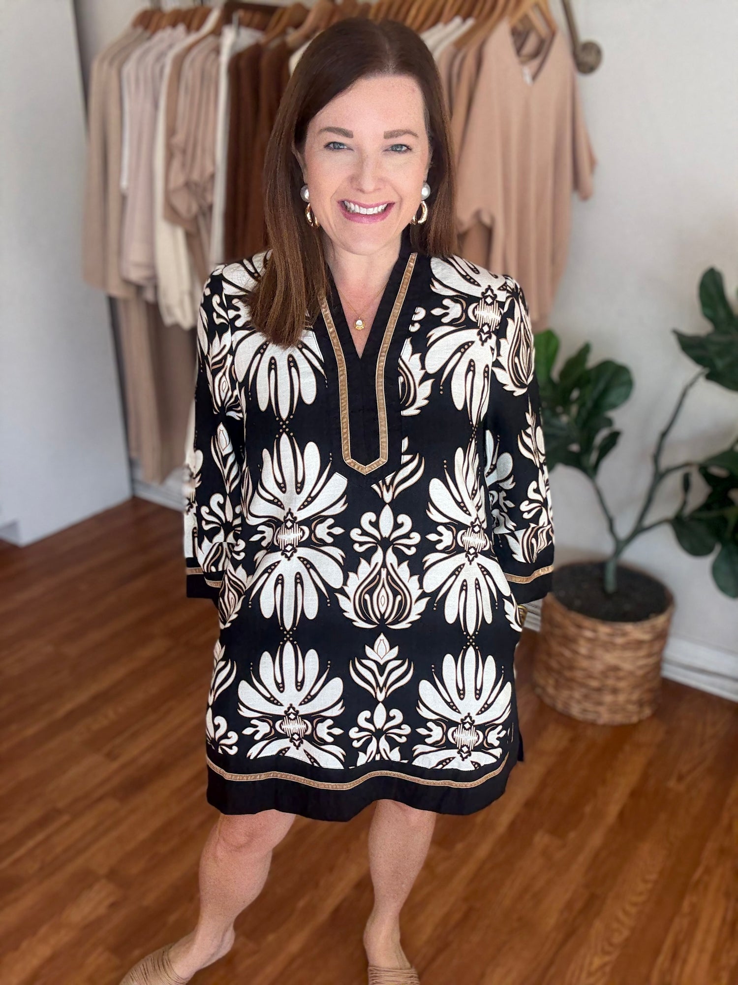 Step into timeless elegance with the You've Got Me Dress. This classic shift dress features a striking black and white print accented by contrasting trim, creating a refined and polished look. Thoughtfully designed with pockets, it offers both style and functionality, making it perfect for any occasion where confidence and sophistication matter. These have no stretch and run to size. Candace is 5'4", size 6/8, bra 38c, and wearing a small.