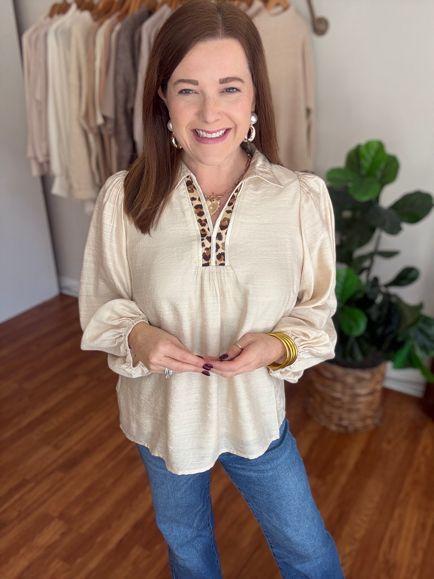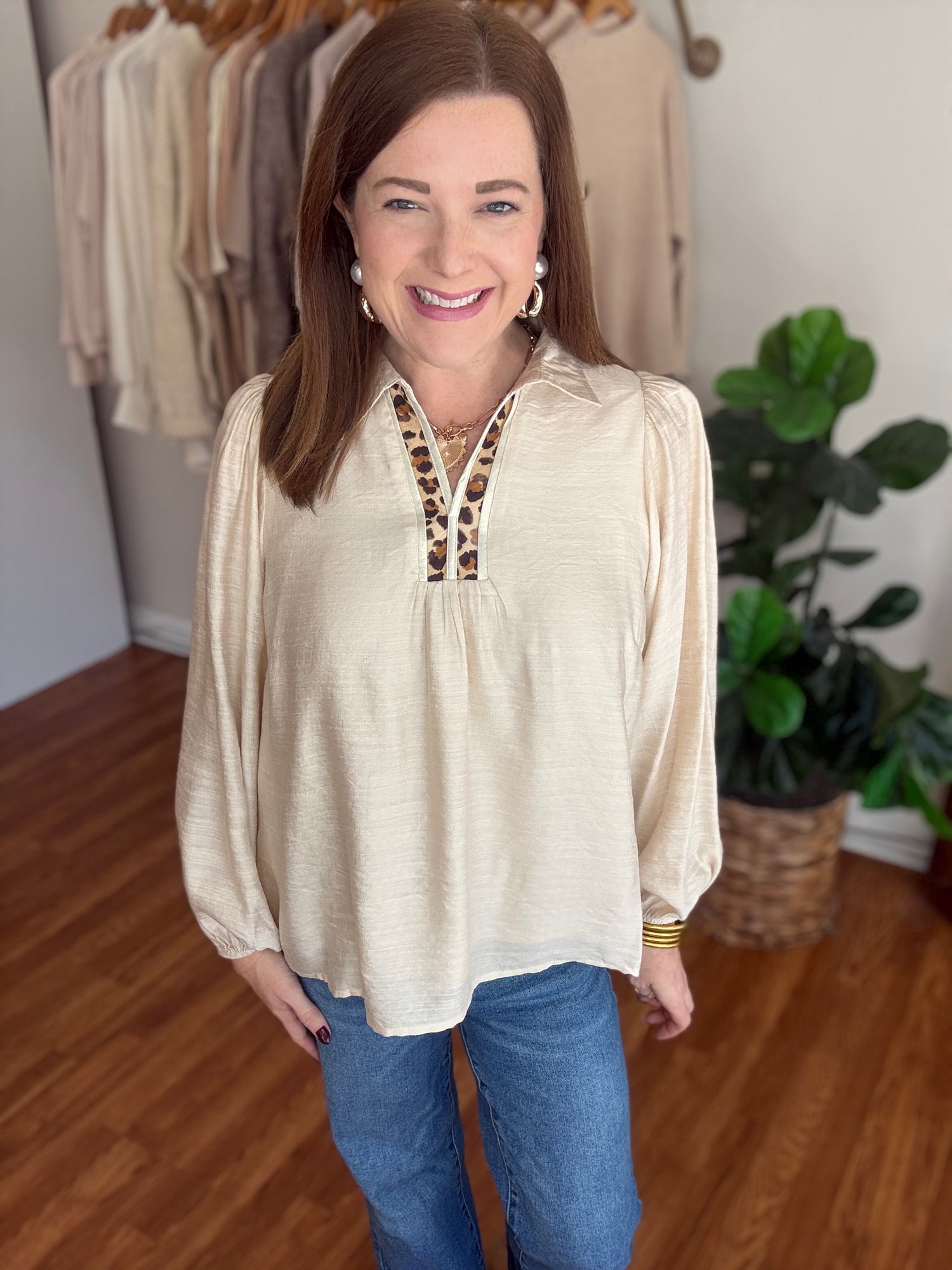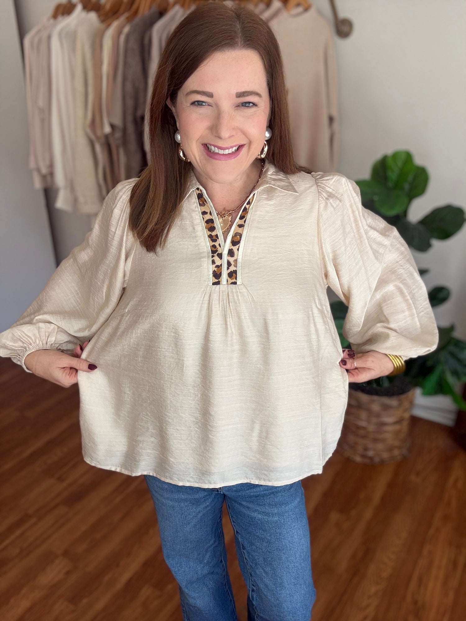 Classic cream color with animal print trim detailV-neckCollarLoose, flowy fit