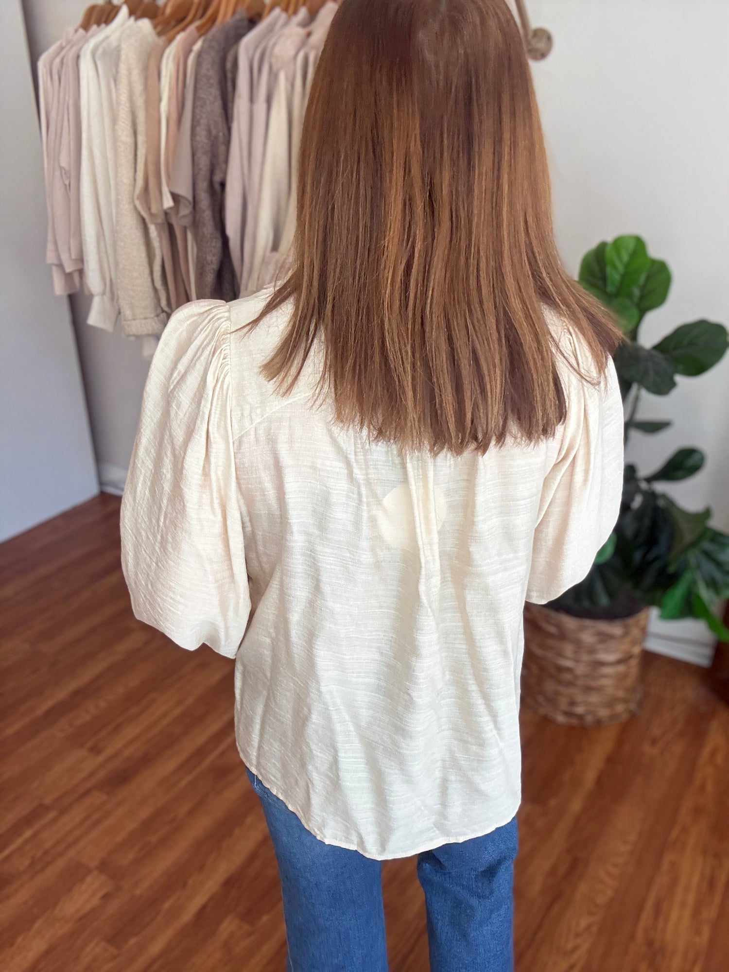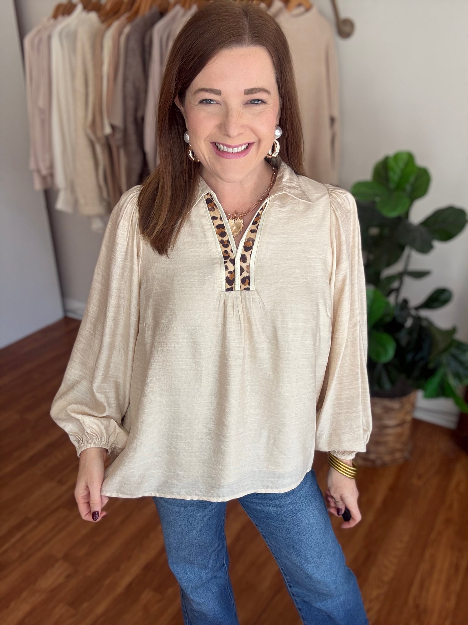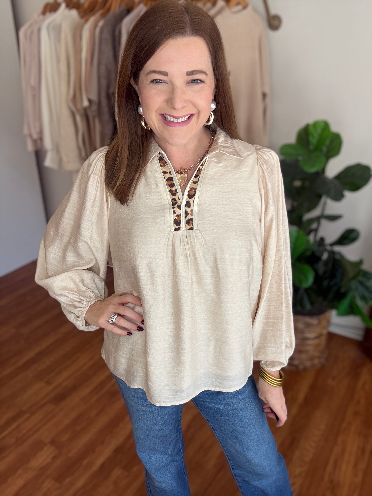 Classic cream color with animal print trim detailV-neckCollarLoose, flowy fit