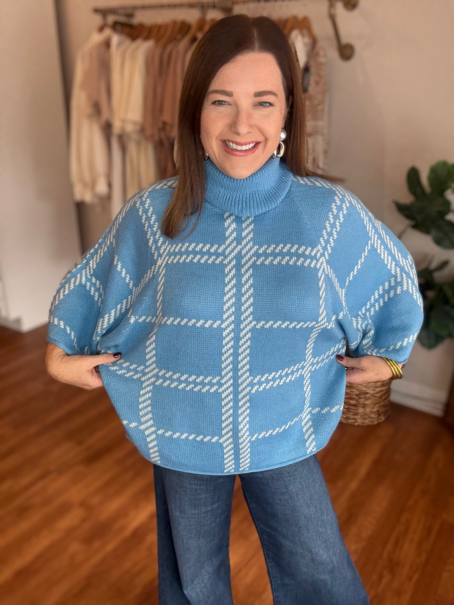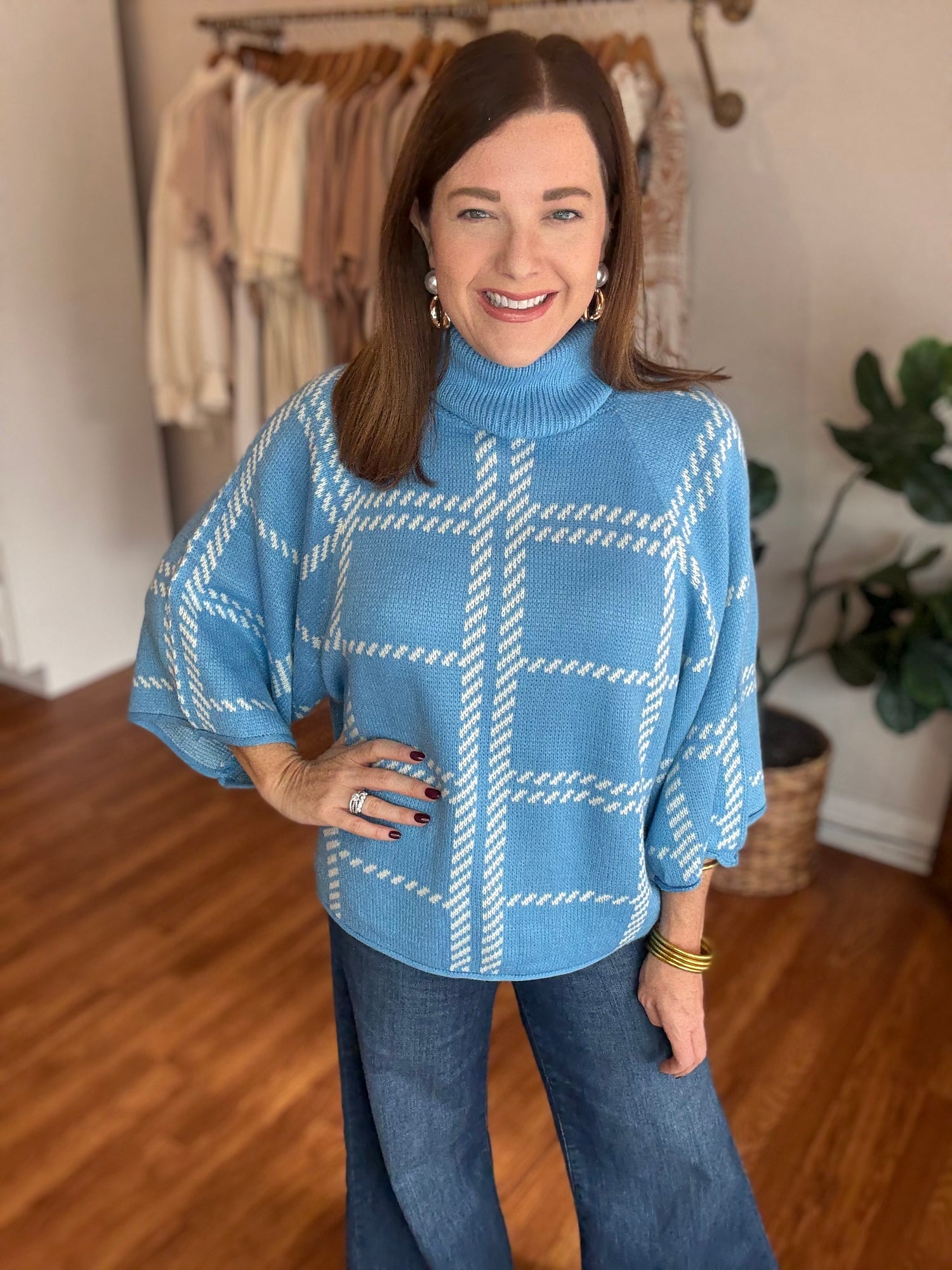 The A Little Love for You Sweater combines cozy comfort with a pretty blue and white plaid print. Featuring 3/4 loose sleeves and an oversized fit, it’s perfect for layering and effortless everyday style. Candace is 5'4", size 6/8, bra 38c, and wearing a small.