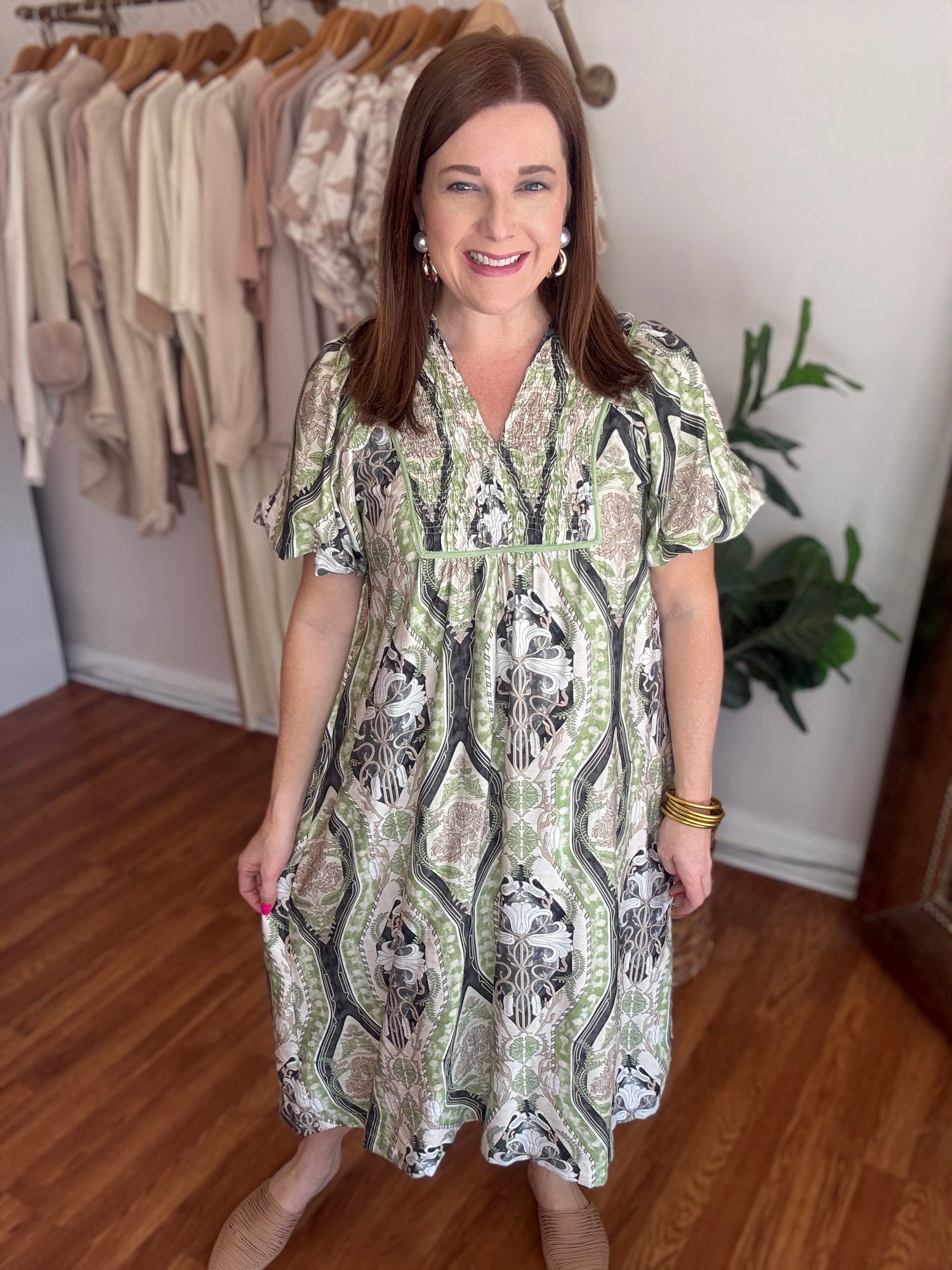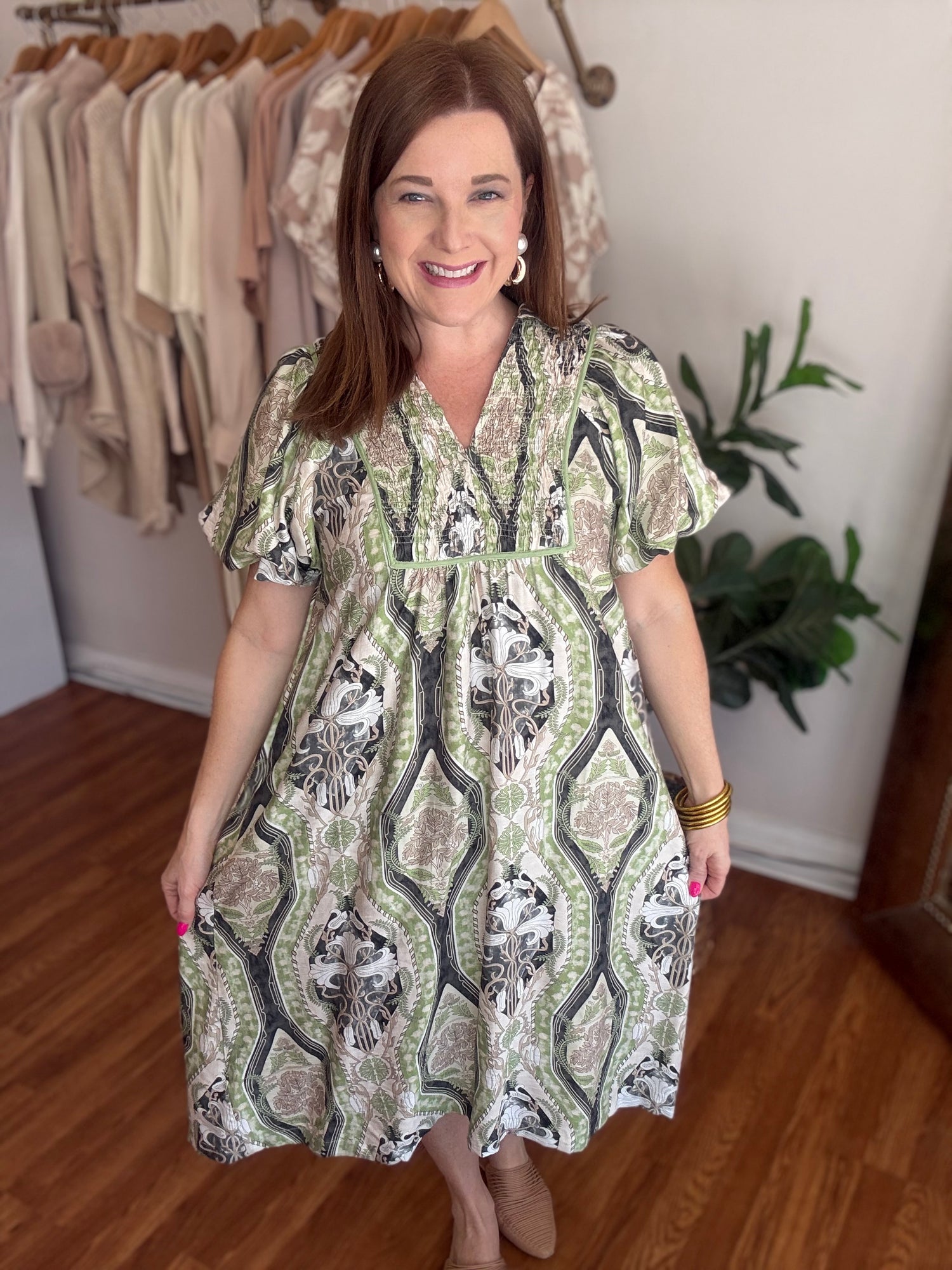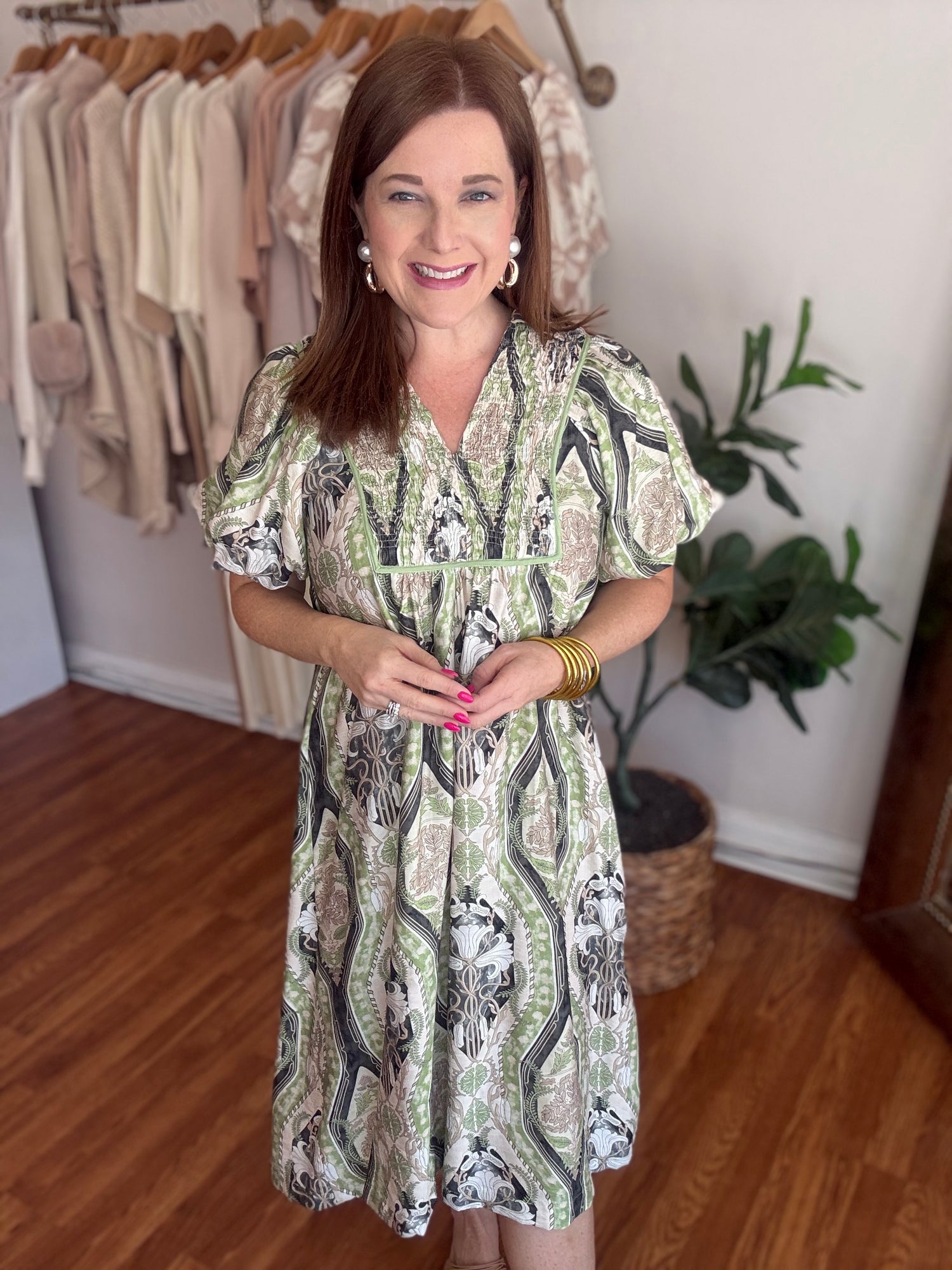 Elevate your wardrobe with the As Time Flies Dress, a captivating midi piece that seamlessly blends artistic flair with refined elegance. The eye-catching abstract print draws admiration while the flattering v-neck creates a graceful silhouette. Discover the charm of the smocked yoke detail, which adds texture and dimension, while contrasting piping traces the seams for a polished finish. Short balloon sleeves provide a playful touch that balances sophistication with contemporary style. Perfect for brunch dates, garden parties, or any occasion where you want to make a memorable impression. These have no stretch and run true to size. Candace is 5'4", size 6/8, bra 38c, and wearing a small.