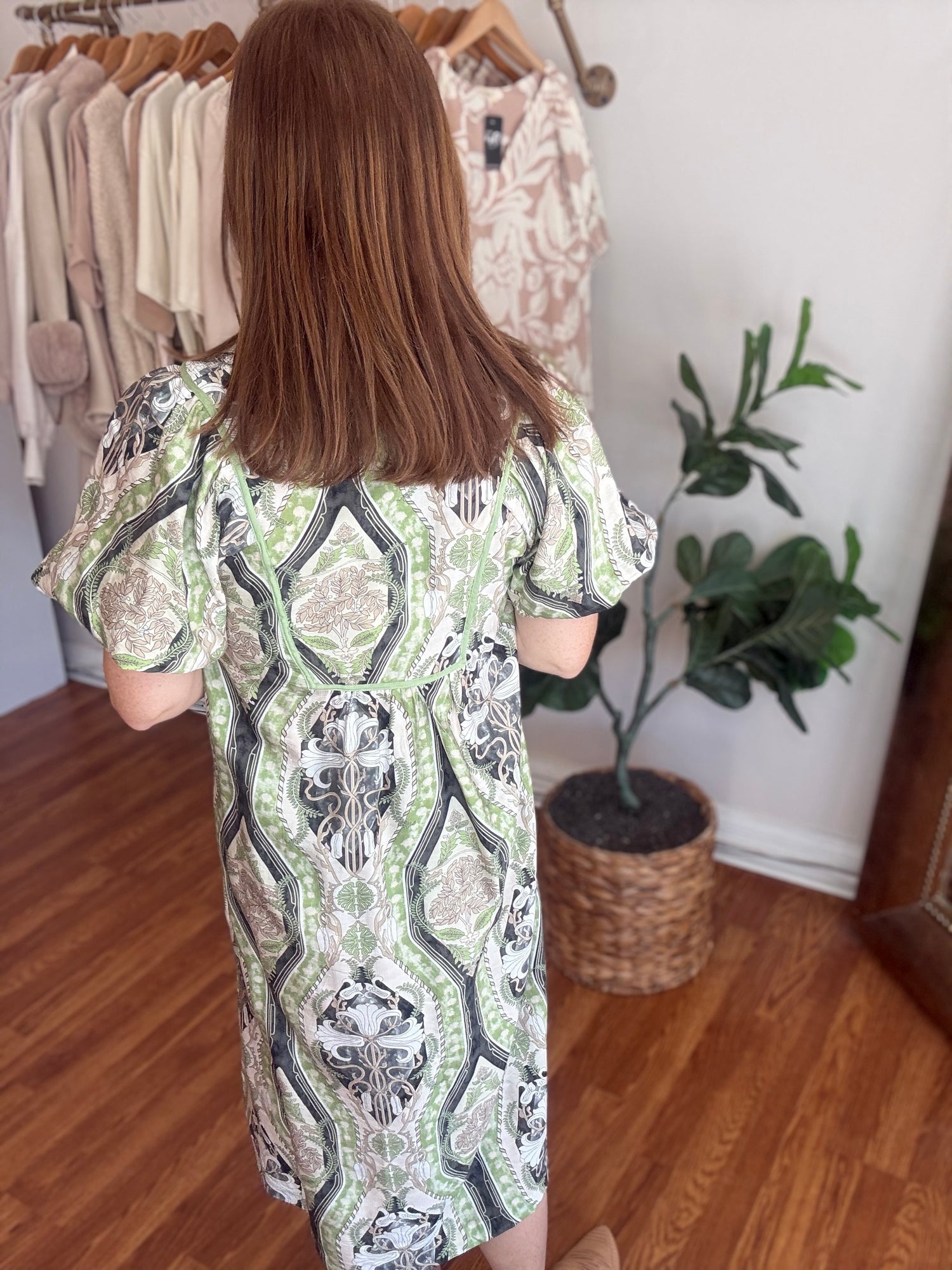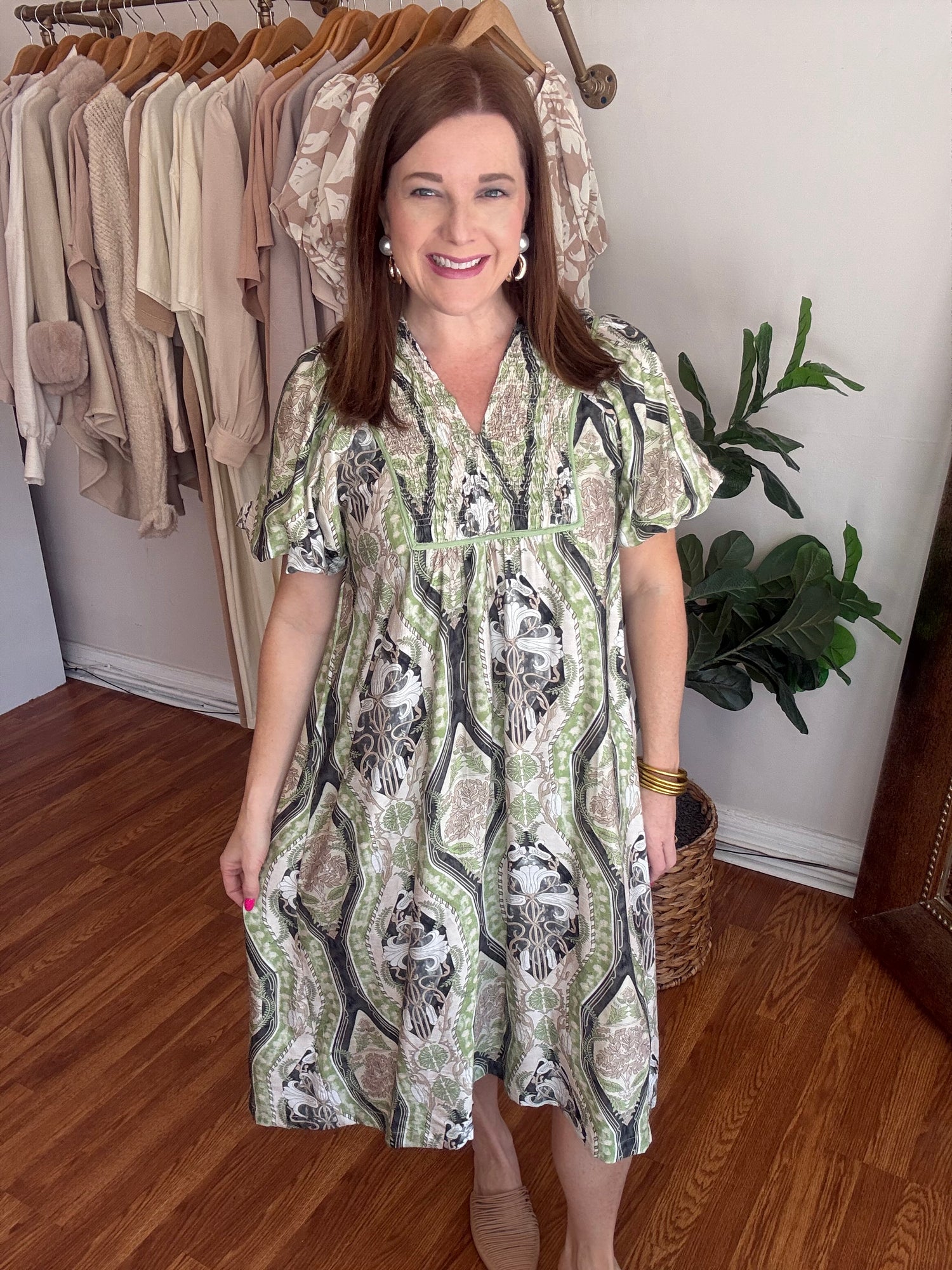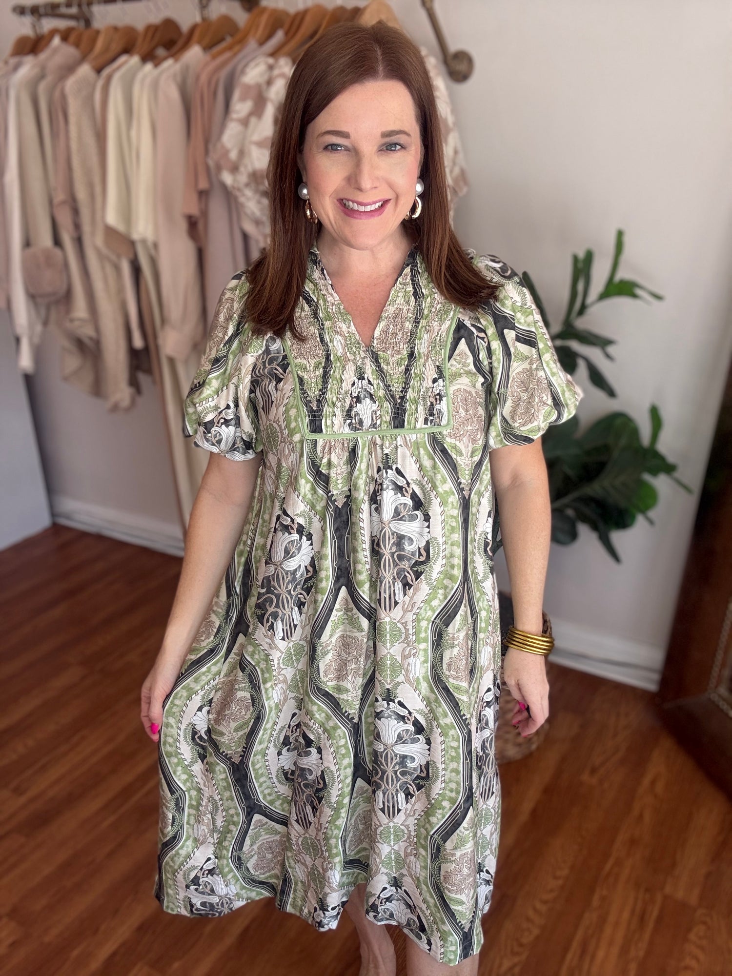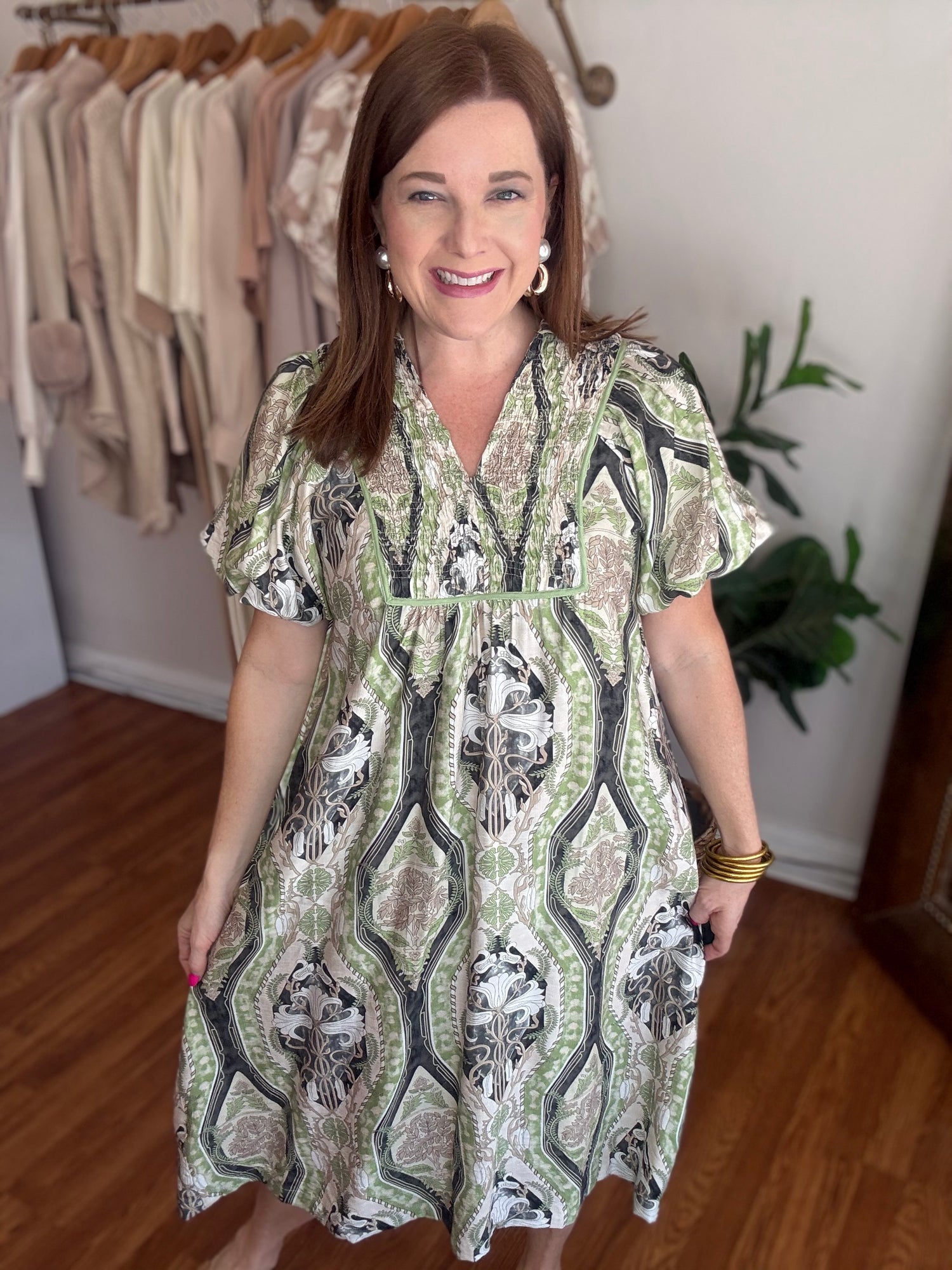Elevate your wardrobe with the As Time Flies Dress, a captivating midi piece that seamlessly blends artistic flair with refined elegance. The eye-catching abstract print draws admiration while the flattering v-neck creates a graceful silhouette. Discover the charm of the smocked yoke detail, which adds texture and dimension, while contrasting piping traces the seams for a polished finish. Short balloon sleeves provide a playful touch that balances sophistication with contemporary style. Perfect for brunch dates, garden parties, or any occasion where you want to make a memorable impression. These have no stretch and run true to size. Candace is 5'4", size 6/8, bra 38c, and wearing a small.