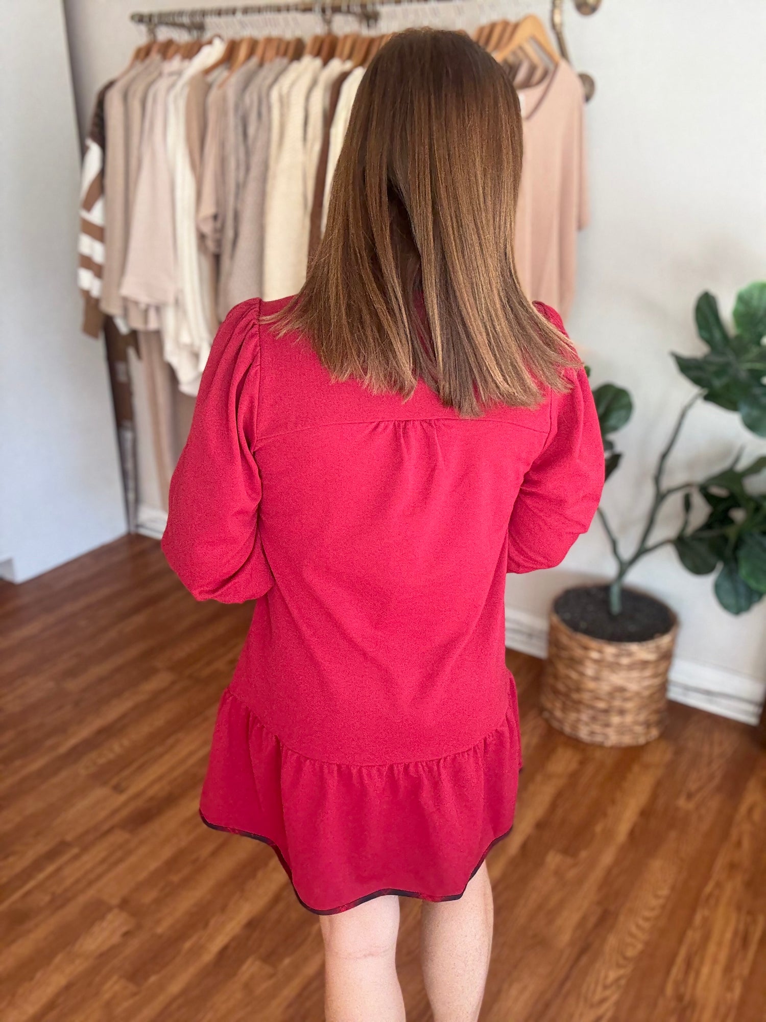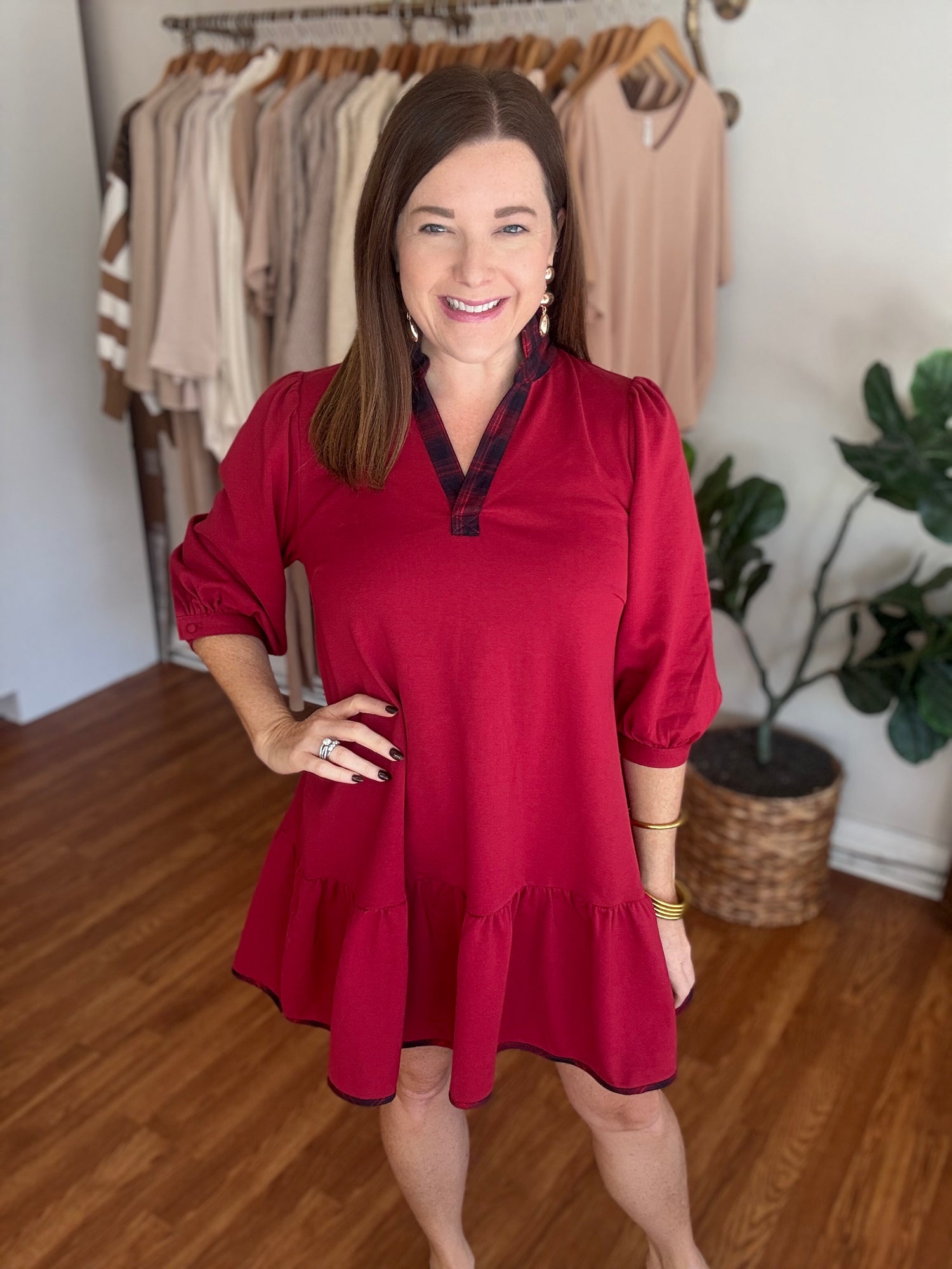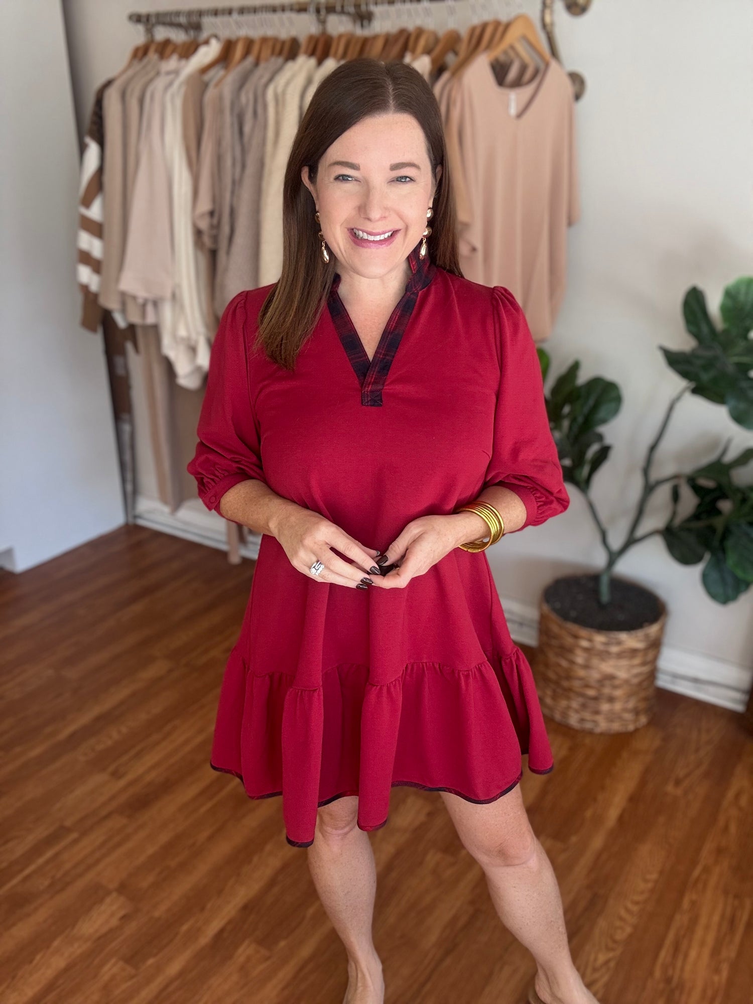 The Back to You Dress in a rich, gorgeous red is perfect for the holiday’s cozy vibes. It features stylish plaid trim that adds subtle flair, while the straight silhouette skims the body gracefully. Finished with a playful ruffle bottom and made from stretchy knit fabric, this dress blends comfort with chic sophistication for your seasonal wardrobe. These run true to size. Candace is 5'4", size 6/8, bra 38c, and wearing a small.