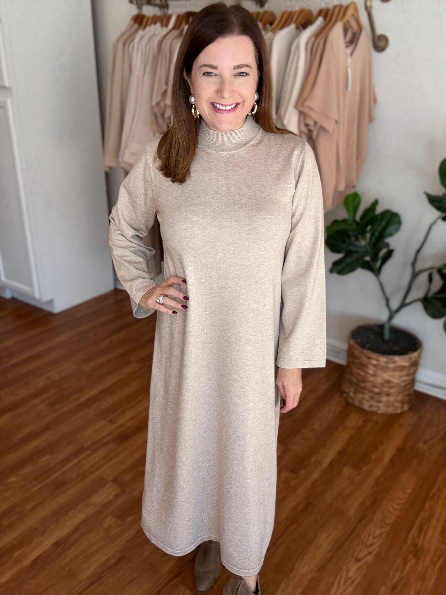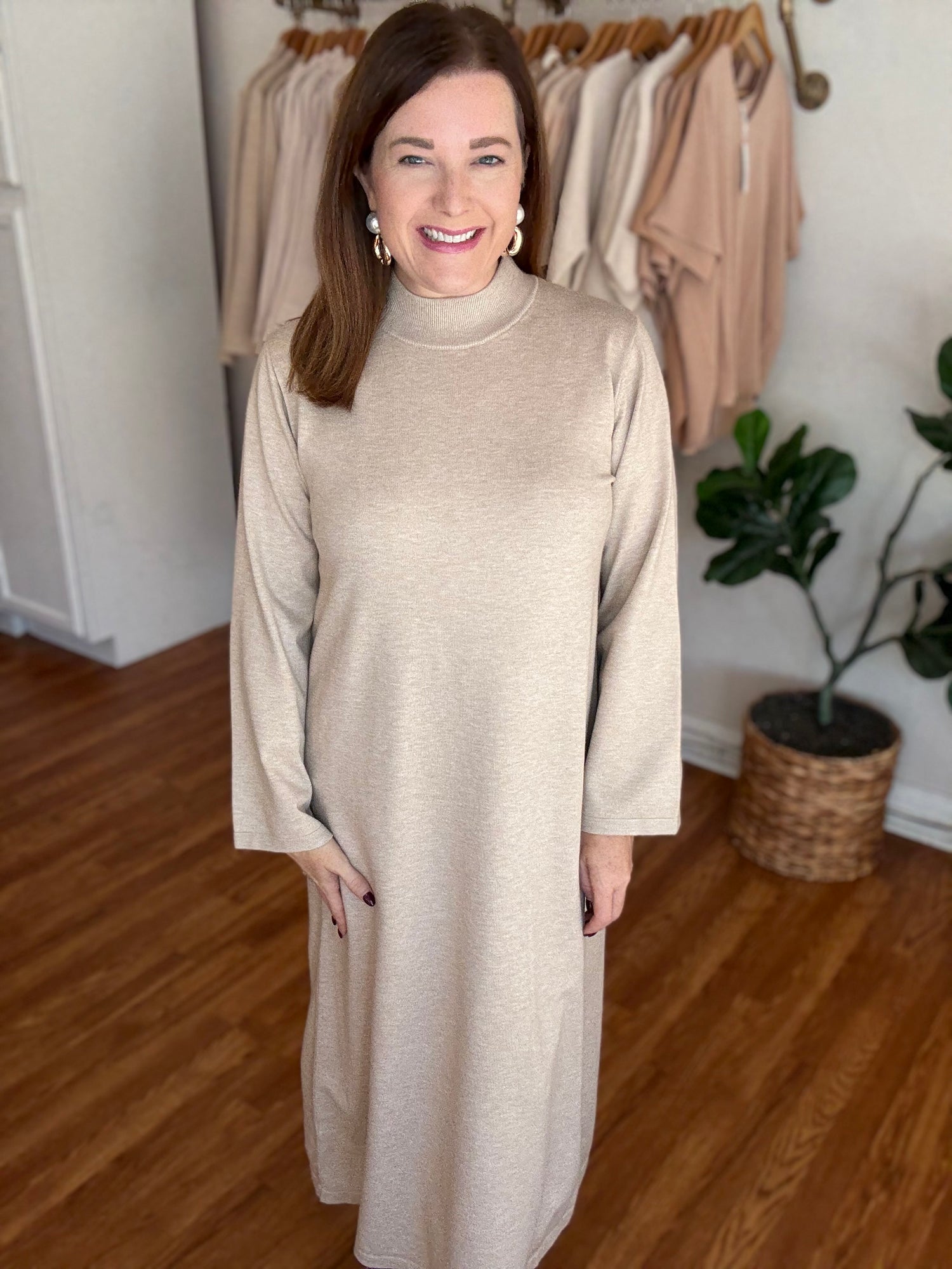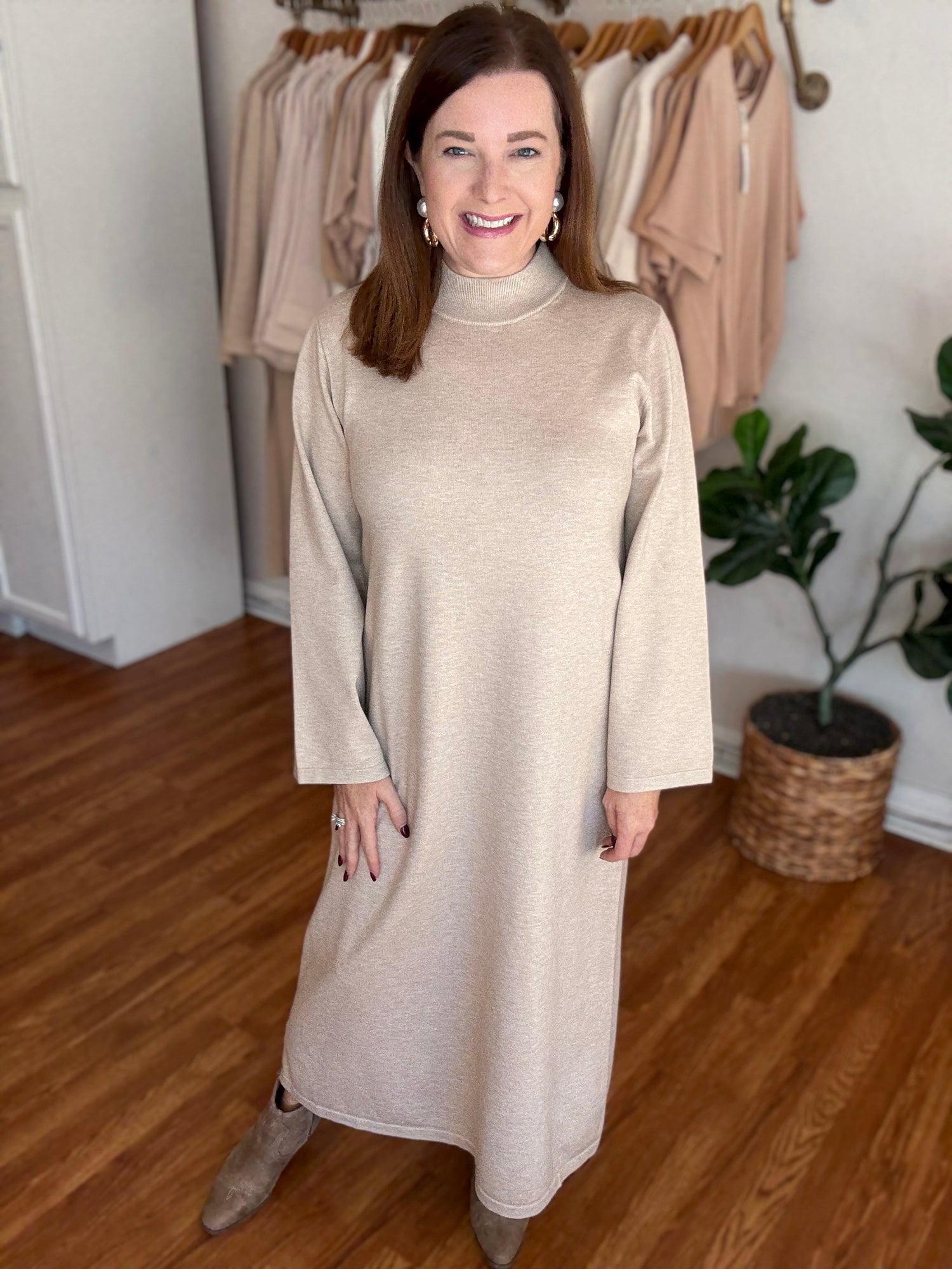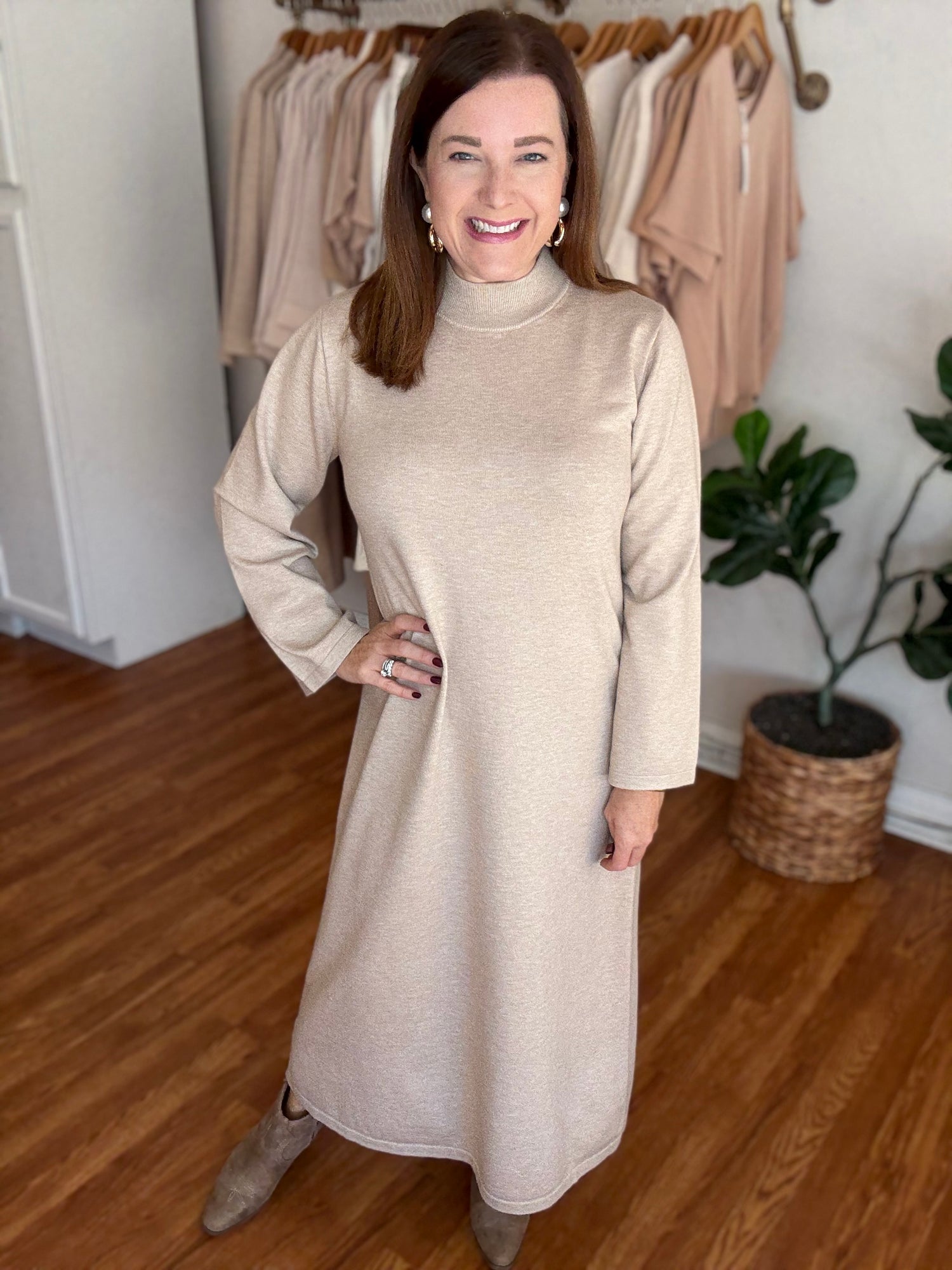 The Better Thank You Know Dress combines timeless elegance with effortless comfort. Its straight, relaxed fit and loose sleeves offer a flattering silhouette and freedom of movement. The classic mock neck adds a touch of sophistication, making this sweater midi dress perfect for both casual days and dressier occasions. Embrace cozy style without sacrificing grace in this versatile wardrobe staple. These are a soft, stretchy sweater knit and run true to size. Candace is 5'4", size 6/8, bra 38c, and wearing a small.