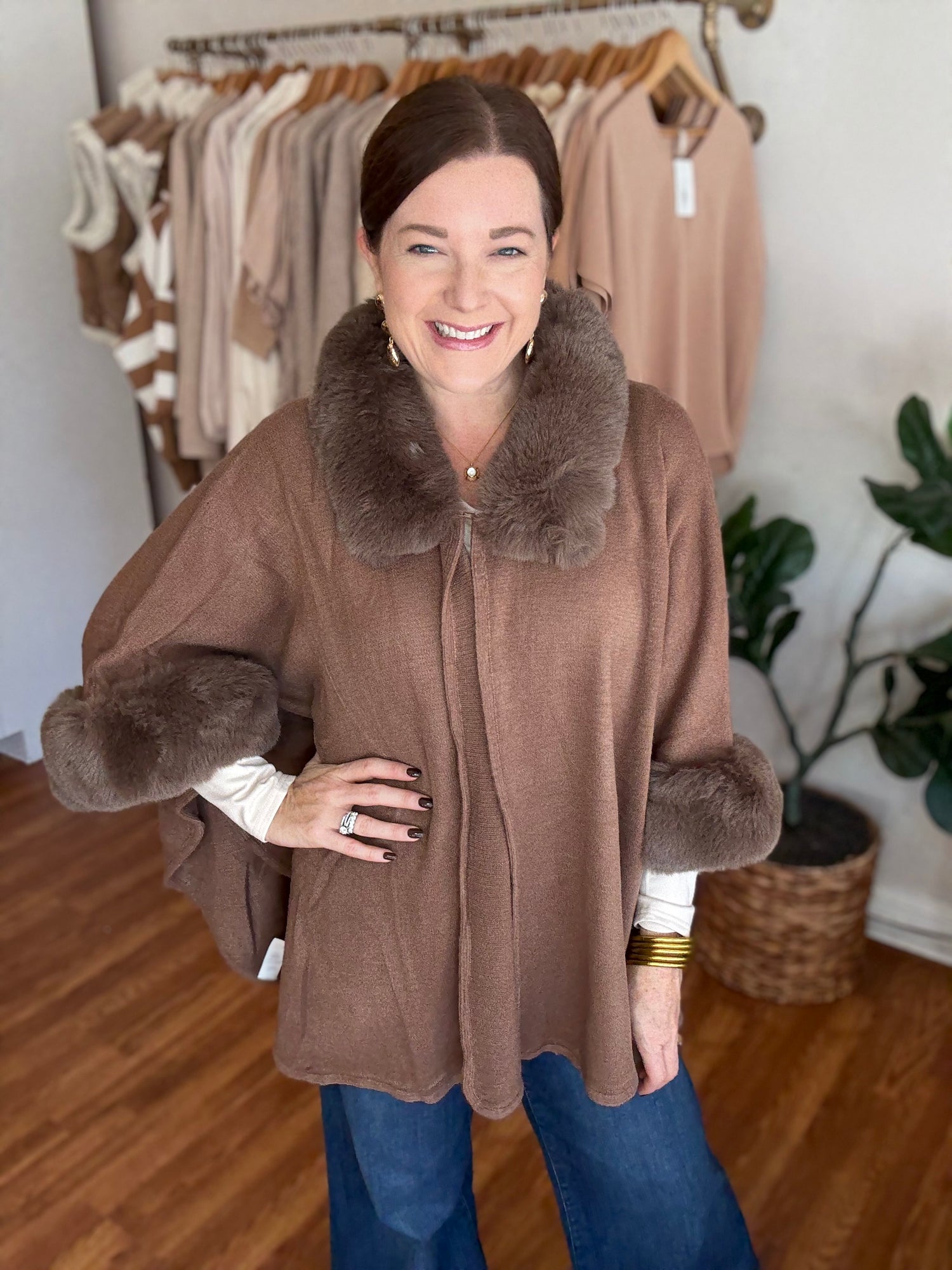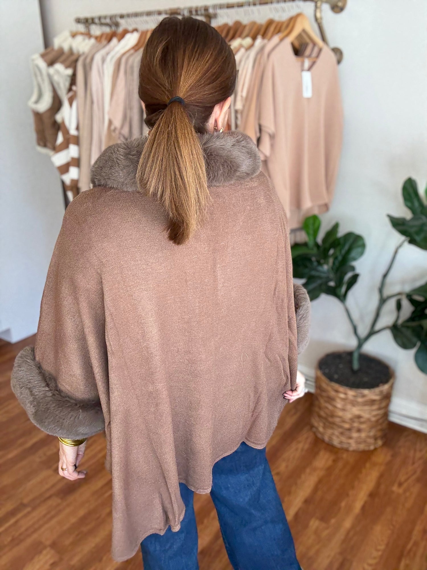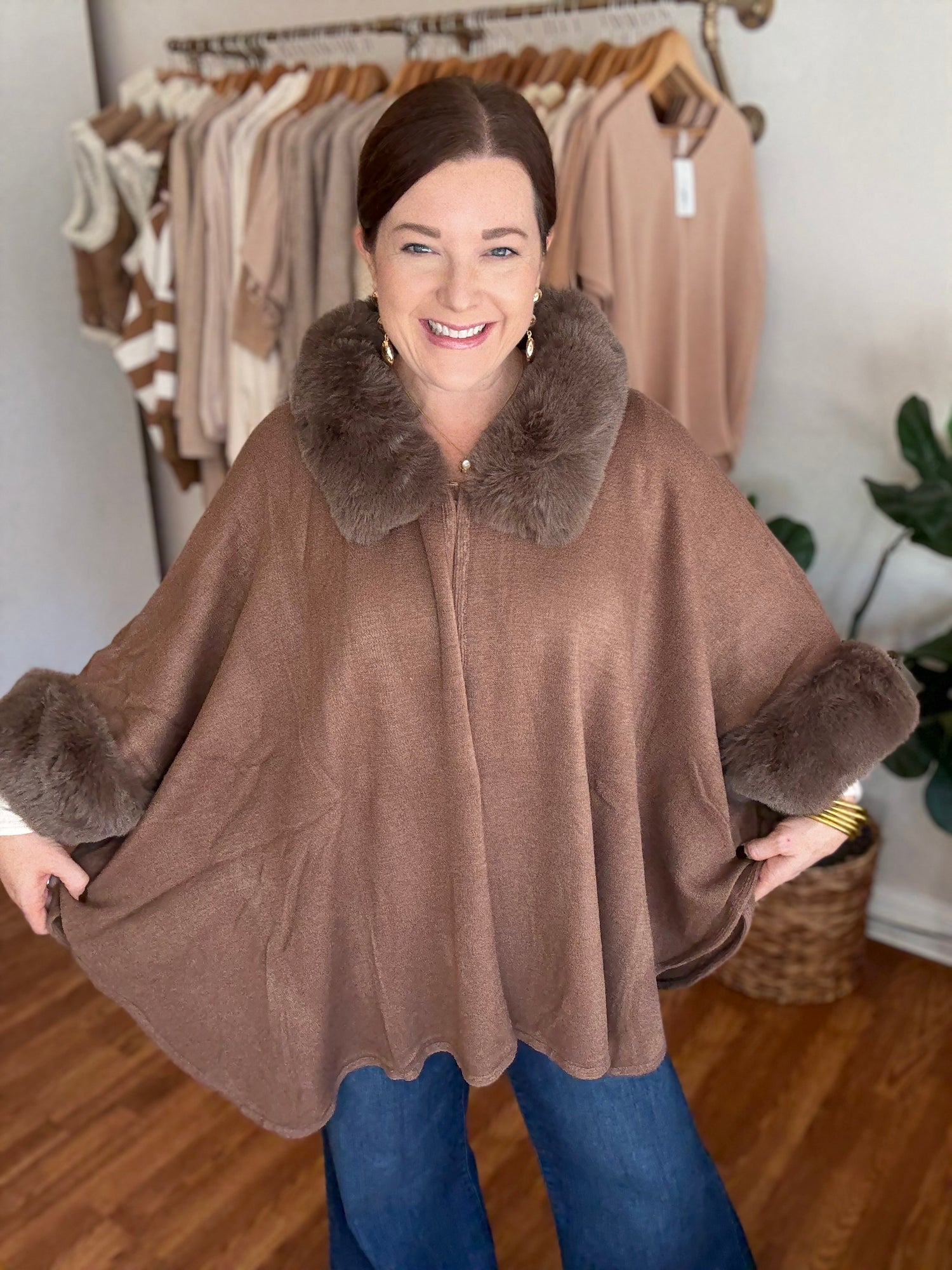 Stay warm and stylish this season with our Central Park Poncho in Mocha! This faux fur trimmed poncho is perfect for layering, adding a touch of luxury to any outfit. Stay cozy and on-trend with our versatile and chic poncho. These run generous in size. Candace is wearing a small/medium.