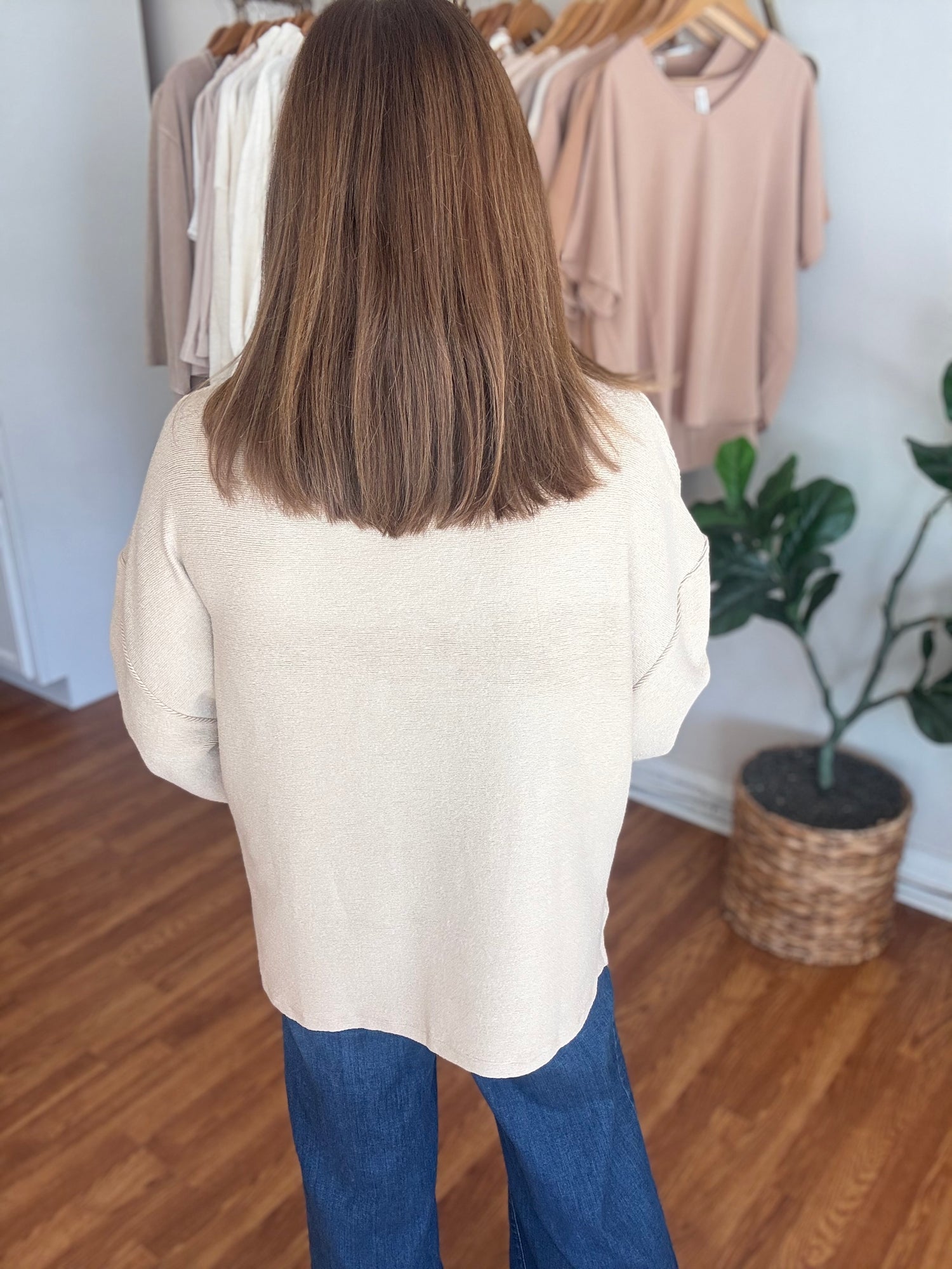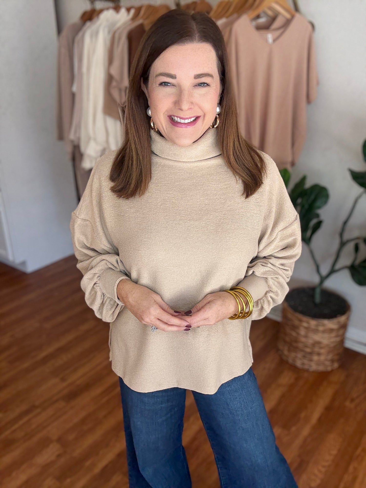 Experience effortless style and comfort with the Cloud Nine Top. It's loose fit and mock neck create a relaxed yet refined silhouette, while the balloon sleeves add a trendy, voluminous touch. Crafted from soft, ribbed knit fabric, this top offers cozy warmth and a flattering textured finish perfect for any season. Elevate your wardrobe with this versatile piece that combines fashion and comfort seamlessly. These are a soft, stretchy knit and run generous in size. Candace is 5'4", size 6/8, bra 38c, and wearing a small.