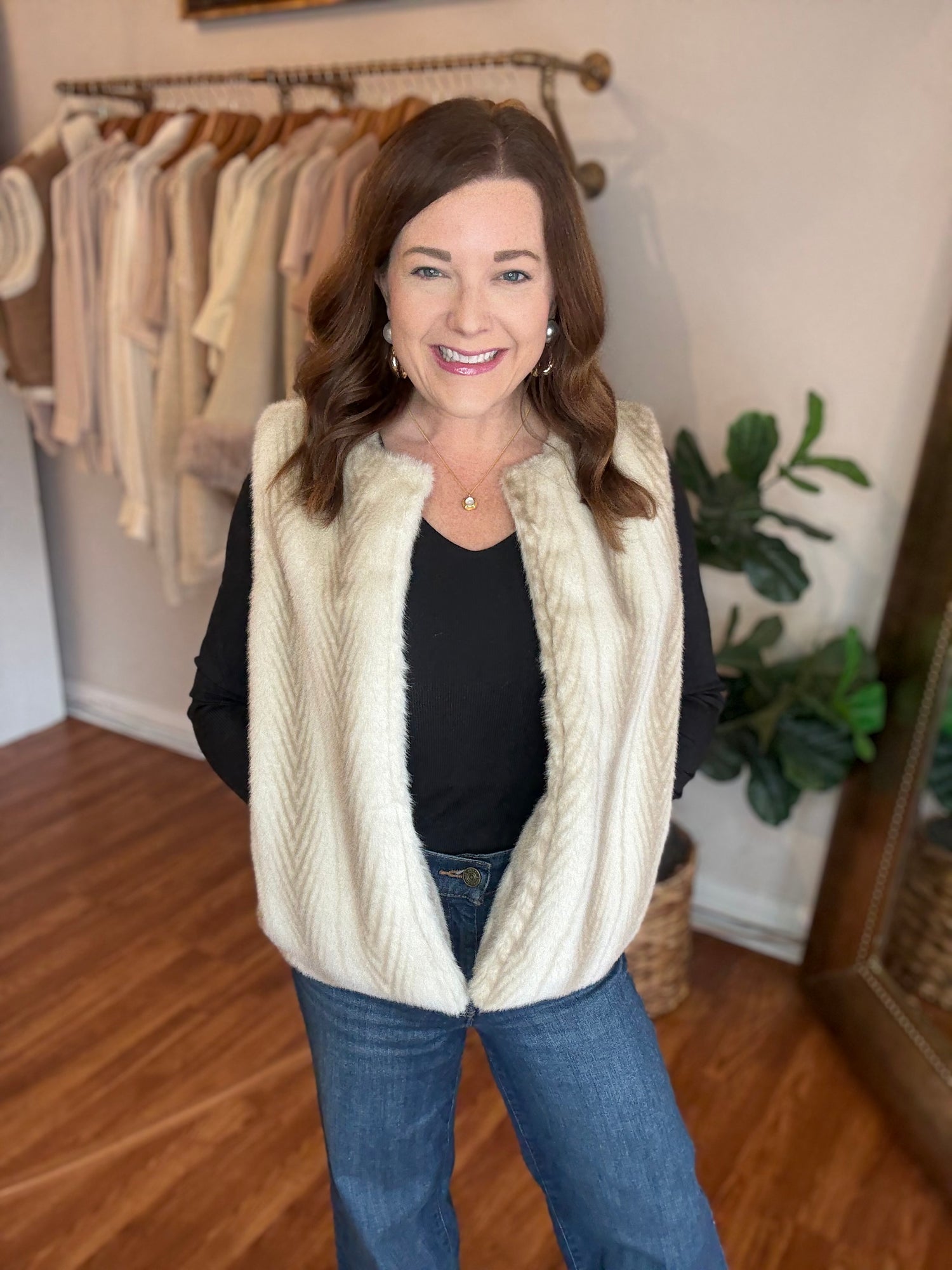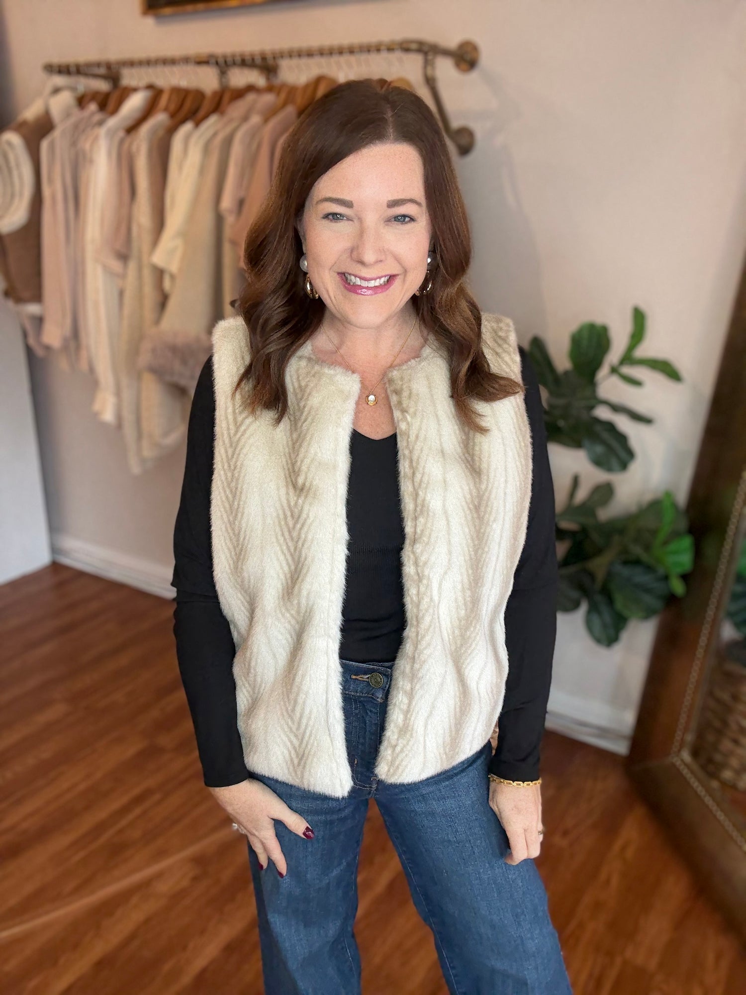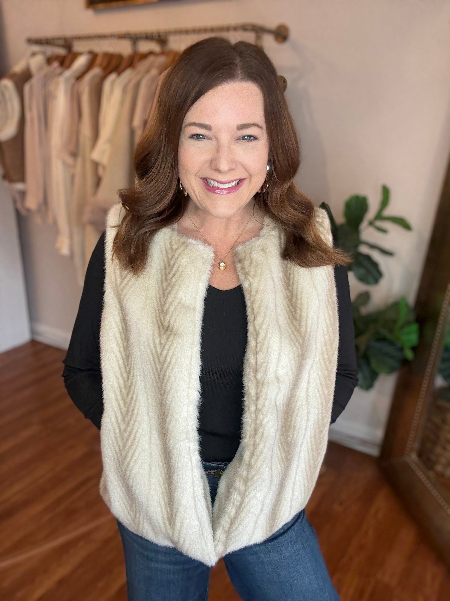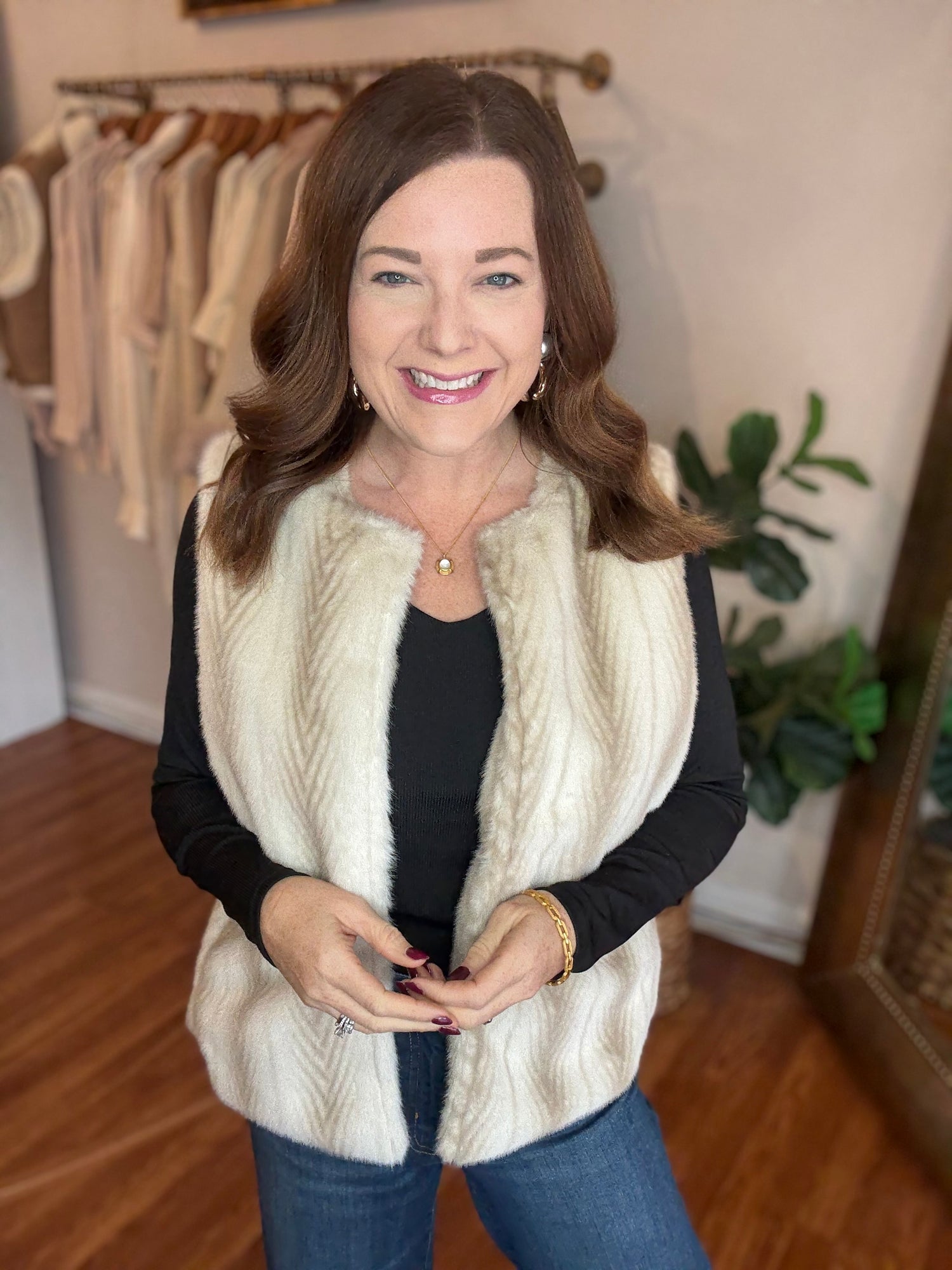 Introducing the Deserve it All Vest - a luxurious faux fur vest that adds a touch of elegance to any outfit. With its loose fit and neutral colors, it's a versatile piece that can be dressed up or down. Plus, with pockets for convenience, you truly can have it all with this must-have addition to your wardrobe! These run true to size. Candace is wearing a small.