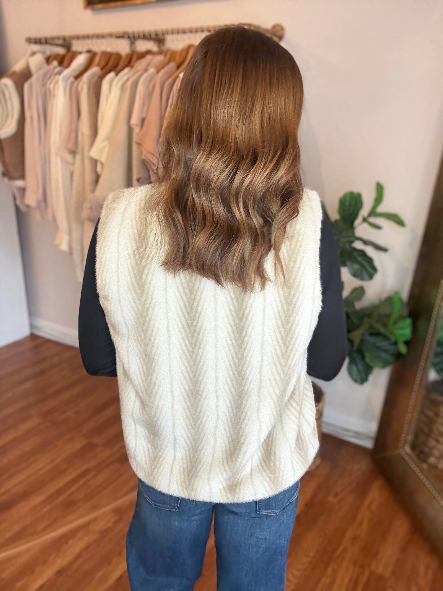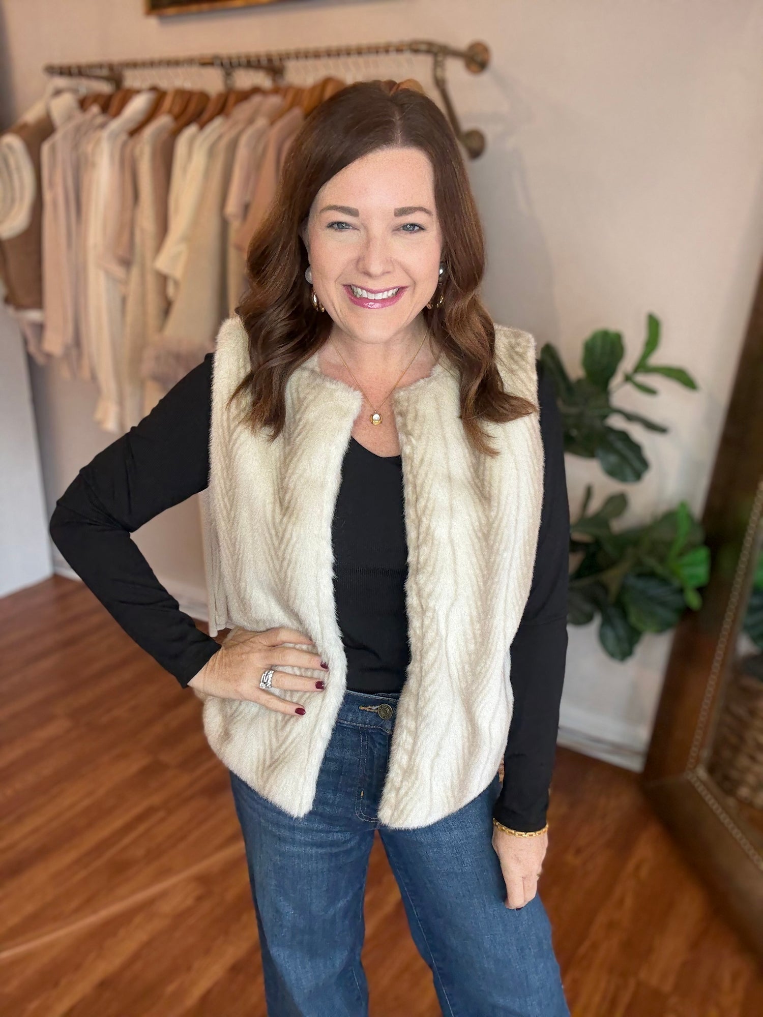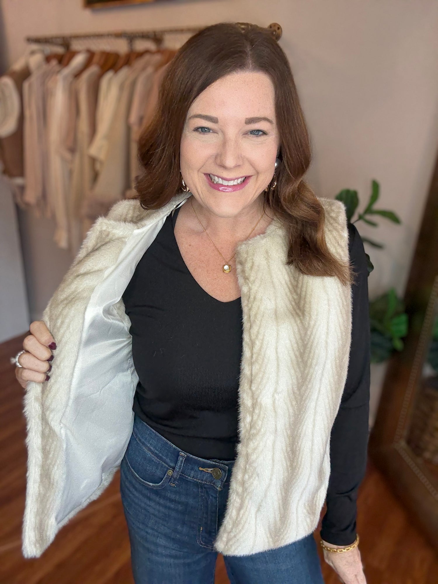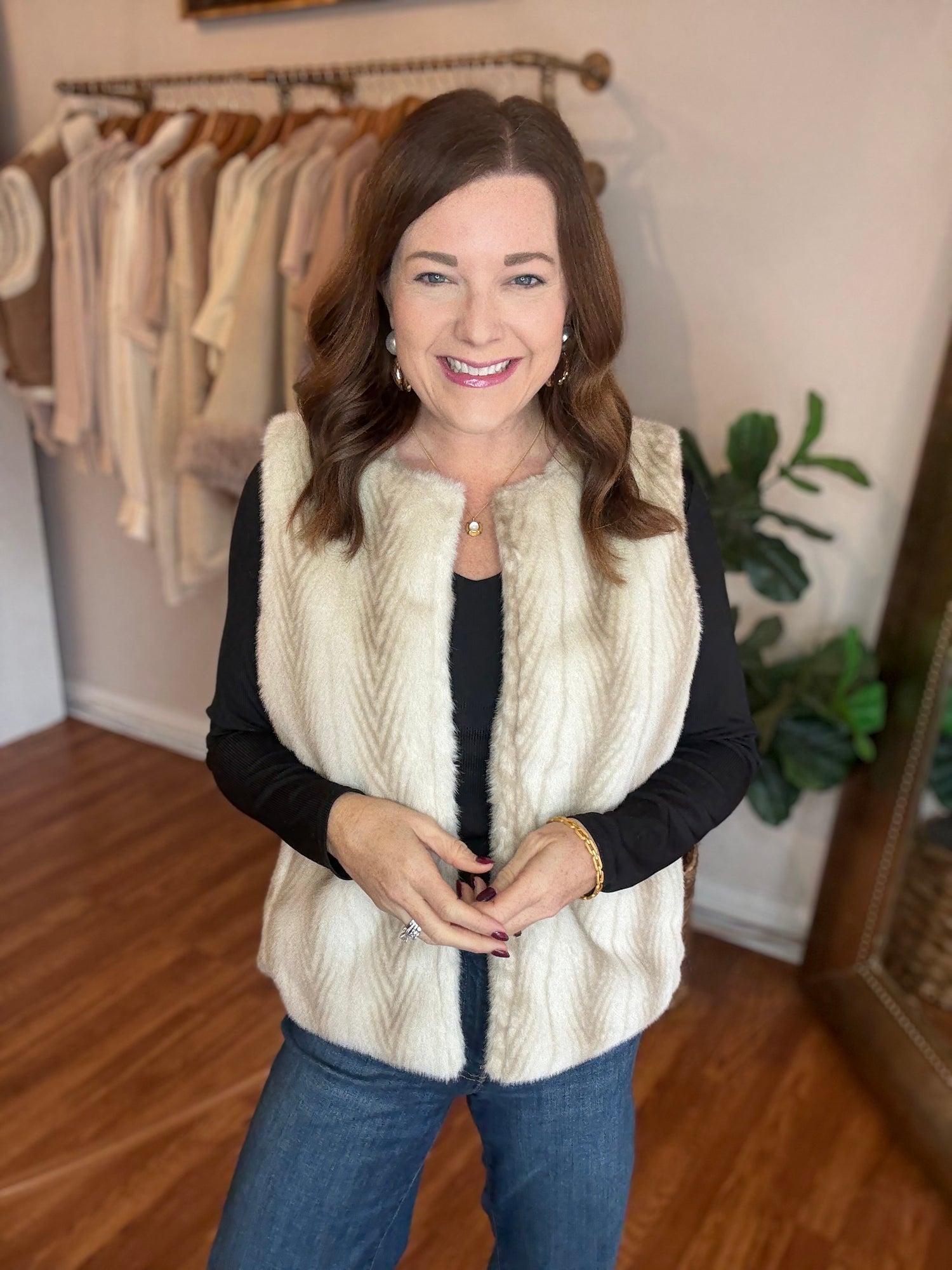 Introducing the Deserve it All Vest - a luxurious faux fur vest that adds a touch of elegance to any outfit. With its loose fit and neutral colors, it's a versatile piece that can be dressed up or down. Plus, with pockets for convenience, you truly can have it all with this must-have addition to your wardrobe! These run true to size. Candace is wearing a small.