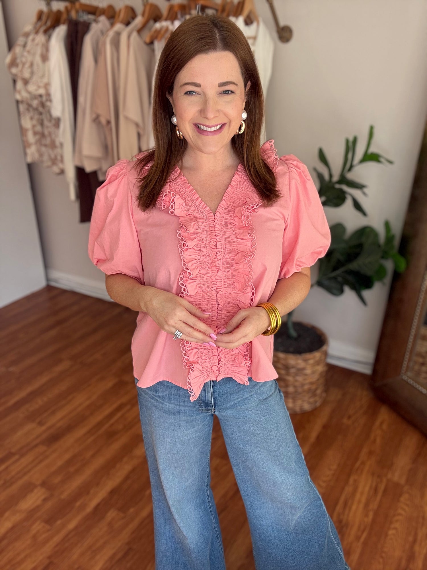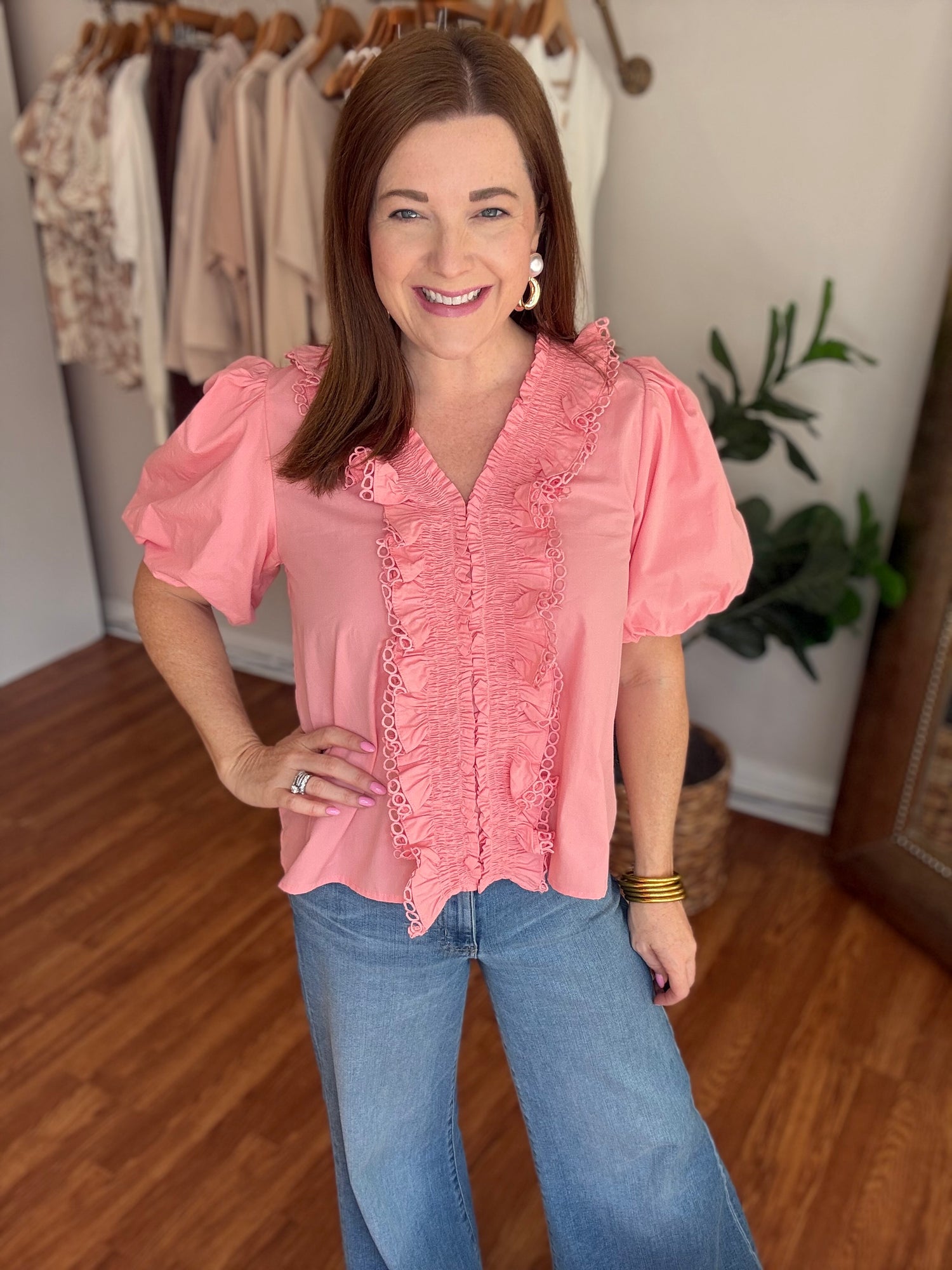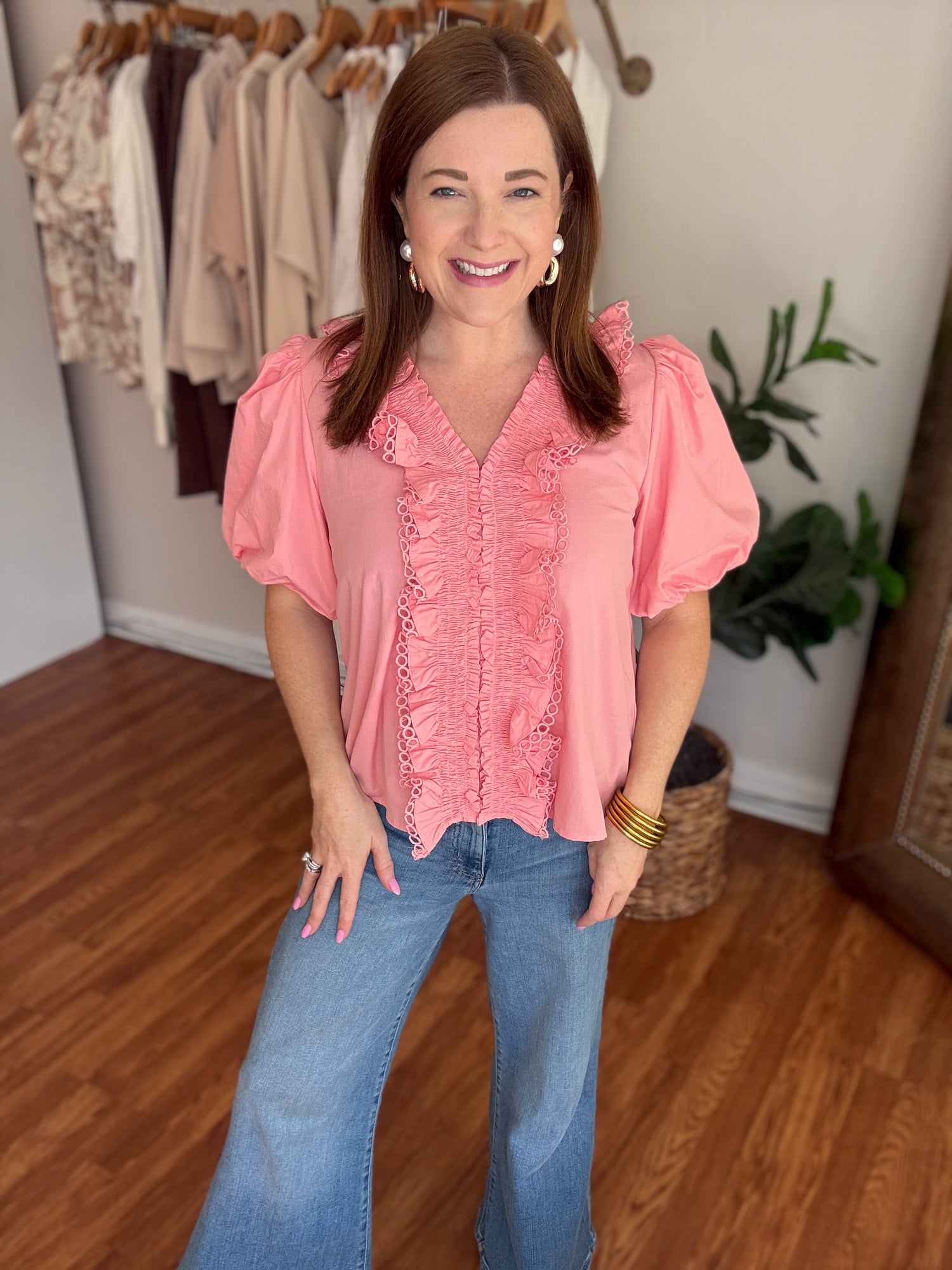 Effortless style meets playful charm in this easy-going top. Crafted with a solid short sleeve design, it features trendy bubble sleeves that add dimension and movement. Delicate lace ruffle detailing along the neckline and cuffs brings an elegant touch perfect for casual outings or dressed-up occasions. Comfortable and versatile, this piece transitions seamlessly from day to night. These have no stretch and run true to size. Candace is 5'4", size 6/8, bra 38c, and wearing a small.