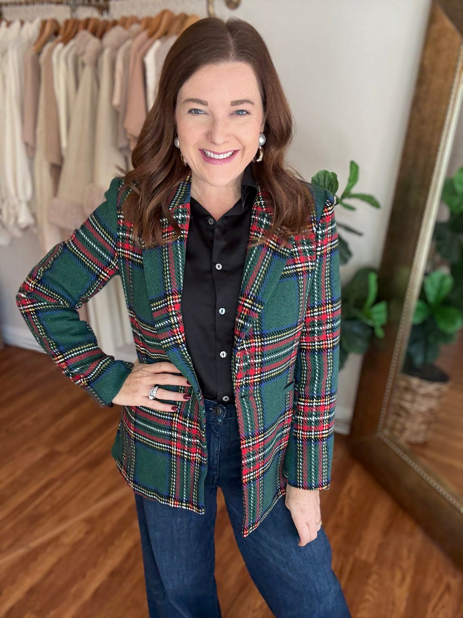 Get into the holiday spirit with our Feeling Festive Blazer! Made with classic Christmas tartan, this blazer is sure to make you stand out at any festive event. Its classic fit ensures comfort and style, making it the perfect addition to your holiday wardrobe. Make a statement and spread cheer this season with our blazer! These have no stretch and run true to size. Candace is 5’4”, size 6/8, bra 38c, and wearing a small.