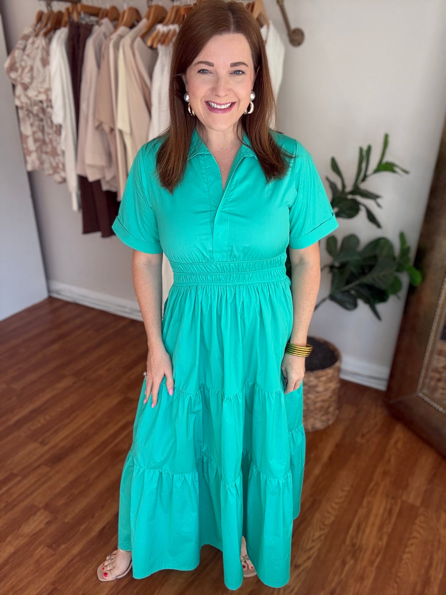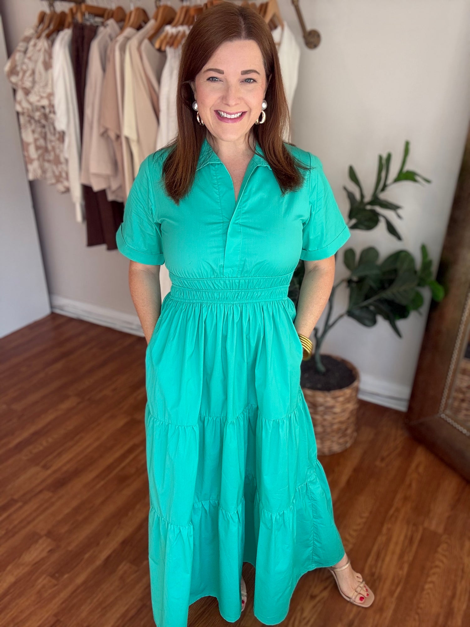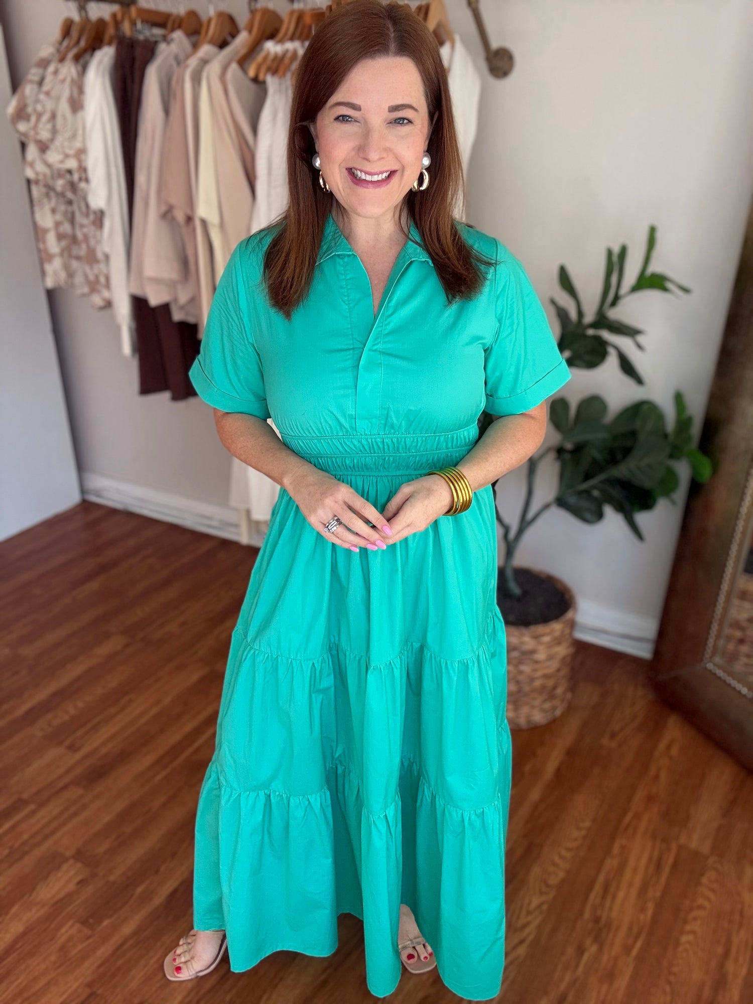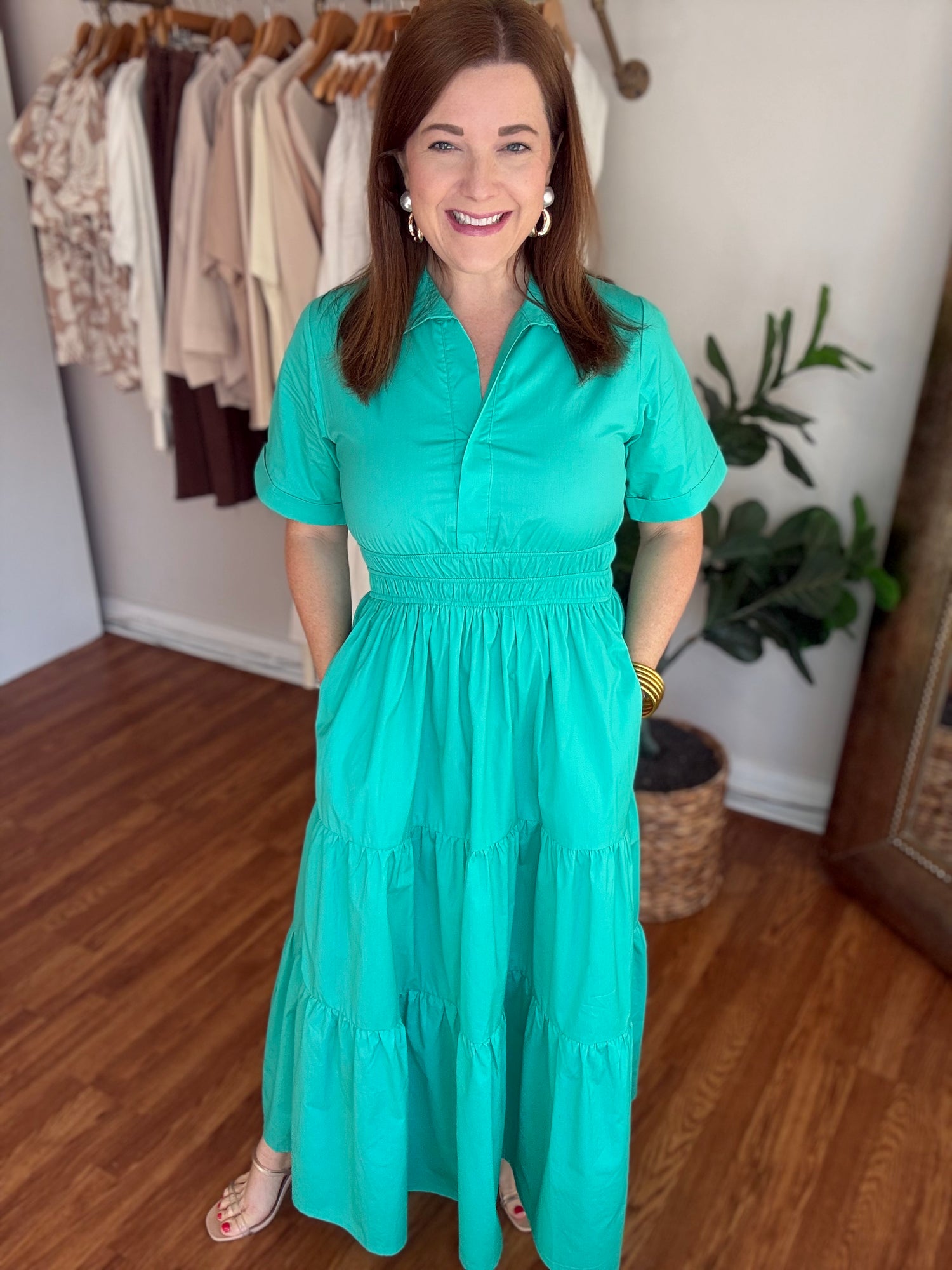 Effortless elegance meets everyday comfort in this forever-favorite maxi dress. Featuring short sleeves, a flattering tiered silhouette, and a convenient front snap closure for easy dressing. Practical hidden pockets keep your essentials close. Perfect for casual outings, weekend adventures, or relaxed gatherings—a versatile staple that works season after season. These have no stretch and run true to size to slightly small through the bust. We recommend sizing up if you are busty. Candace is 5'4", size 6/8, bra 38c, and wearing a small.