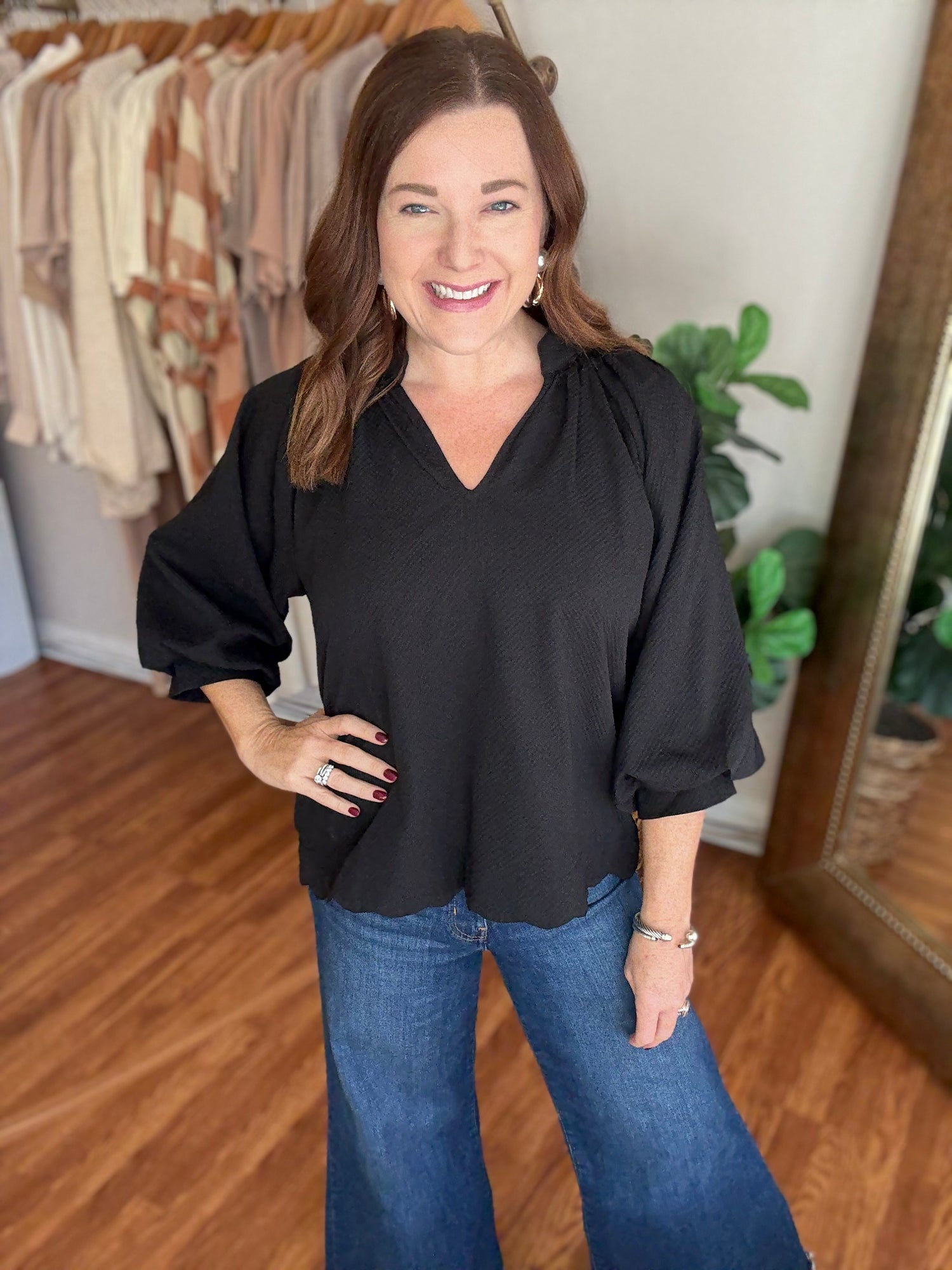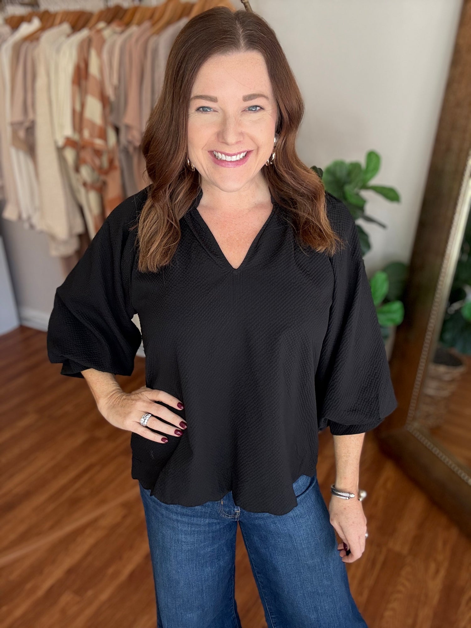 Introducing our Get to Know You Top in Red! This textured top features a chic collar and stylish scallop detailing at the bottom. Perfect for adding a touch of sophistication to any outfit, this top is a must-have for your wardrobe. Make a statement and feel your best in our top! These have no stretch and run true to size. Candace is 5’4”, size 6/8, bra 38c, and wearing a small.