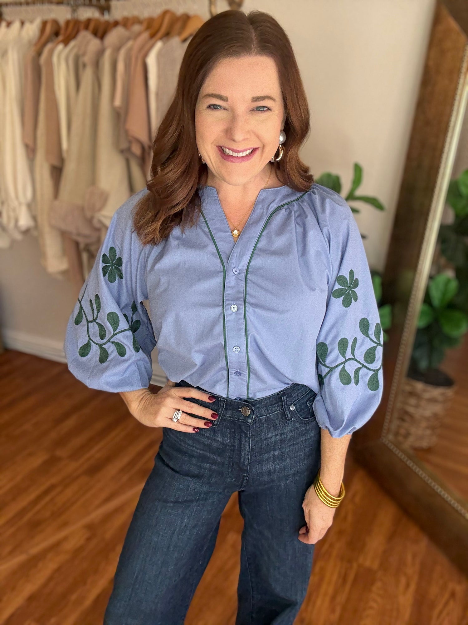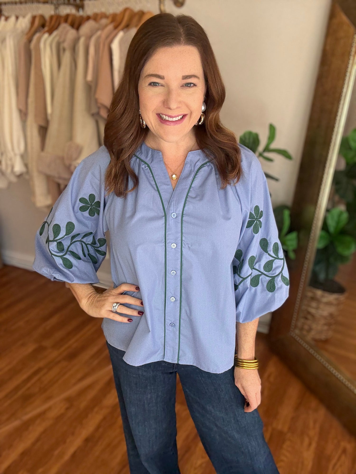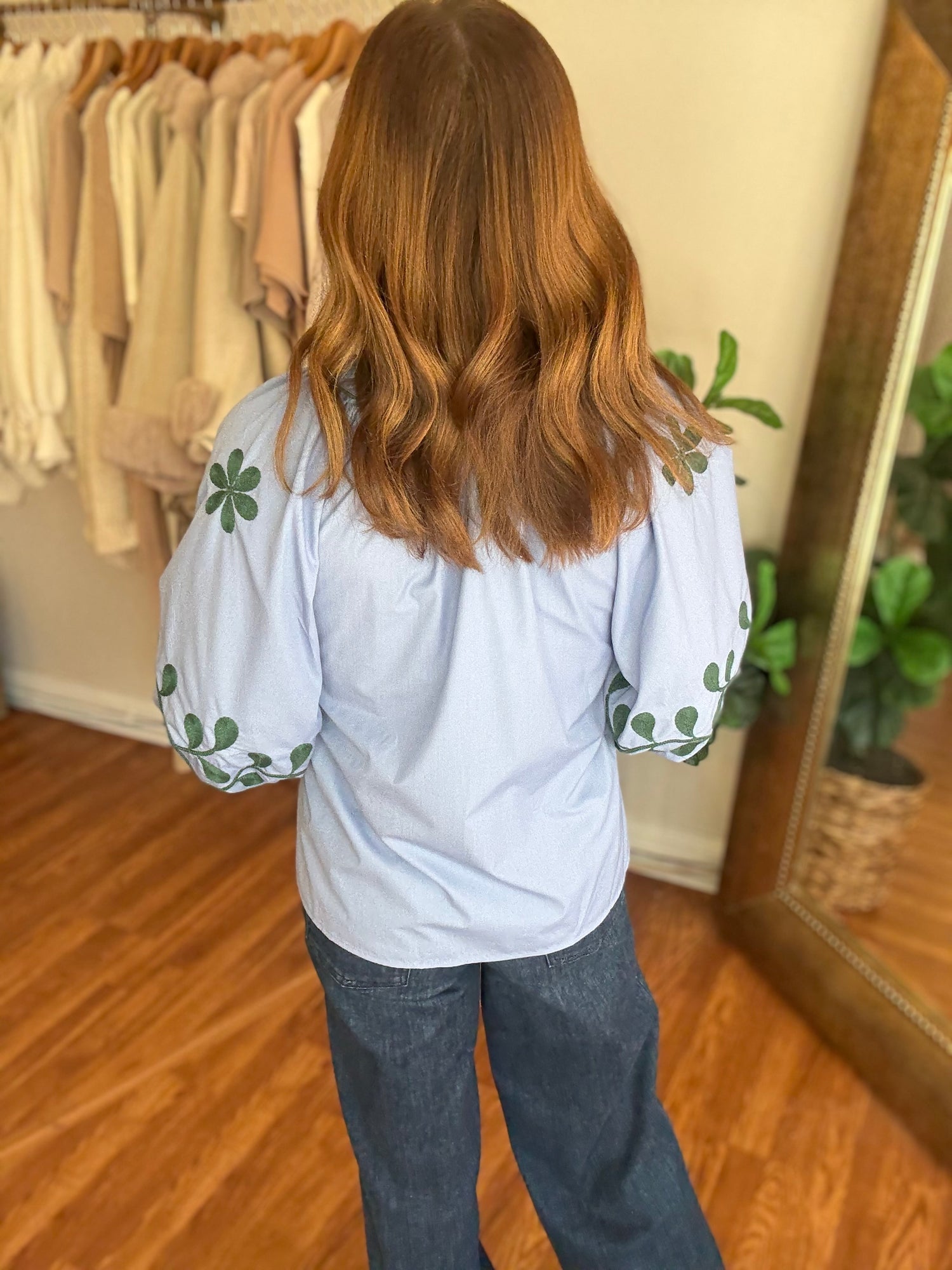 Experience effortless style and comfort with our Give it a Try Top! This button-up top features an intricate embroidered design on the sleeves, adding a touch of elegance to your outfit. Complete with a beautiful blue and green color combo, it's perfect for any occasion. Upgrade your wardrobe now! These have no stretch and run true to size. Candace is 5’4”, size 6/8, bra 38c, and wearing a small.