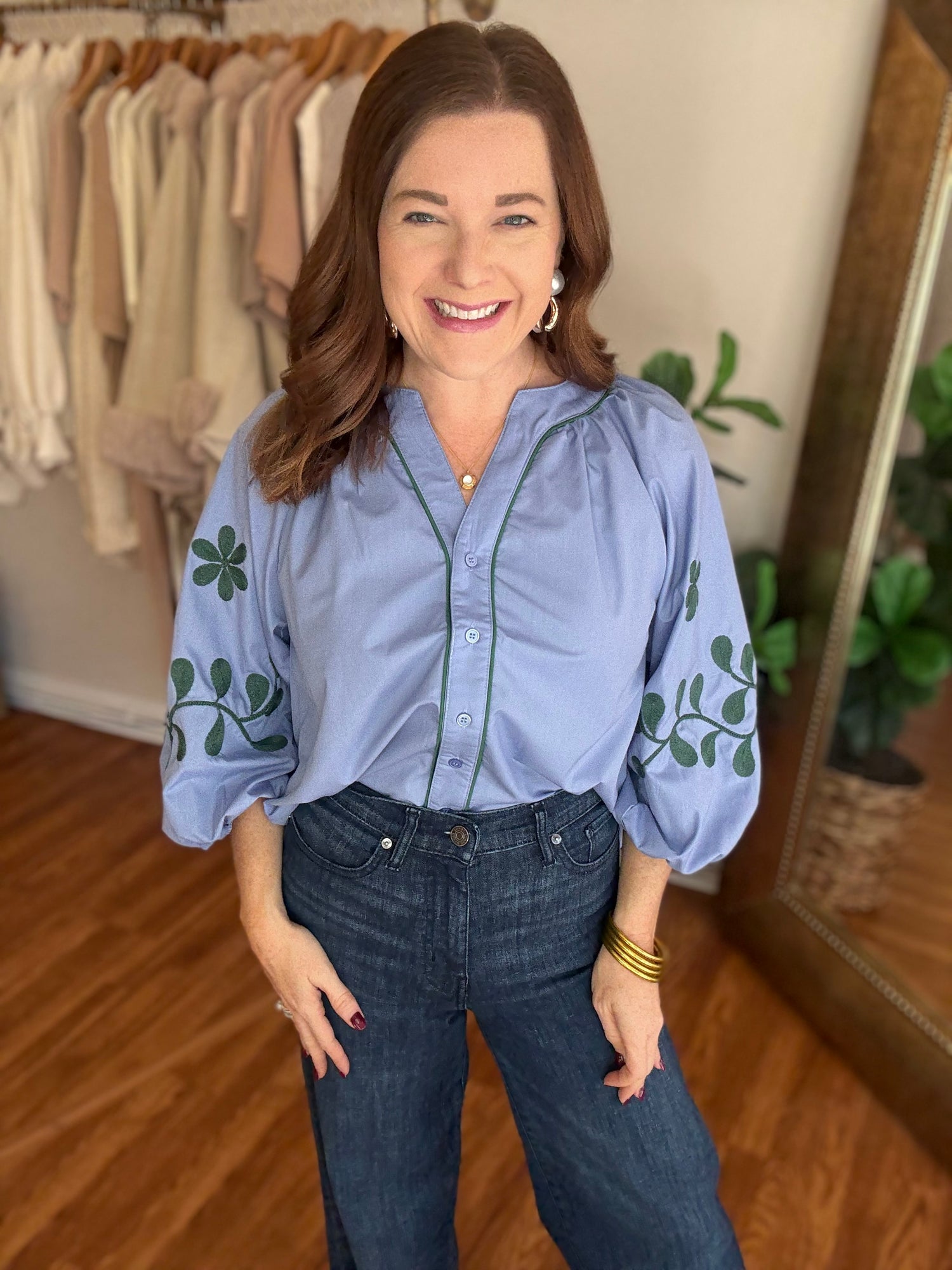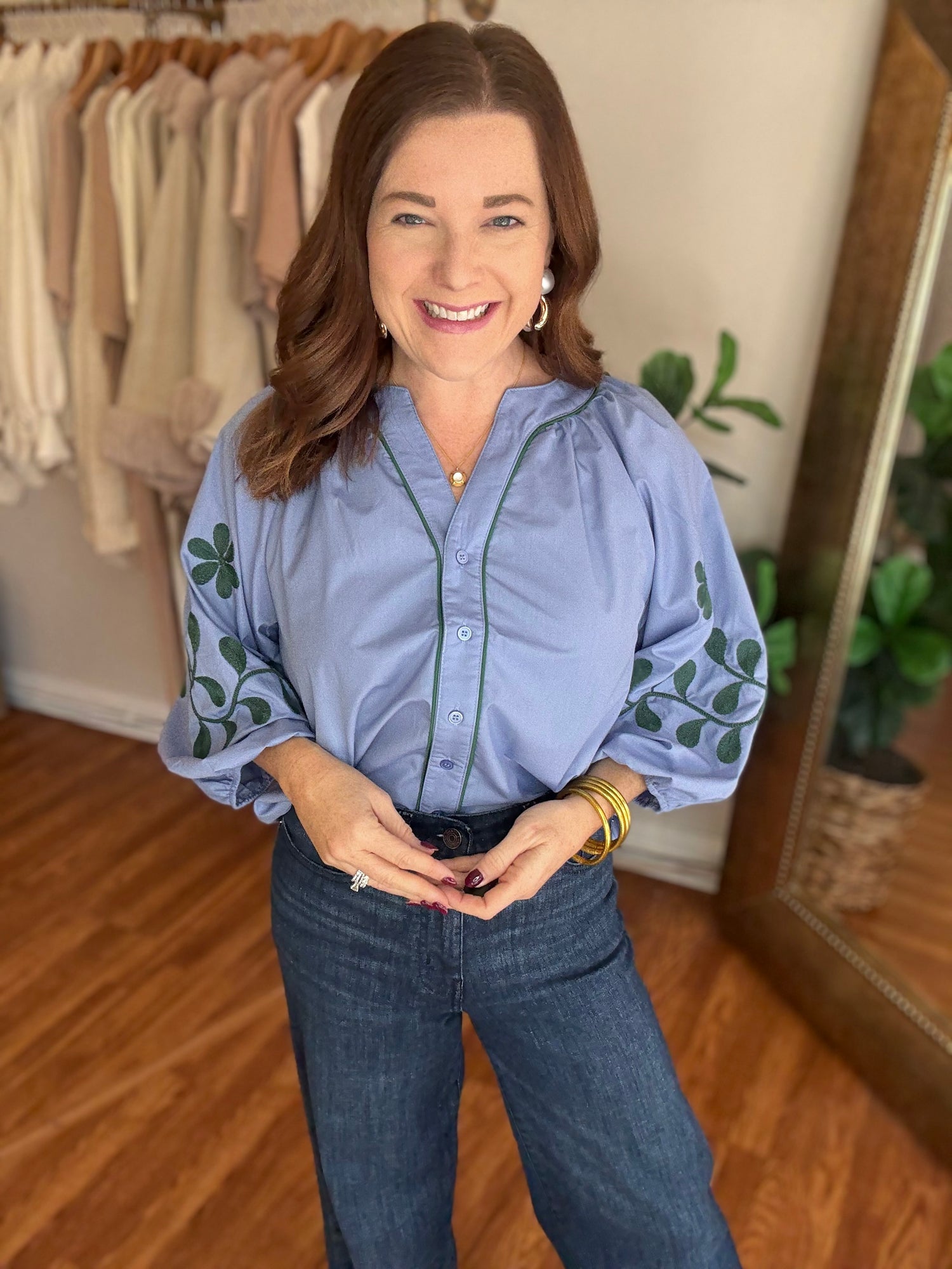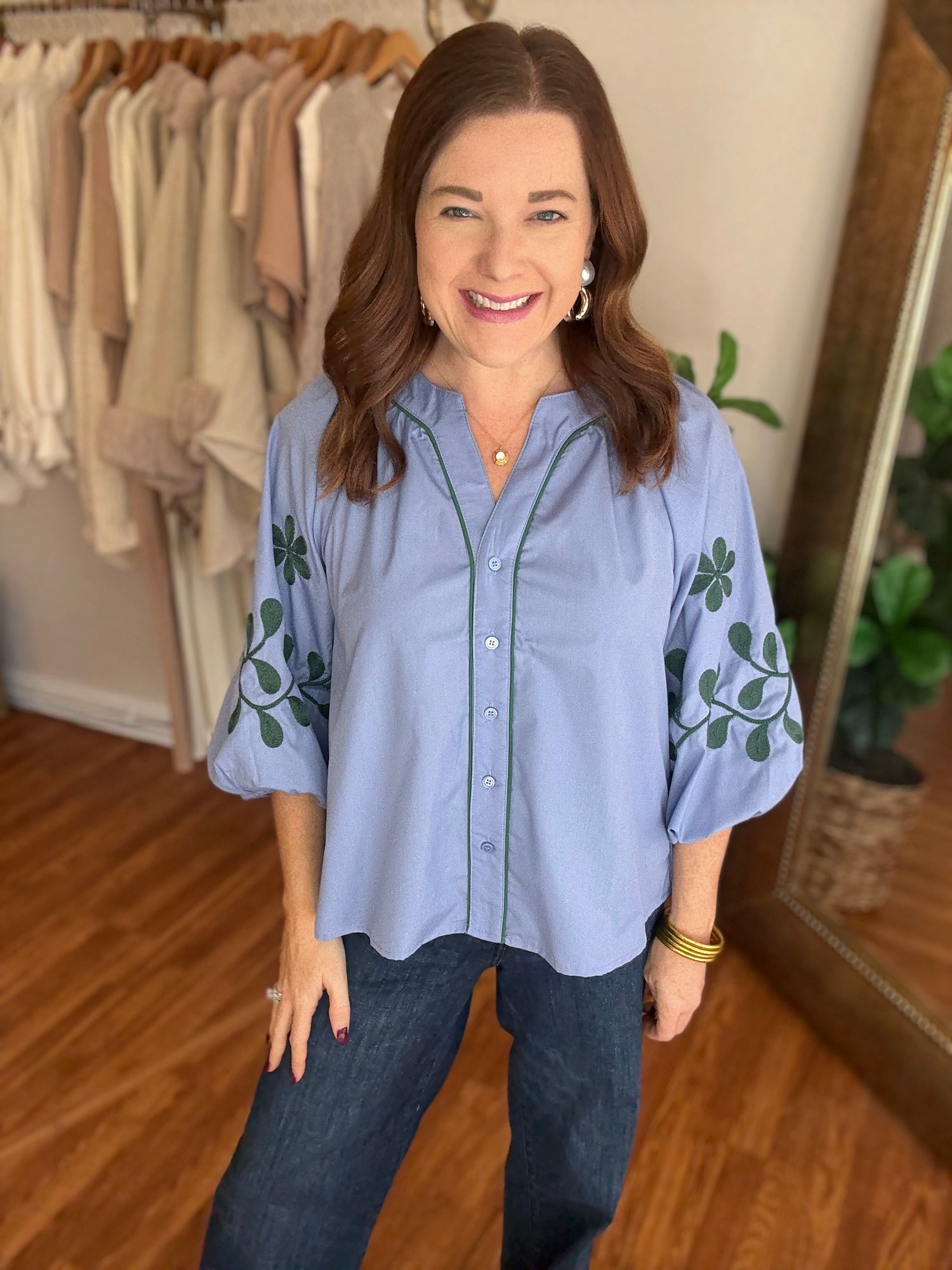 Experience effortless style and comfort with our Give it a Try Top! This button-up top features an intricate embroidered design on the sleeves, adding a touch of elegance to your outfit. Complete with a beautiful blue and green color combo, it's perfect for any occasion. Upgrade your wardrobe now! These have no stretch and run true to size. Candace is 5’4”, size 6/8, bra 38c, and wearing a small.