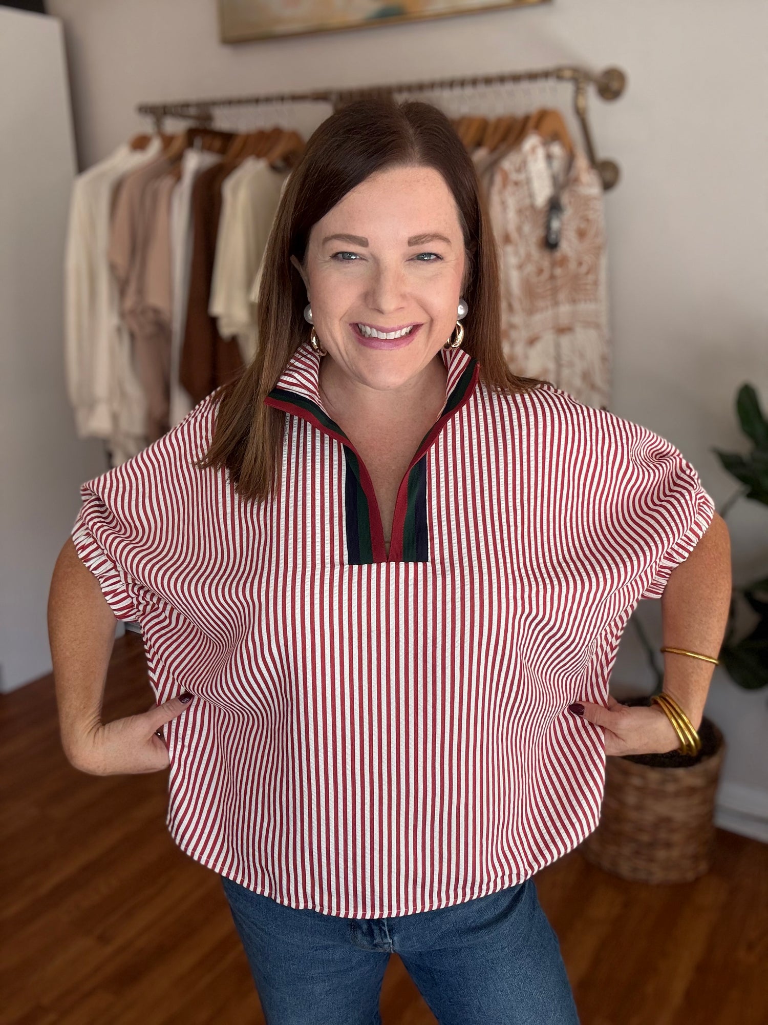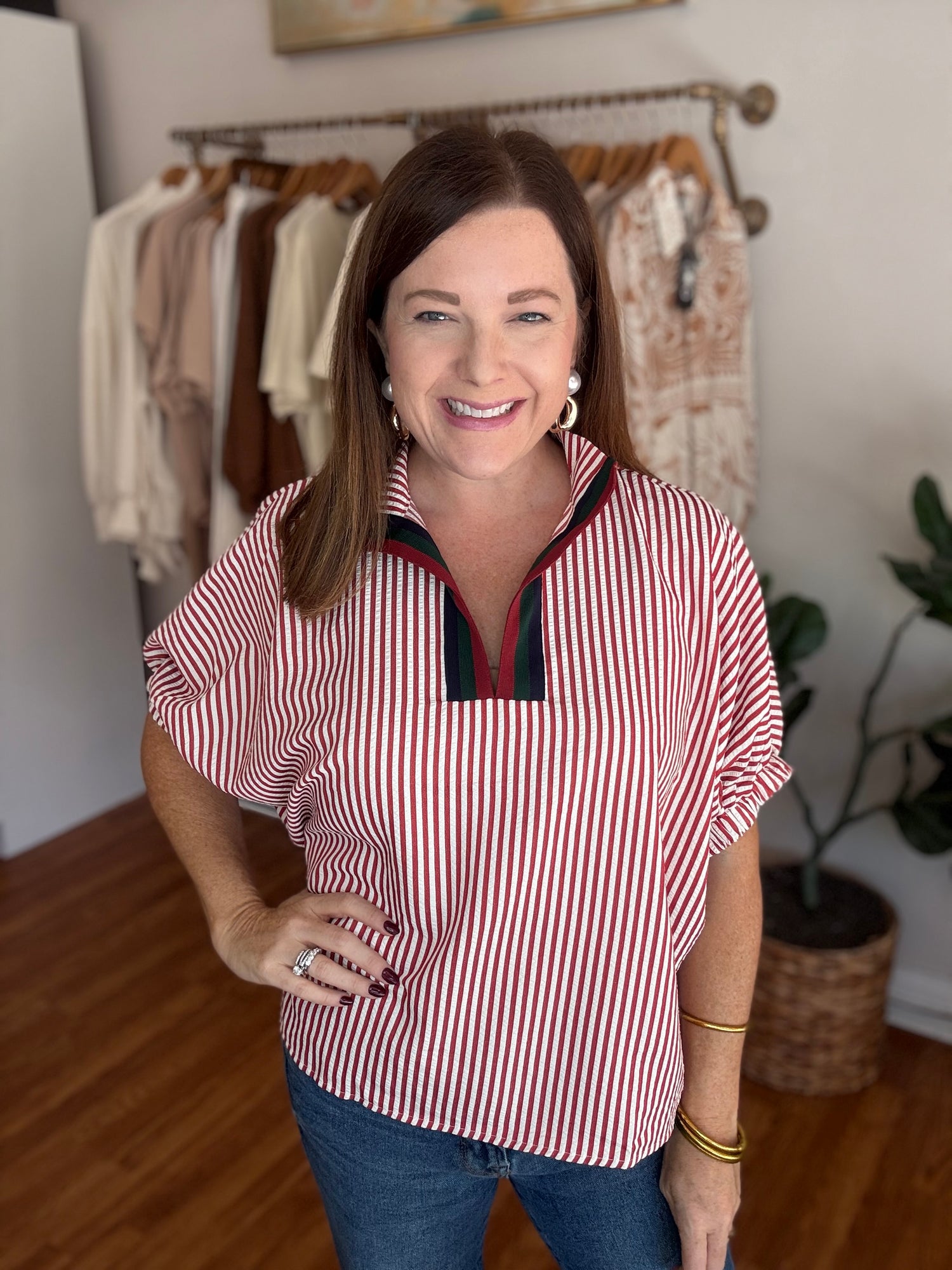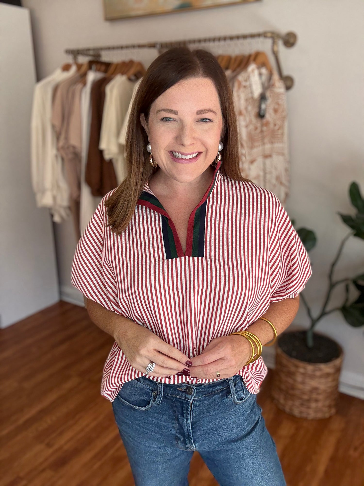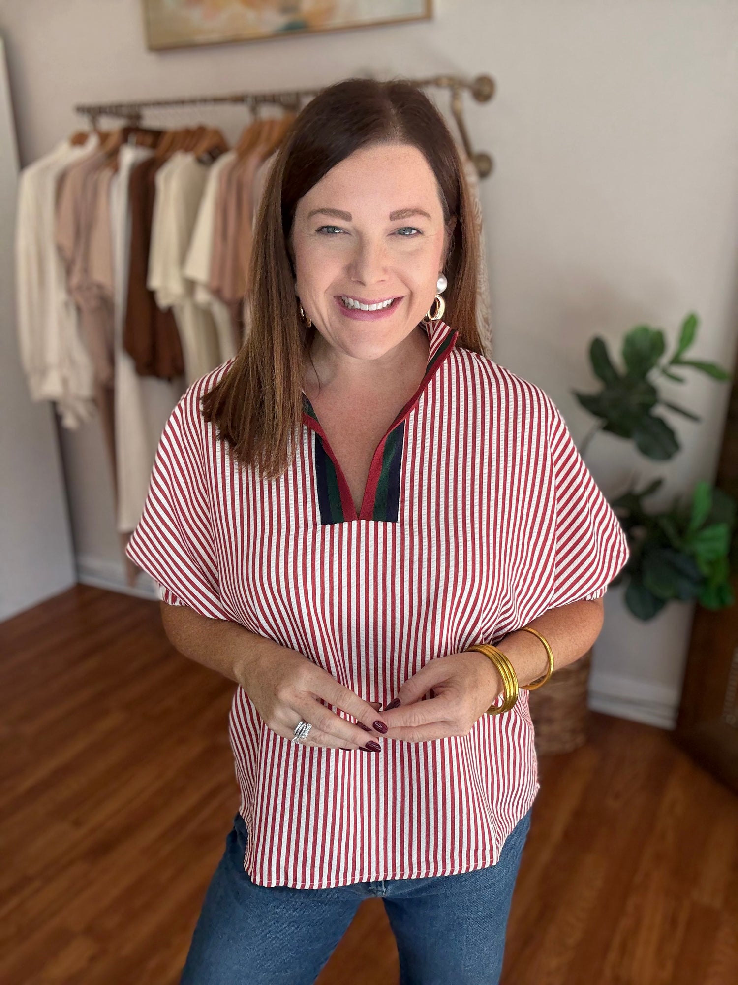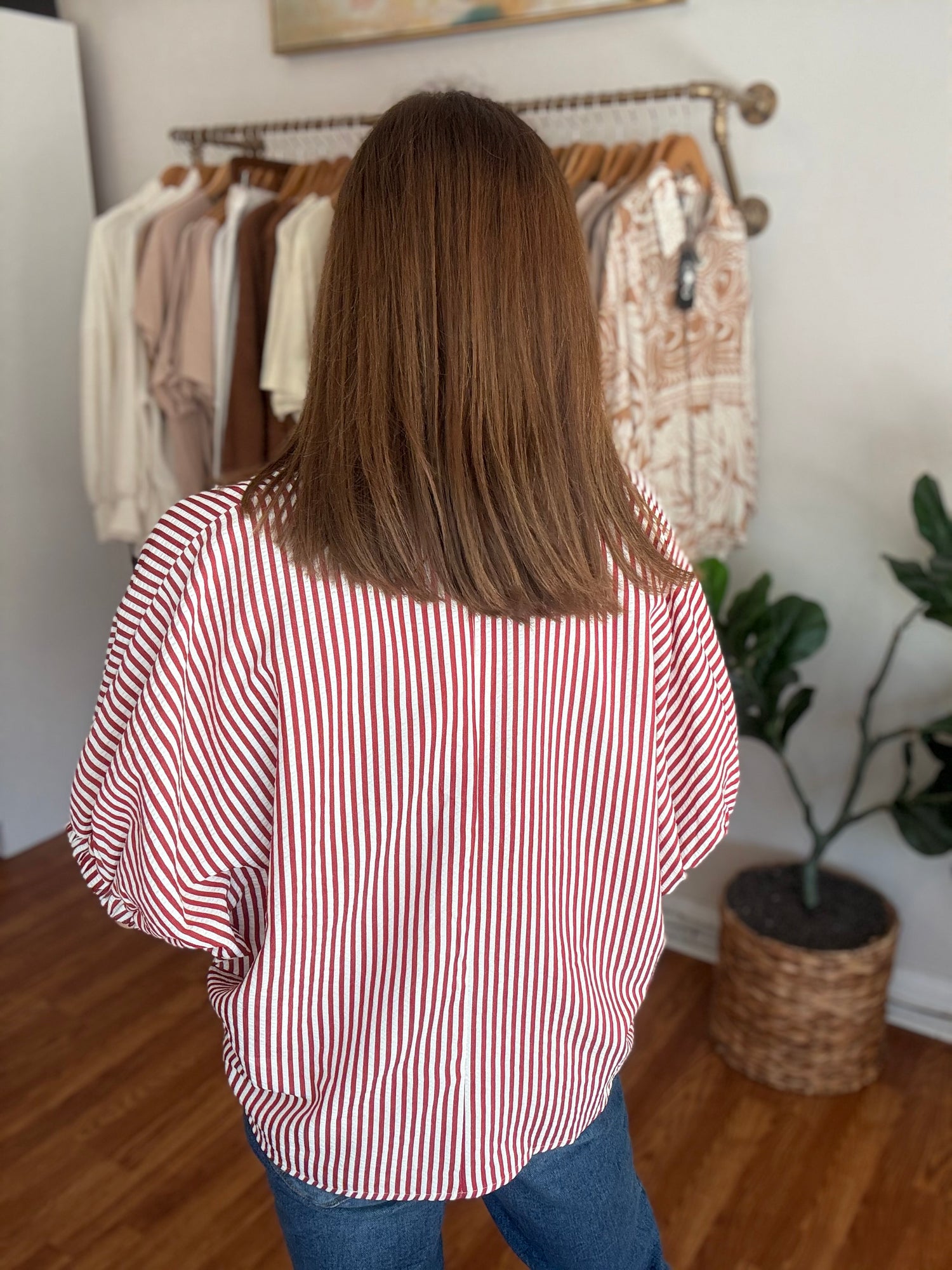 Introducing our In My Mind Top! Stay on trend this fall with its chic seersucker fabric and contrasting trim along the neckline. Plus, enjoy a comfortable and stylish fit with its loose, oversized design. Experience fashion and comfort with this must-have top! These have no stretch and run generous in size. We recommend sizing down. Candace is 5’4”, size 6/8, bra 38c, and wearing a small.