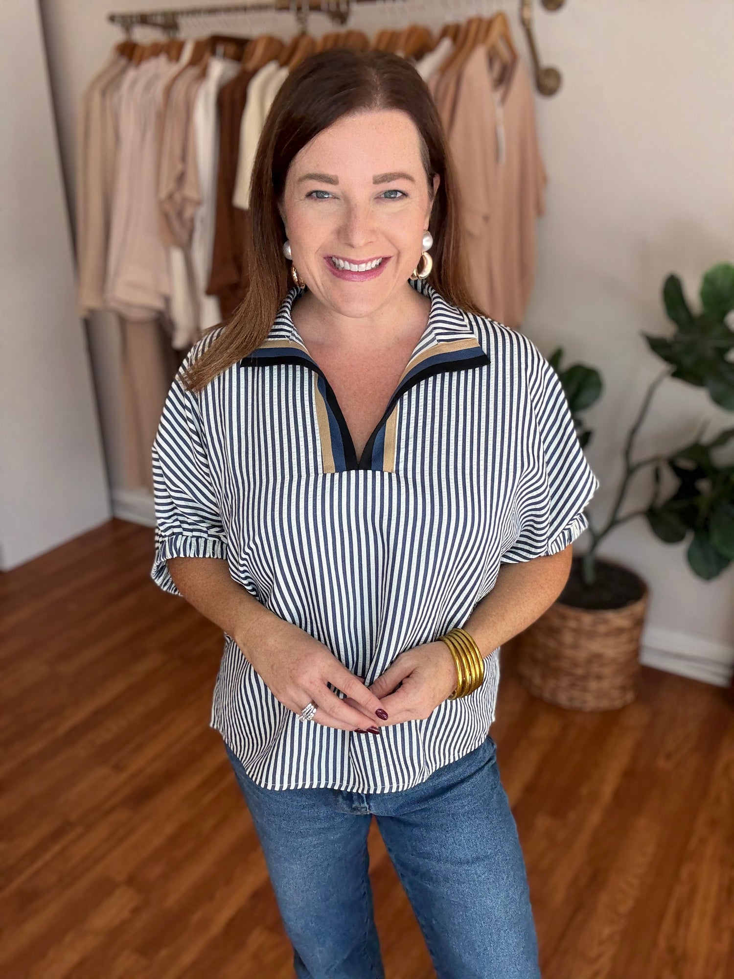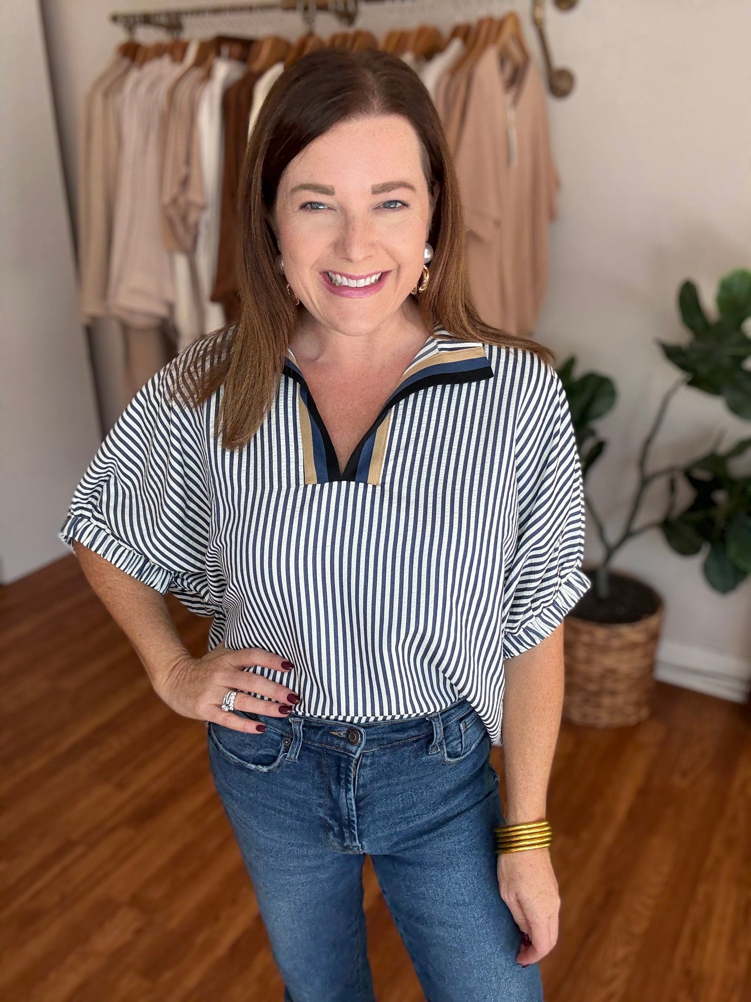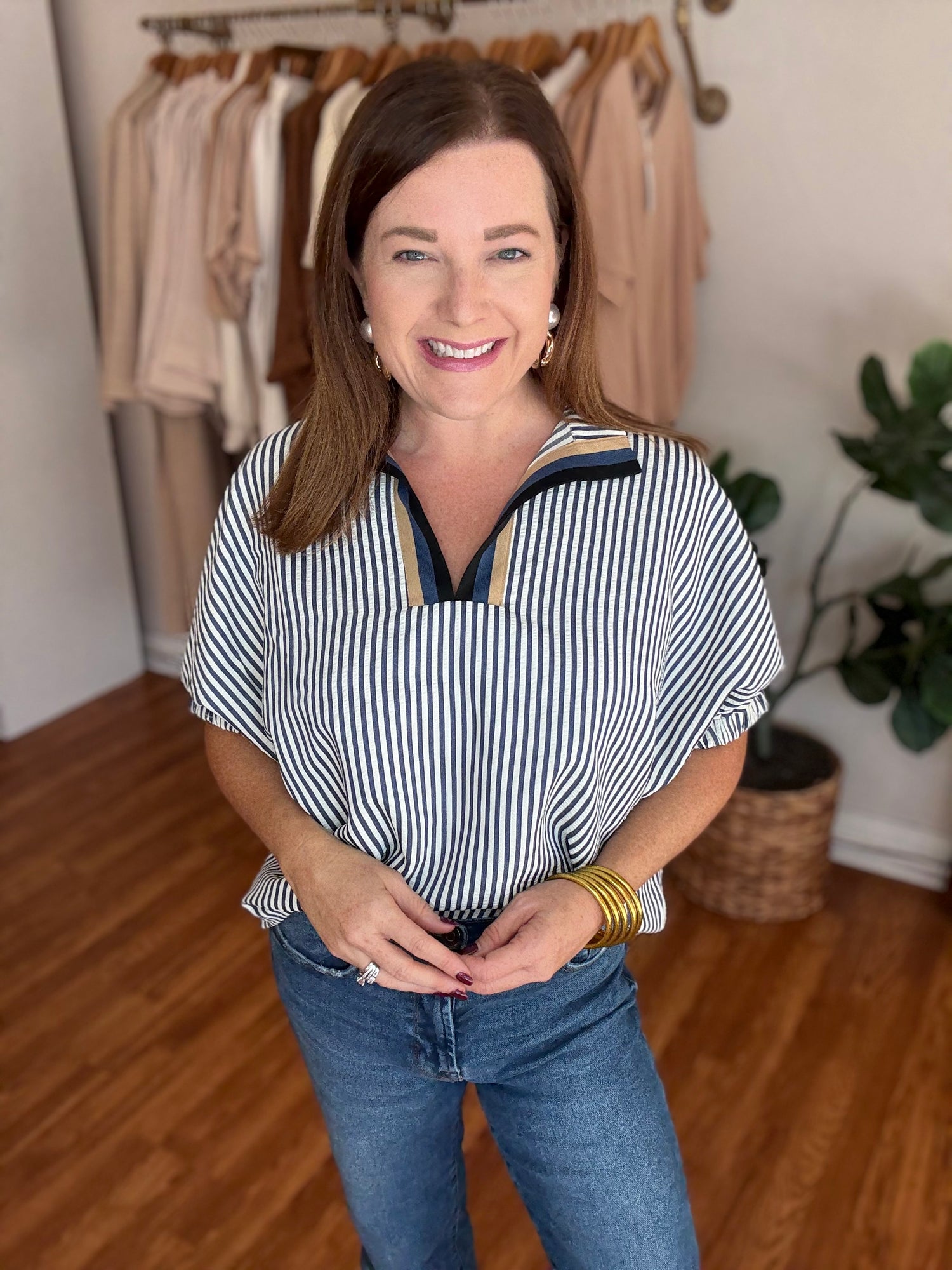 Introducing our In My Mind Top! Stay on trend this fall with its chic seersucker fabric and contrasting trim along the neckline. Plus, enjoy a comfortable and stylish fit with its loose, oversized design. Experience fashion and comfort with this must-have top! These have no stretch and run generous in size. We recommend sizing down. Candace is 5’4”, size 6/8, bra 38c, and wearing a small.