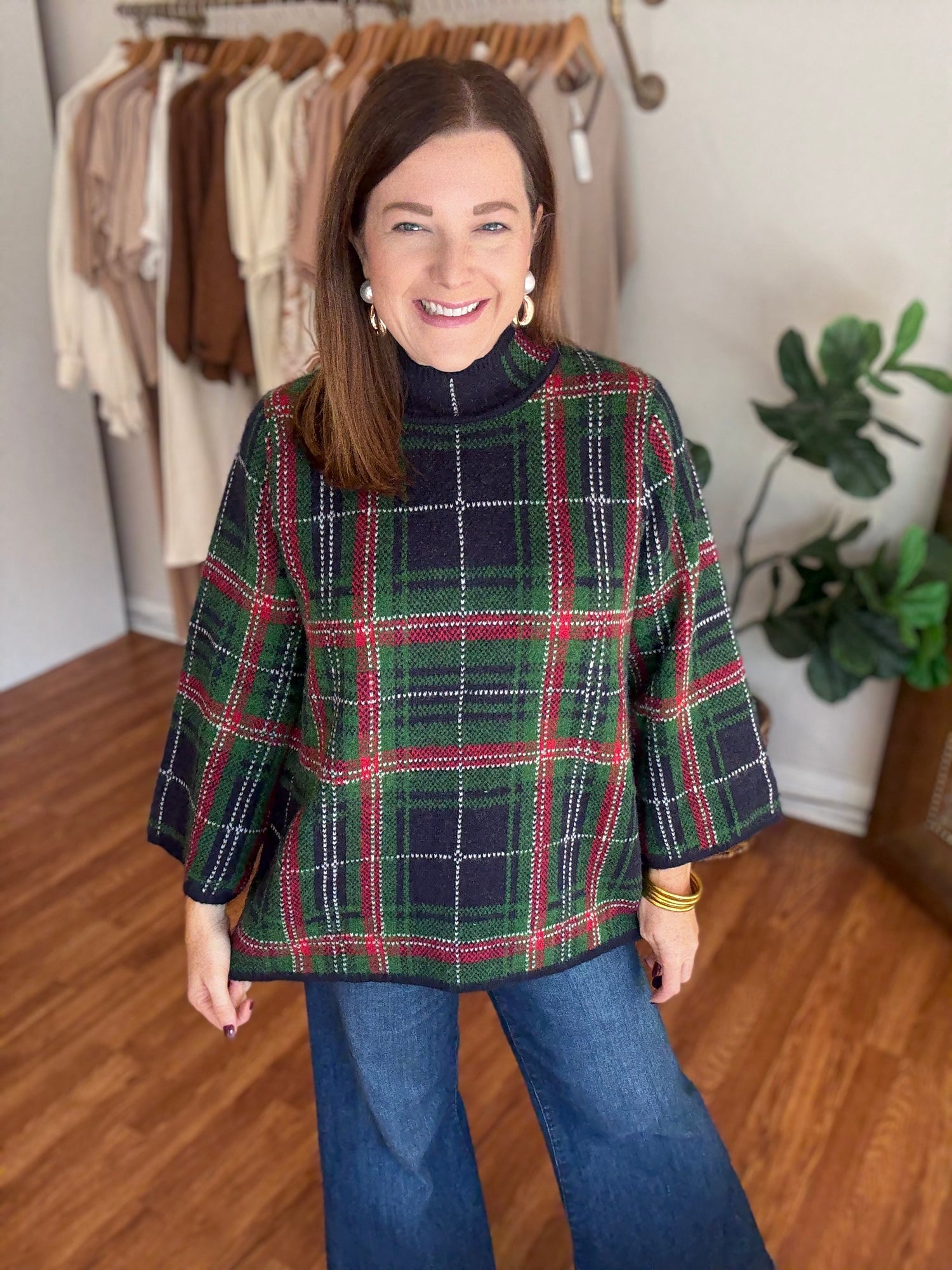Stay warm and stylish this winter with our Looking Pine Sweater. Featuring a classic tartan plaid design, this soft and cozy sweater is perfect for any occasion. The mock neck and longer length provide extra warmth and comfort. Don't miss out on this must-have winter essential! These run true to size. Candace is 5’4”, size 6:8, bra 38c, and wearing a small.