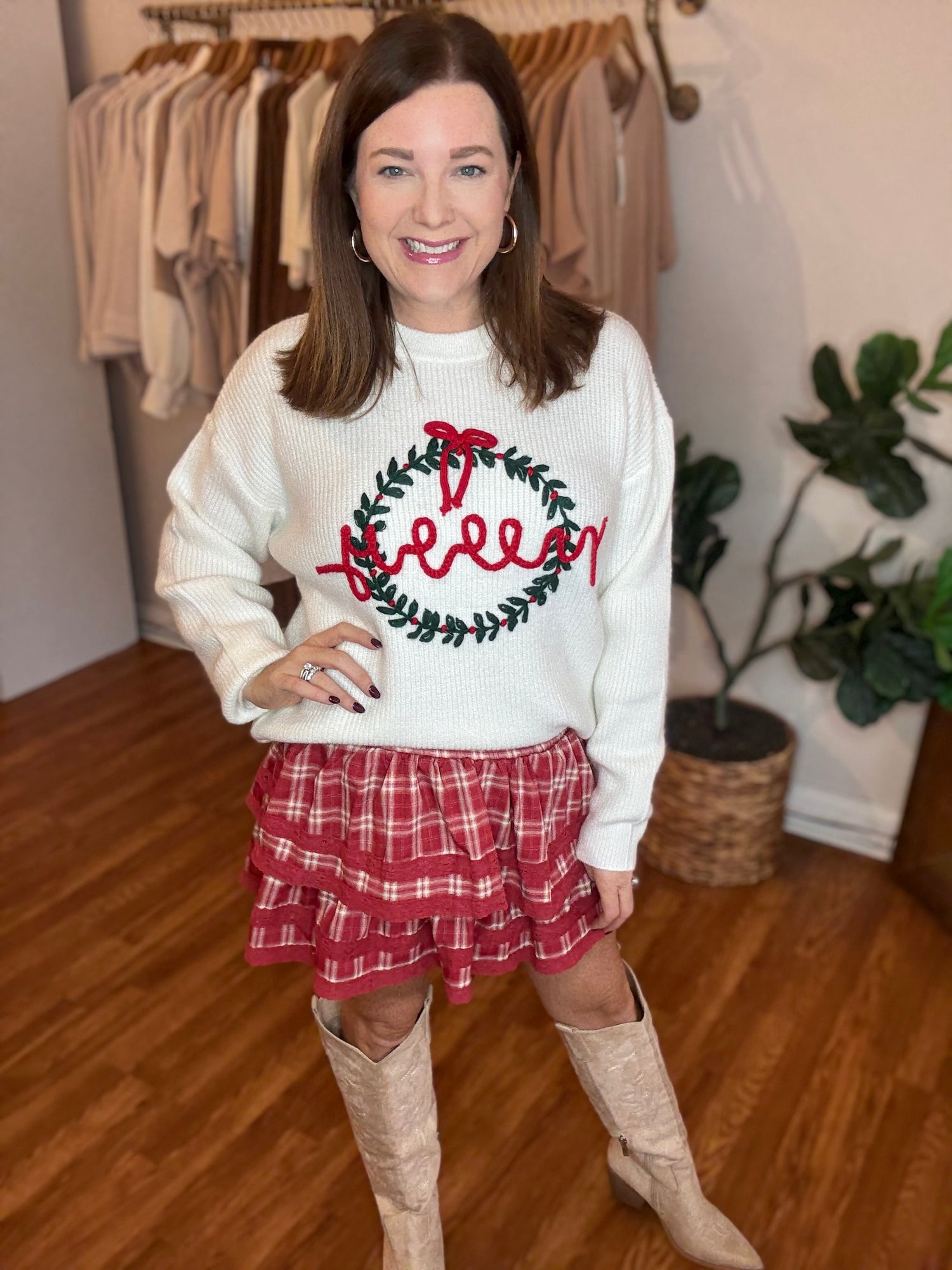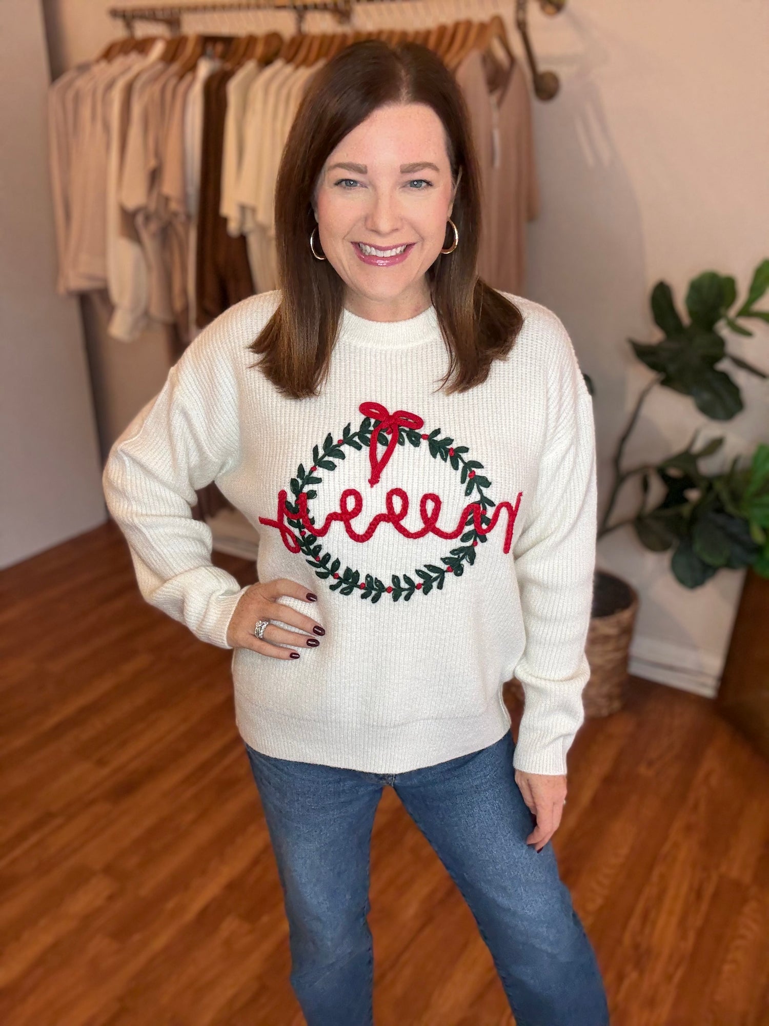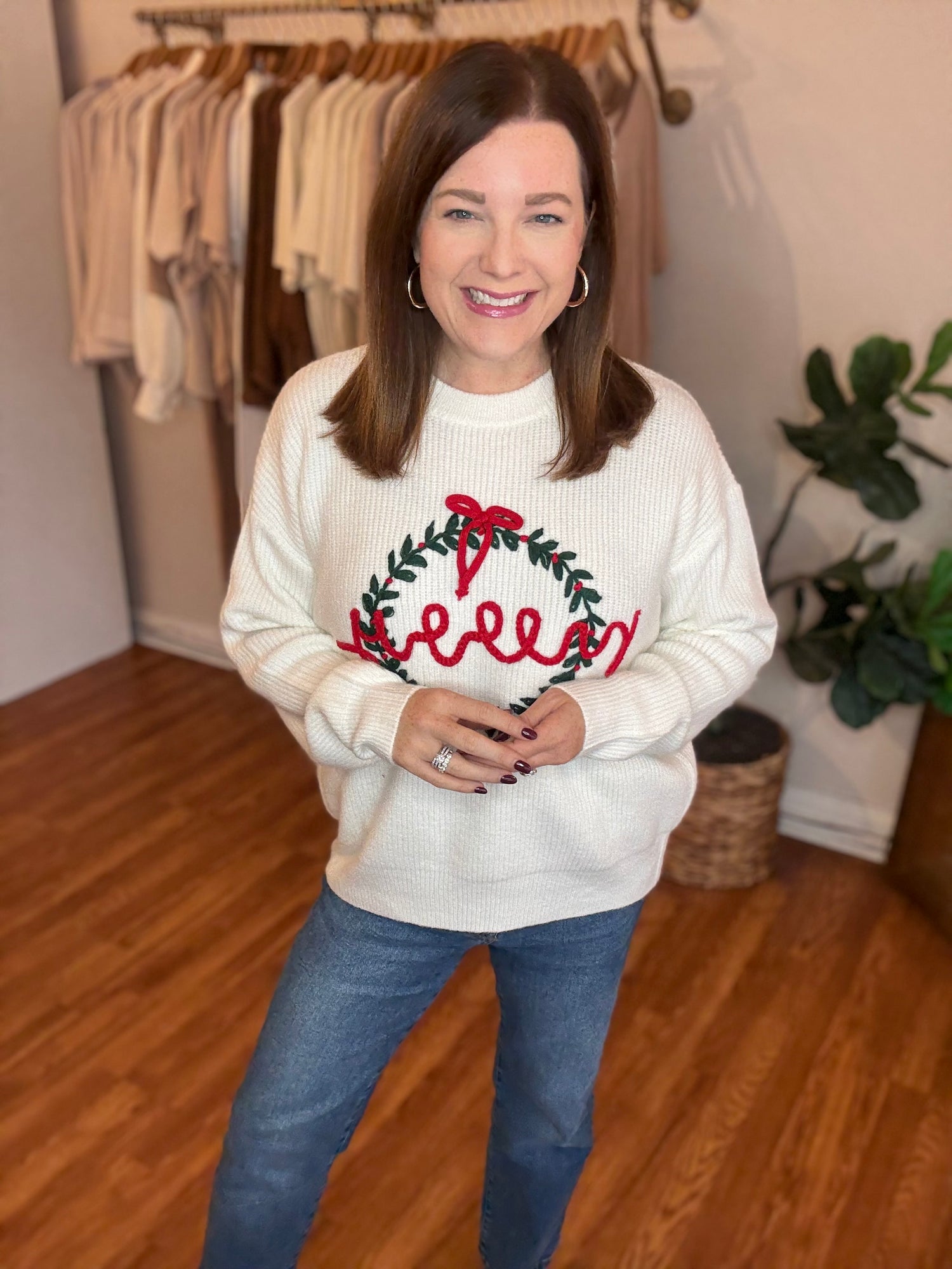 Celebrate the season in cozy style with the Merry Wreath Sweater. Featuring a joyful wreath design and a festive "Merry" message, this sweater brings holiday cheer wherever you go. Its loose, relaxed fit ensures comfortable wear for all-day festivities, making it perfect for casual gatherings or cozy nights by the fire. Embrace the holiday spirit with a fun, festive look that’s as comfortable as it is charming. Candace is 5'4", size 6/8, bra 38c, and wearing a small.