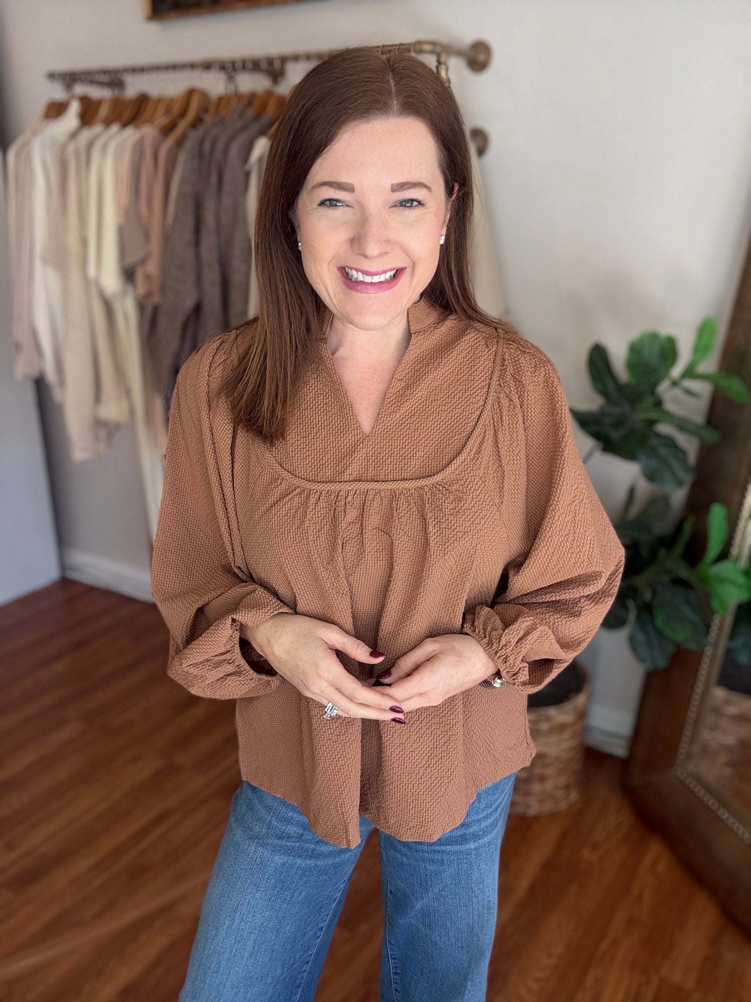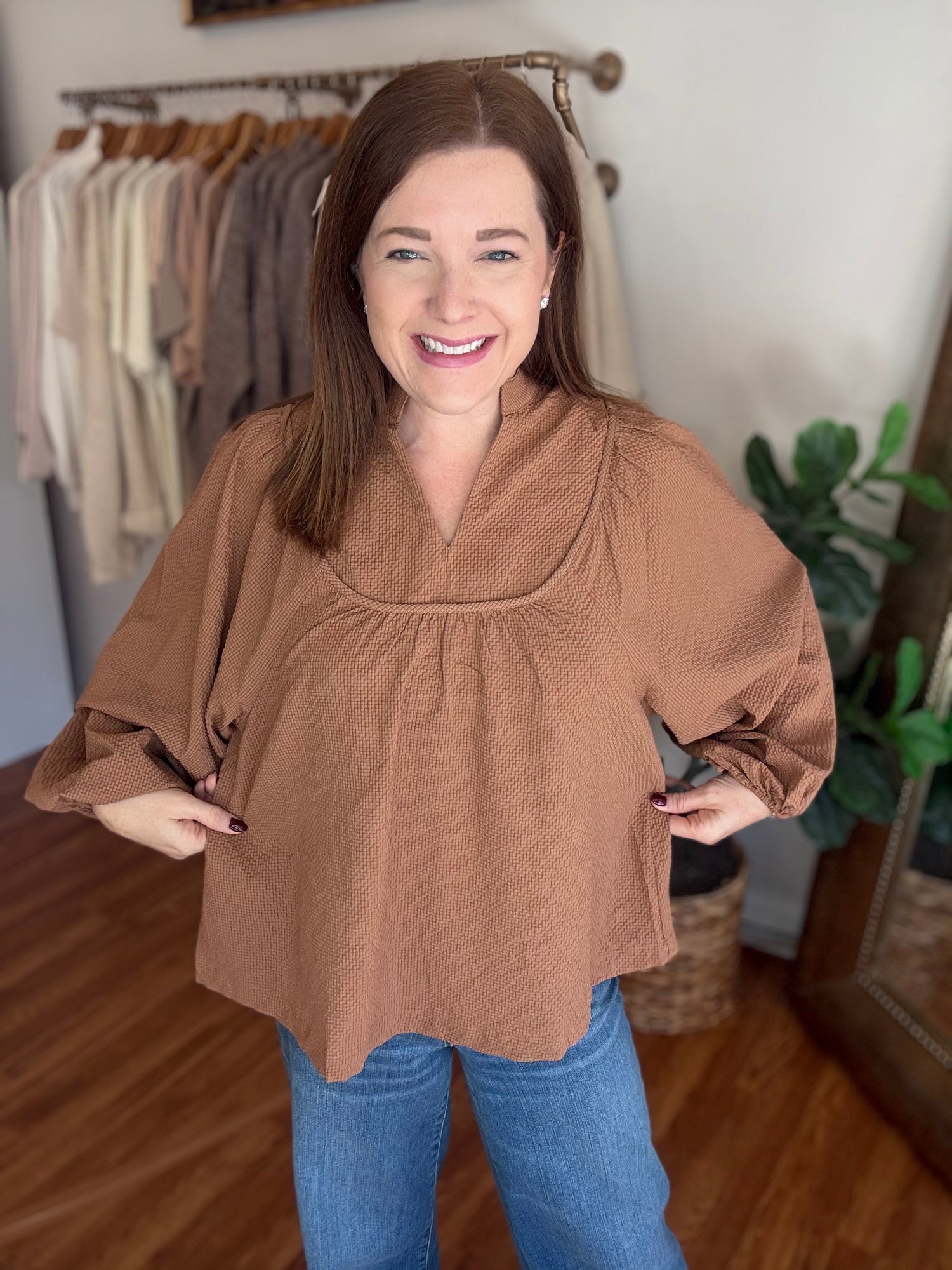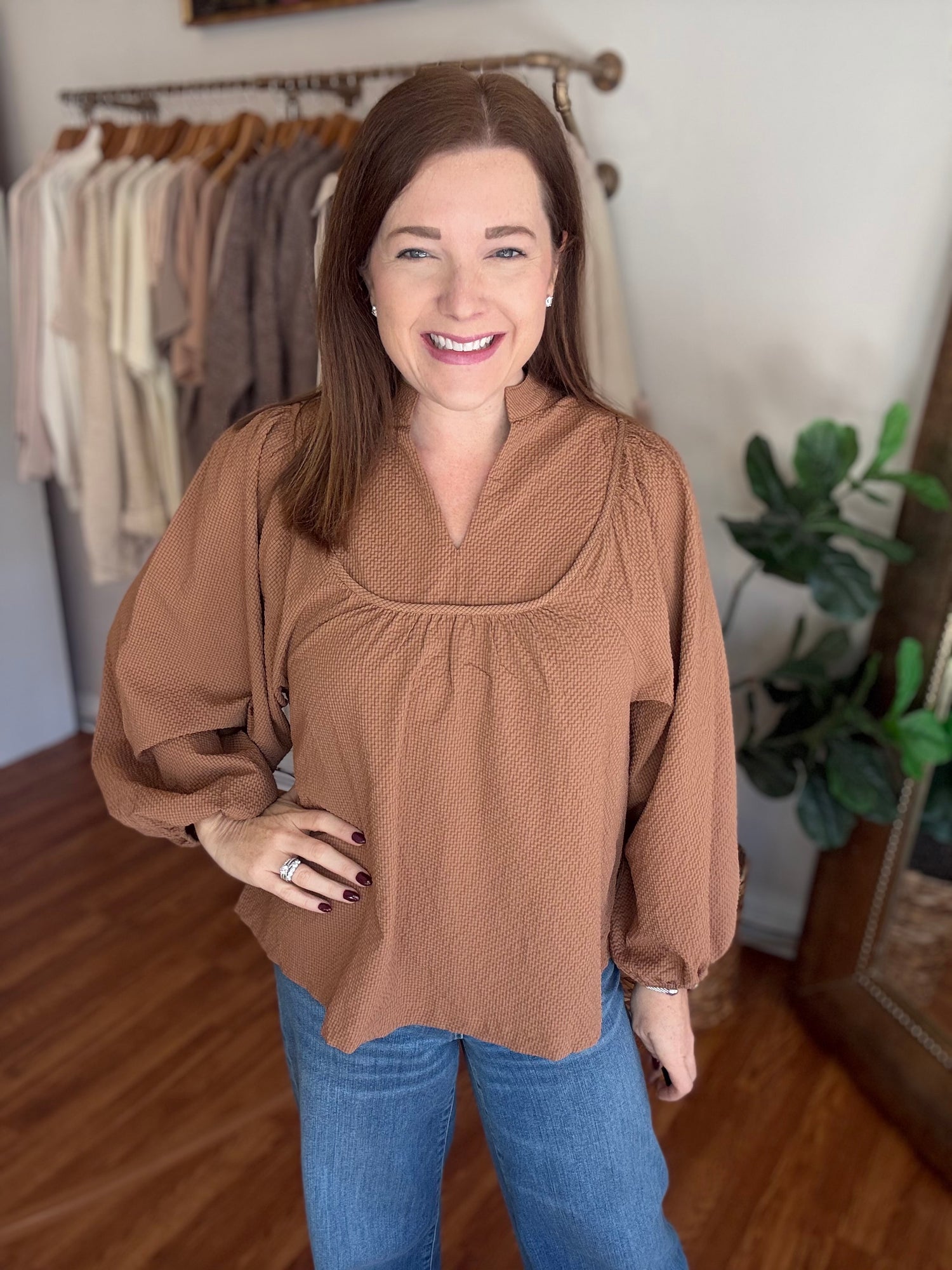 Effortlessly versatile, the Must Be the One Top features a textured fabric and relaxed silhouette that transitions seamlessly from day to night. Voluminous balloon sleeves add contemporary flair and movement, while the loose fit ensures all-day comfort. Dress it up with tailored trousers and heels for evening elegance, or keep it casual with your favorite jeans and sneakers. This is the top you'll reach for again and again—the one that works for every occasion. These have no stretch and run true to size to slightly oversized. Candace is 5'4", size 6/8, bra 38c, and wearing a small.