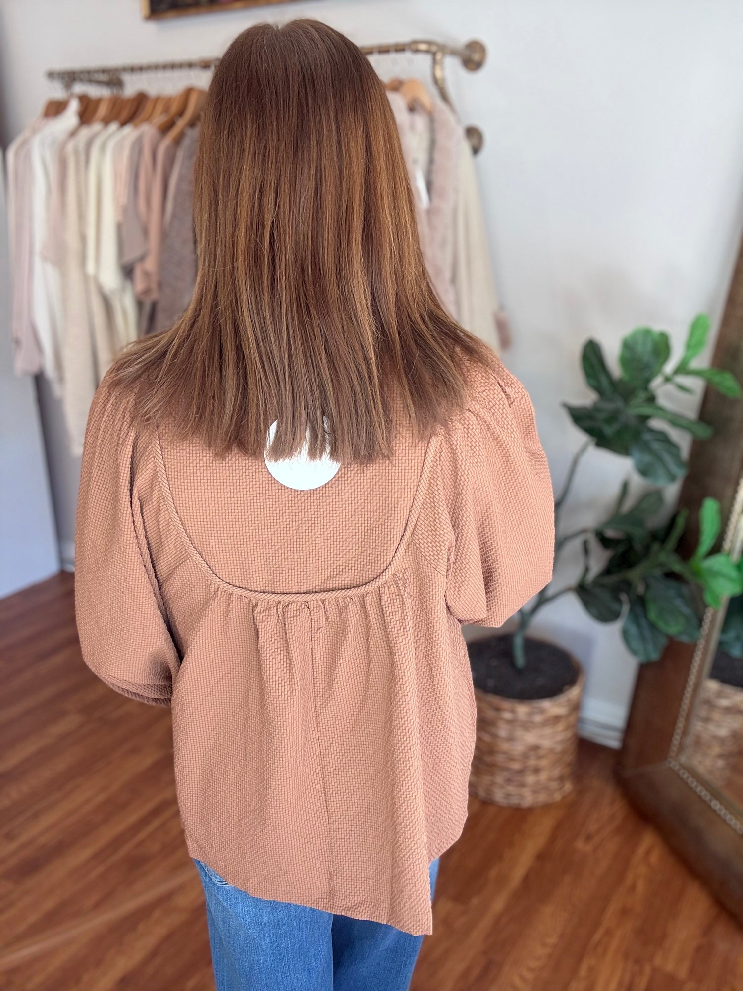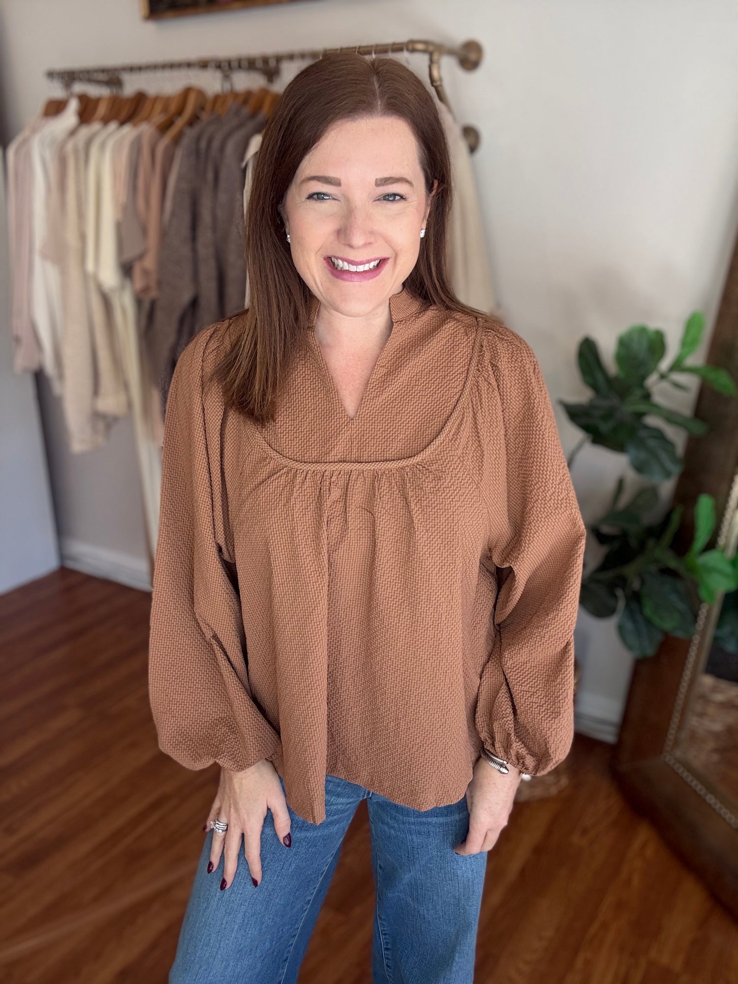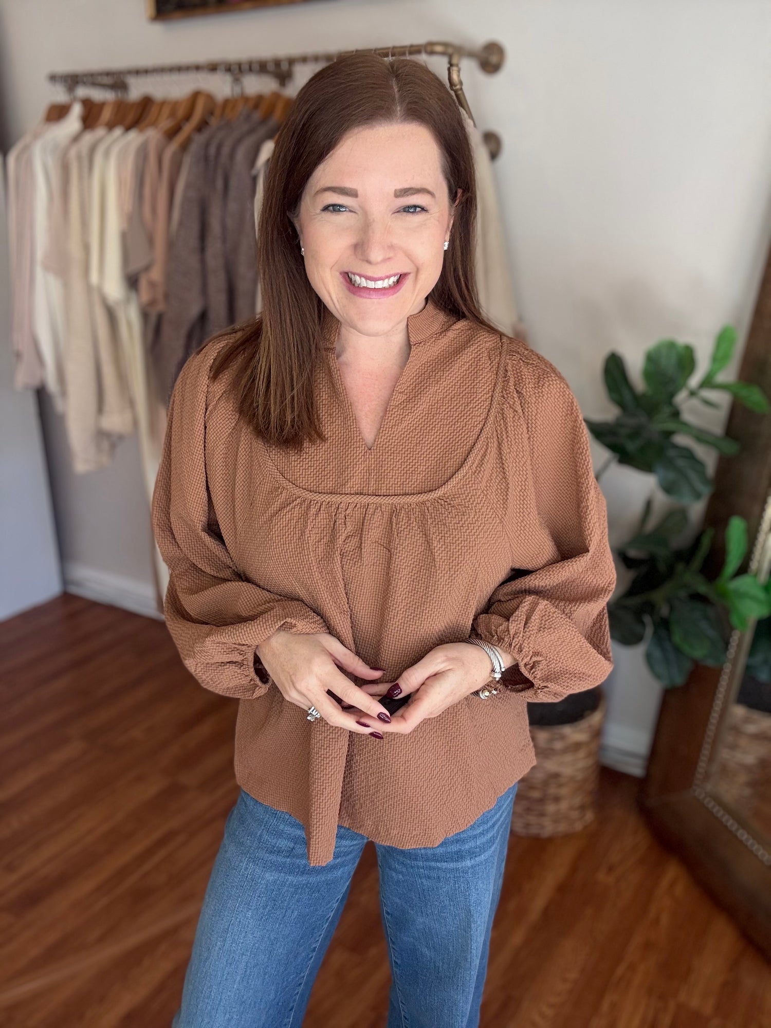 Effortlessly versatile, the Must Be the One Top features a textured fabric and relaxed silhouette that transitions seamlessly from day to night. Voluminous balloon sleeves add contemporary flair and movement, while the loose fit ensures all-day comfort. Dress it up with tailored trousers and heels for evening elegance, or keep it casual with your favorite jeans and sneakers. This is the top you'll reach for again and again—the one that works for every occasion. These have no stretch and run true to size to slightly oversized. Candace is 5'4", size 6/8, bra 38c, and wearing a small.