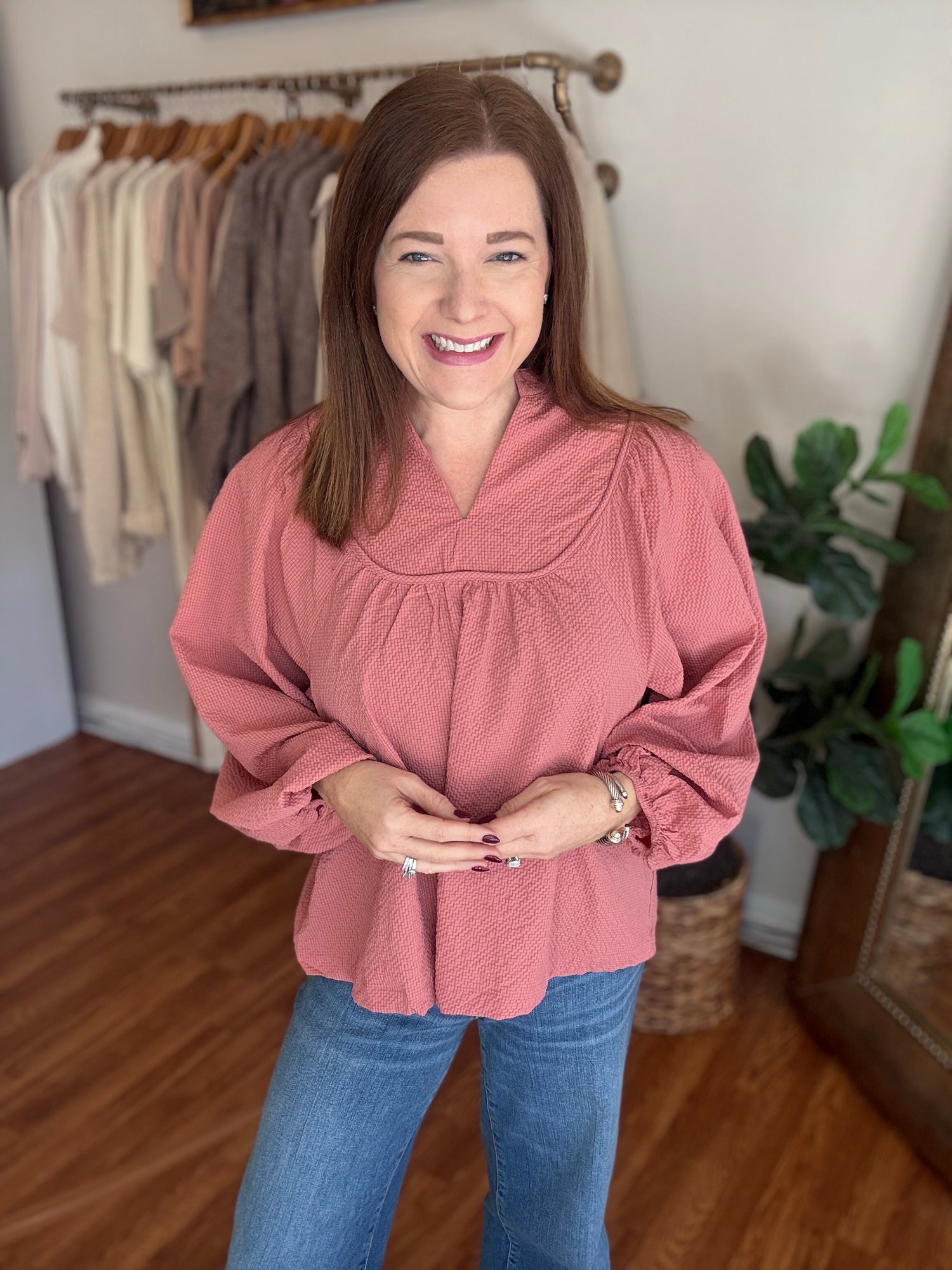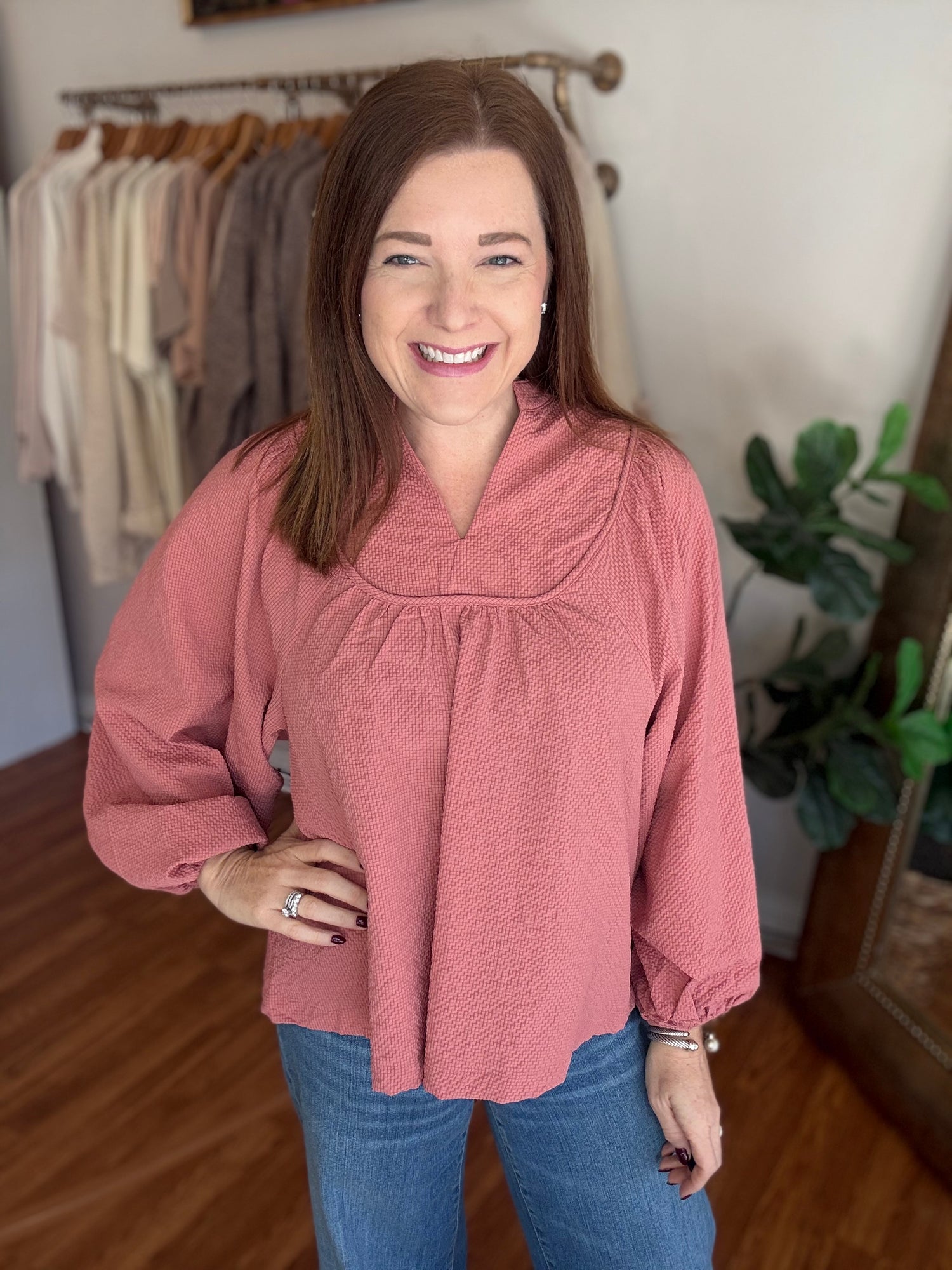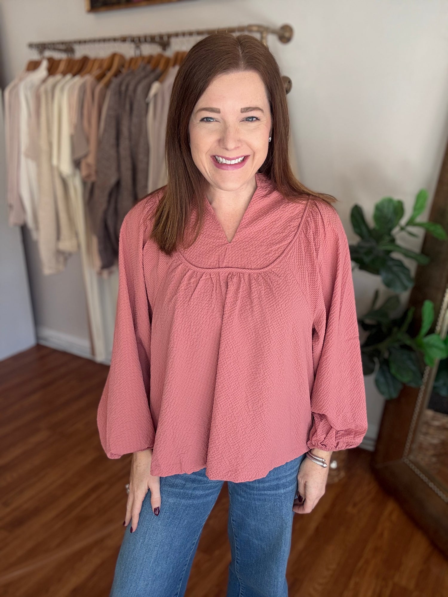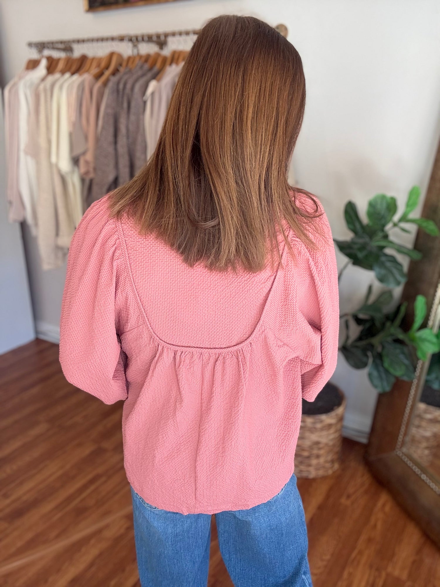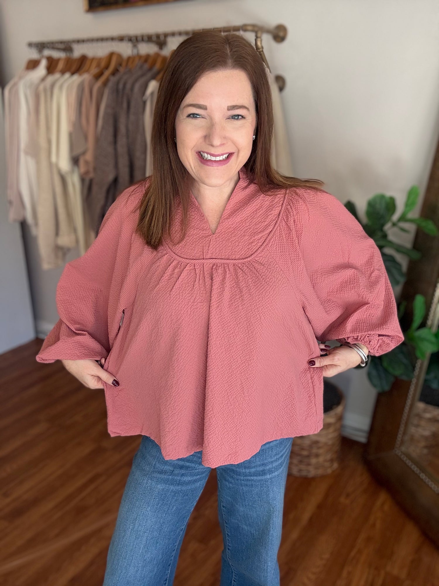 Effortlessly versatile, the Must Be the One Top in Pink features a textured fabric and relaxed silhouette that transitions seamlessly from day to night. Voluminous balloon sleeves add contemporary flair and movement, while the loose fit ensures all-day comfort. Dress it up with tailored trousers and heels for evening elegance, or keep it casual with your favorite jeans and sneakers. This is the top you'll reach for again and again—the one that works for every occasion. These have no stretch and run true to size to slightly oversized. Candace is 5'4", size 6/8, bra 38c, and wearing a small.