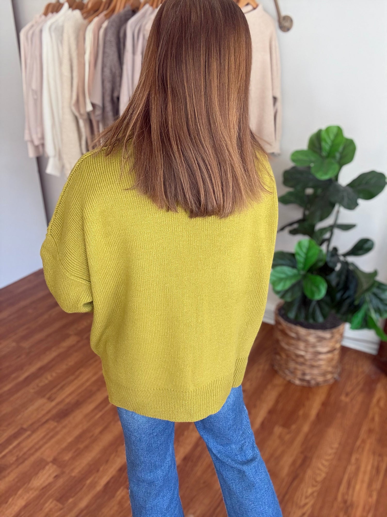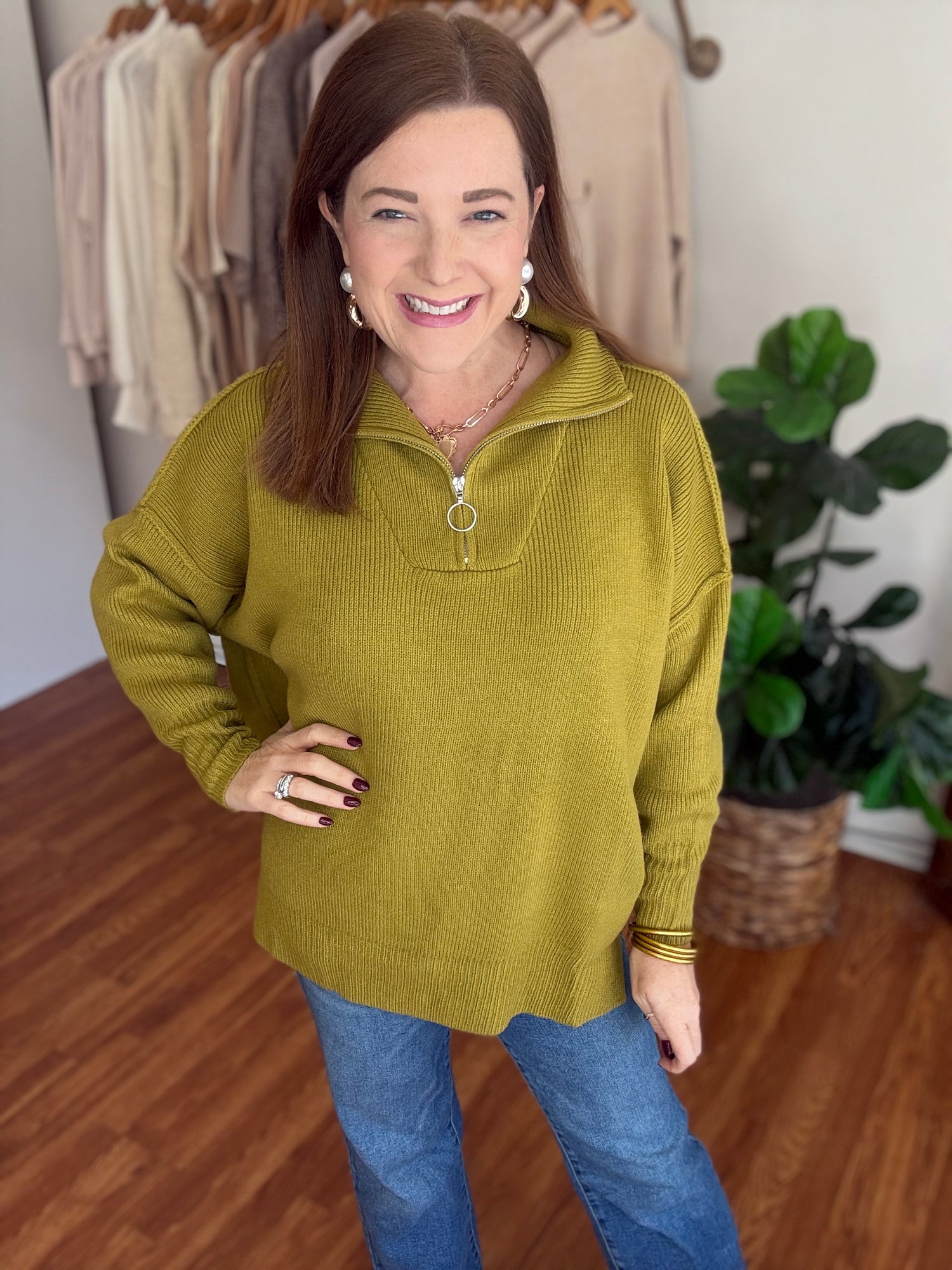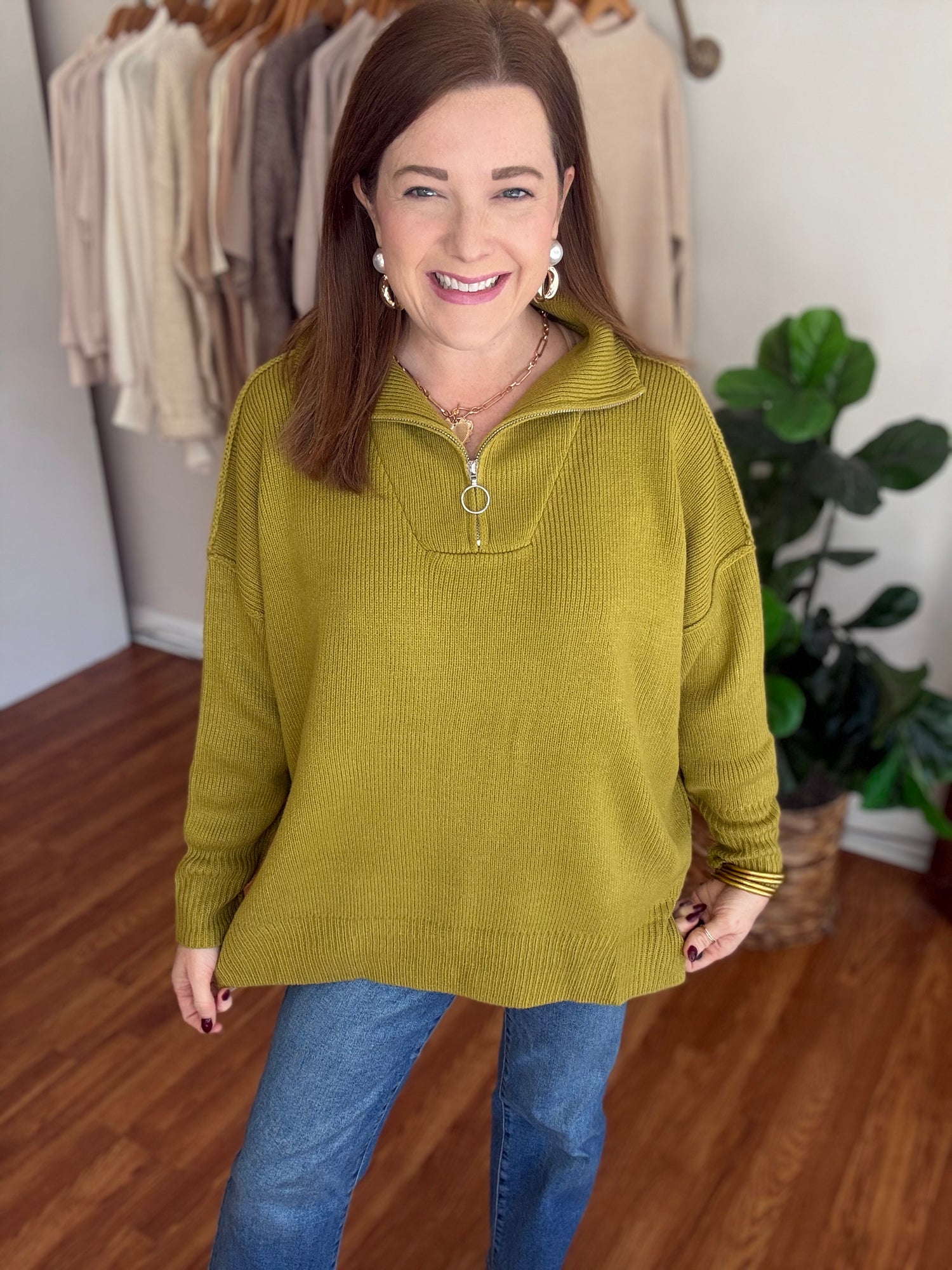 Experience ultimate comfort and style with our On Your Side Sweater. This gorgeous chartreuse color will make you stand out in any crowd. The half zip allows for easy layering, while the loose and relaxed fit provides maximum comfort. Elevate your wardrobe and stay on trend with this must-have piece! These run generous in size. Candace is 5’4”, size 6/8, bra 38c, and wearing a small.