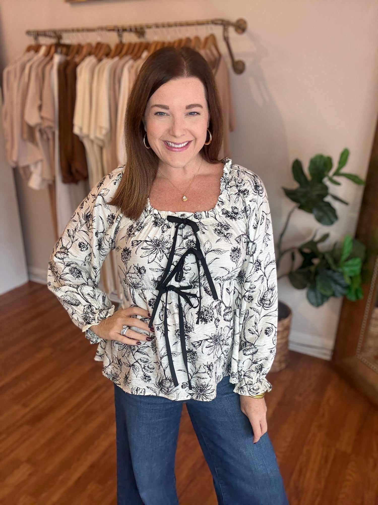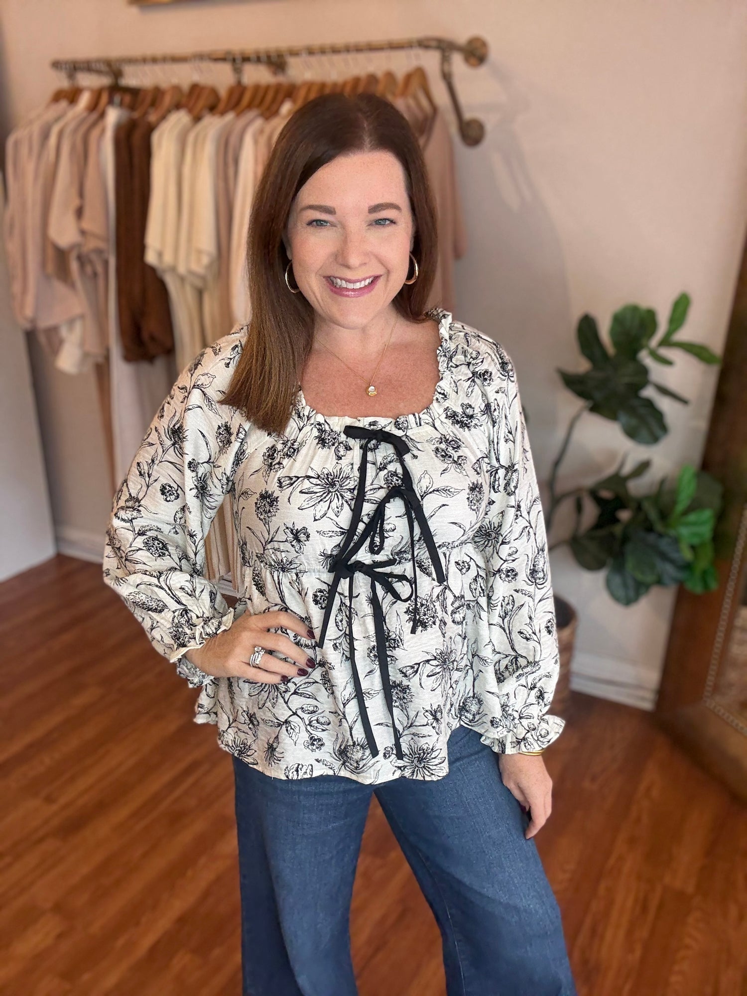 The Out for the Day Top combines timeless black and off-white floral patterns with a flattering babydoll fit for effortless style. Its square neckline and delicate bow detail add a feminine touch, while the stretchy smocking in the back ensures a comfortable, tailored fit all day long. Perfect for any occasion, this top blends elegance with ease. These have no stretch and run true to size. Candace is 5'4", size 6/8, bra 38c, and wearing a small.