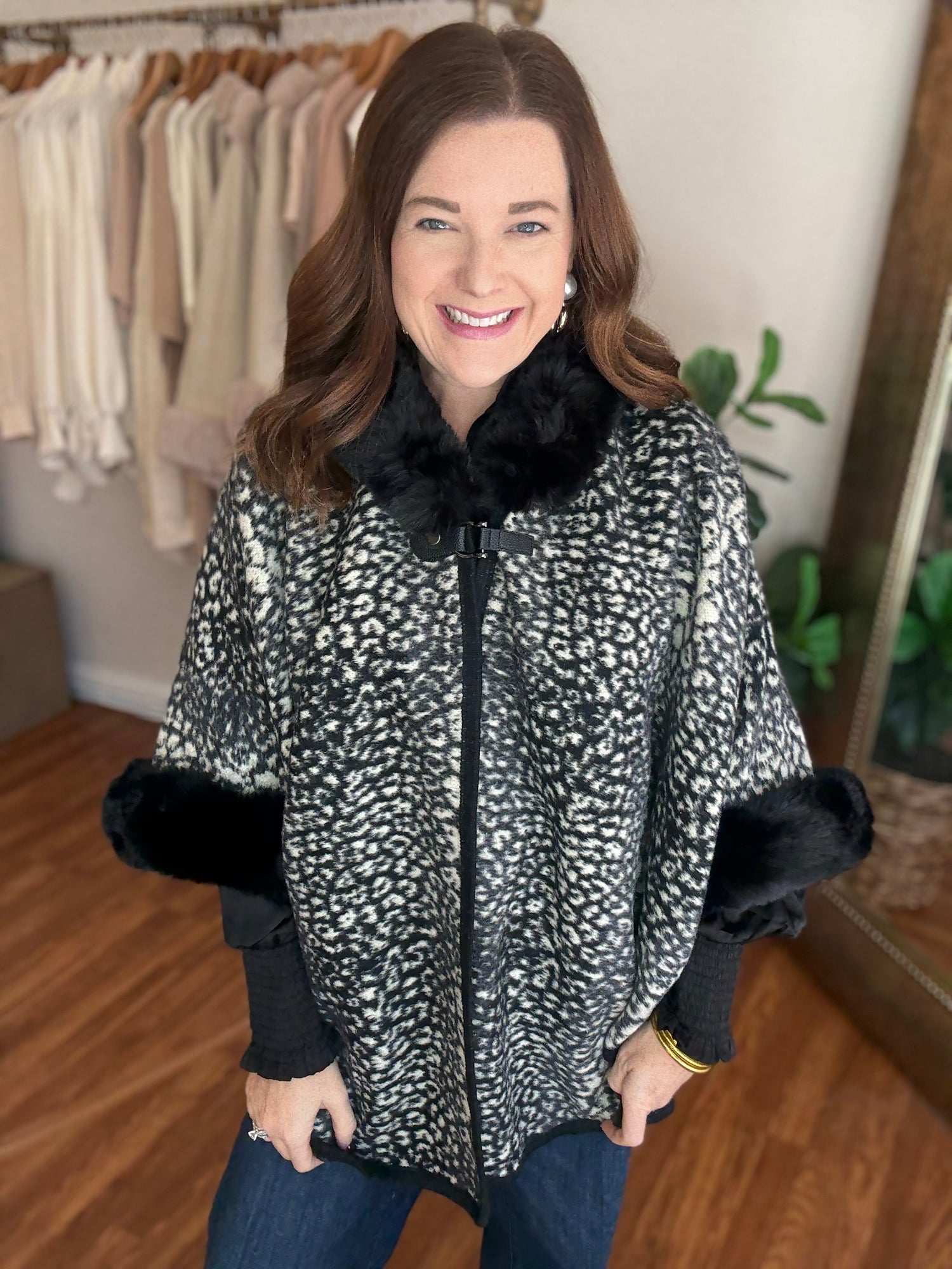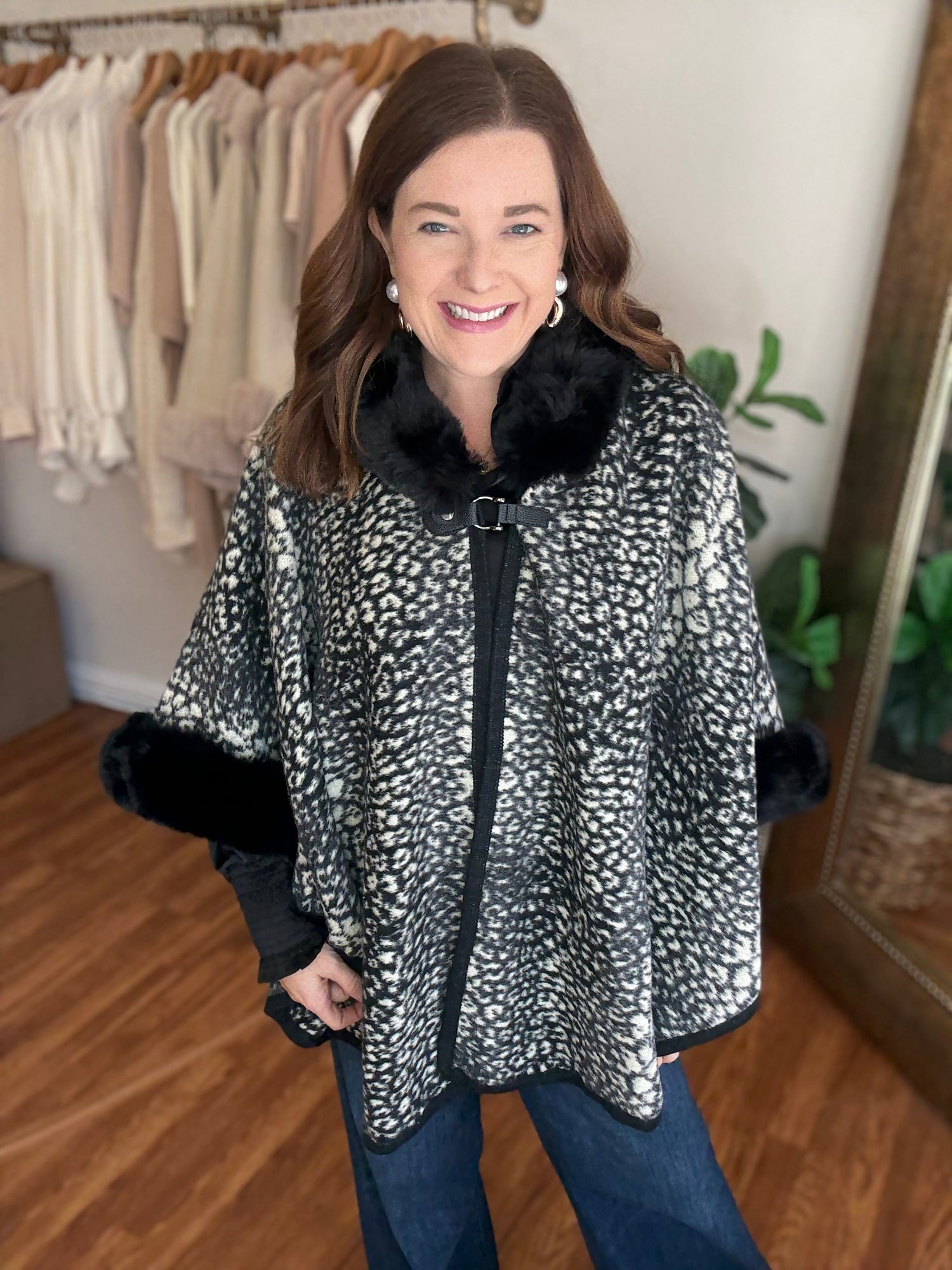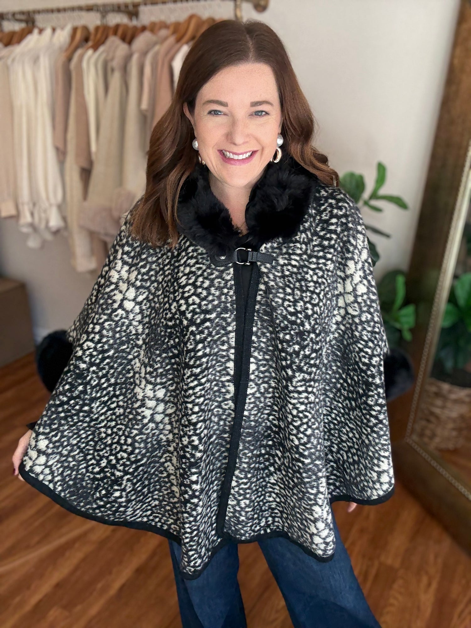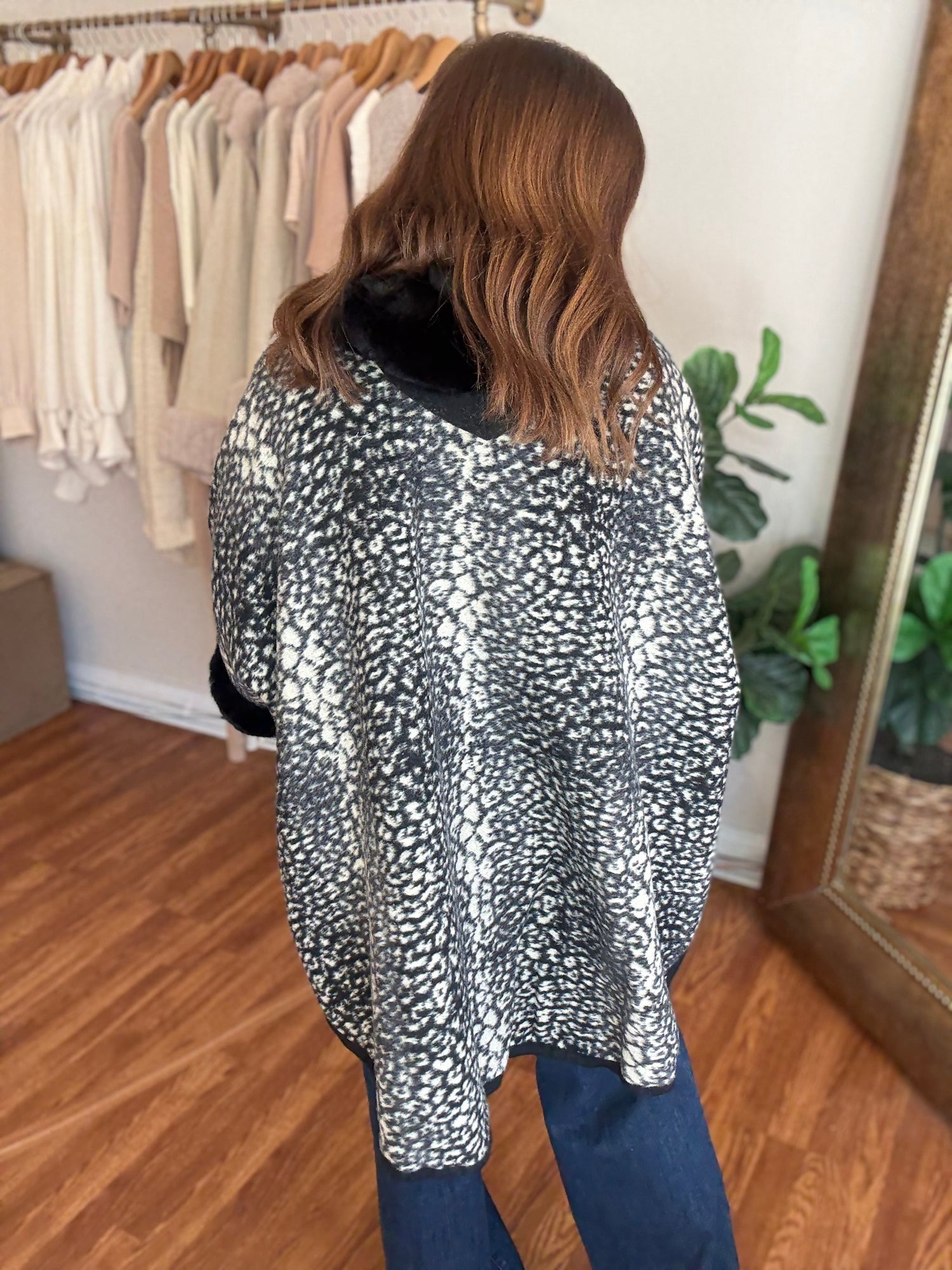 Indulge in luxury with the Park Avenue Poncho! This trendy poncho features a faux fur trim and stylish animal print, adding a touch of elegance to any outfit. Wrap yourself in soft, luxurious comfort and elevate your style with this must-have piece. These run generous in size. Candace is wearing a small/medium.