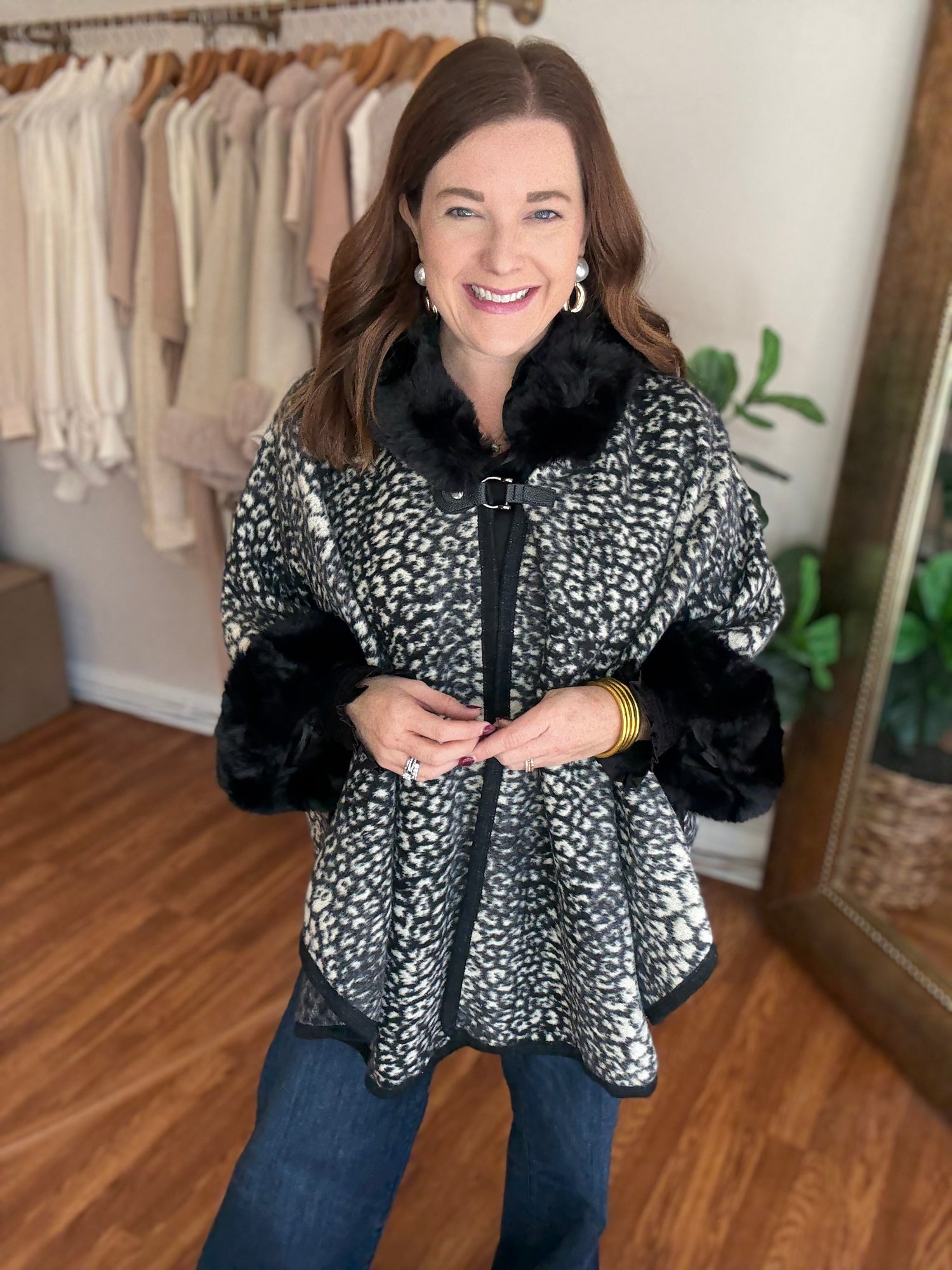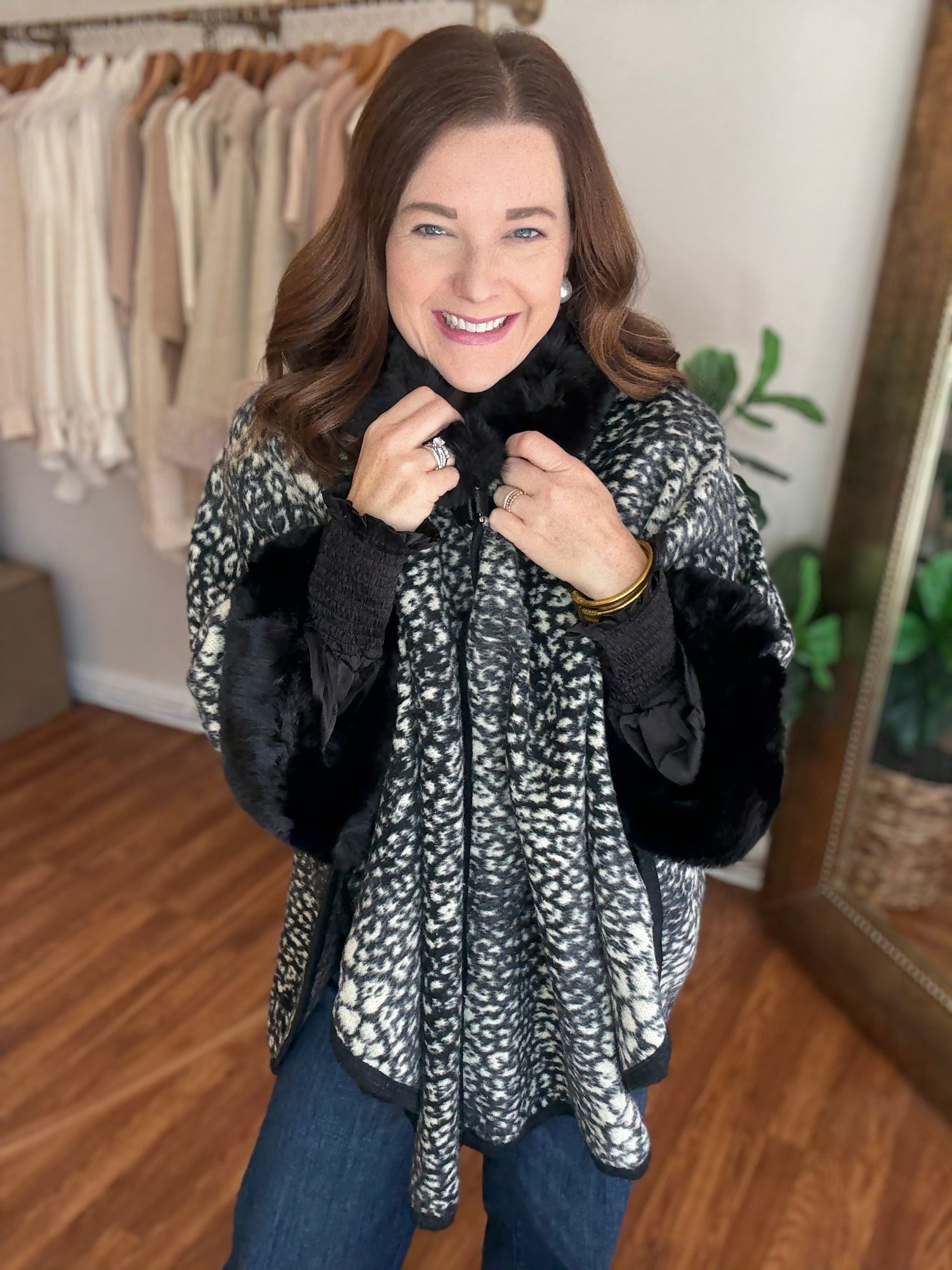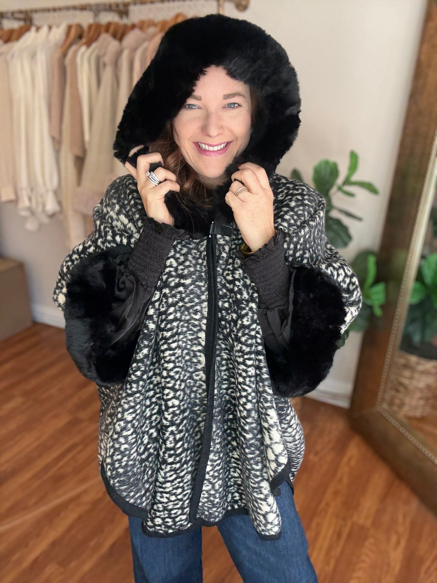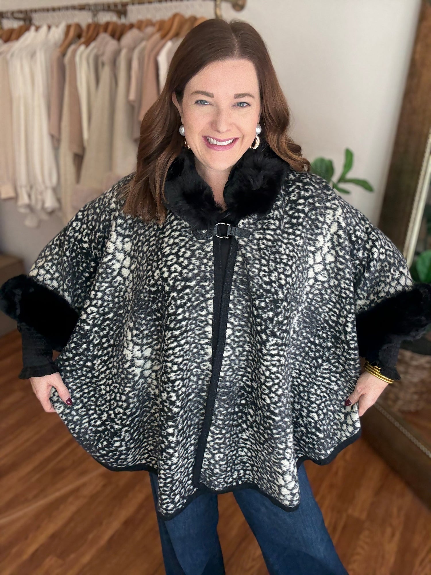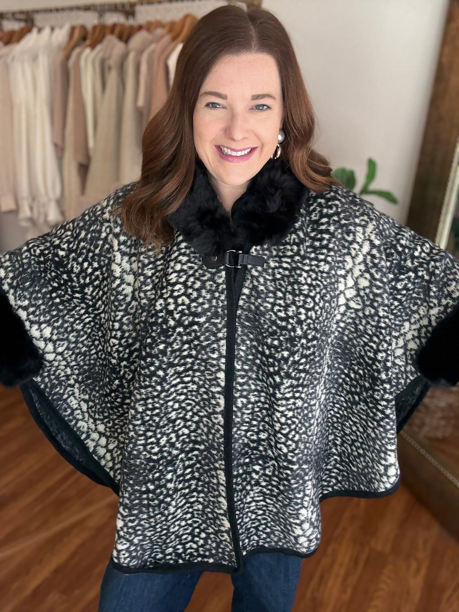 Indulge in luxury with the Park Avenue Poncho! This trendy poncho features a faux fur trim and stylish animal print, adding a touch of elegance to any outfit. Wrap yourself in soft, luxurious comfort and elevate your style with this must-have piece. These run generous in size. Candace is wearing a small/medium.