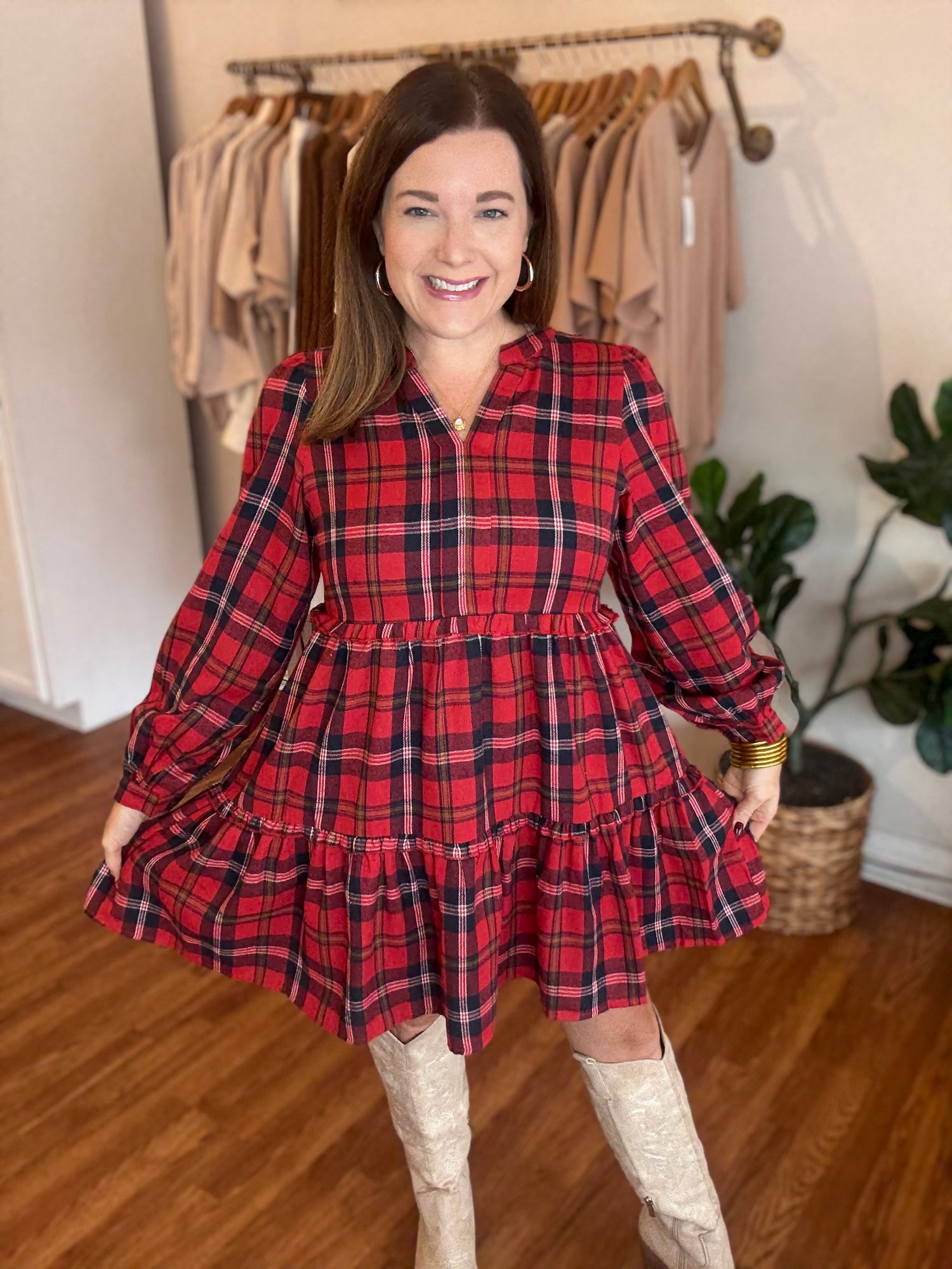 Embrace cozy elegance with the Plaid You're Here Dress. Featuring a timeless plaid print and a flattering babydoll silhouette with a tiered bottom, this dress offers both comfort and style. Practical pockets add everyday convenience, making it ideal for fall outings or festive holiday gatherings. Elevate your wardrobe with this perfect seasonal staple. These have no stretch and are fitted through the top and flowy through the bottom. We recommend sizing up if you are busty. Candace is 5'4", size 6/8, bra 38c, and wearing a small.