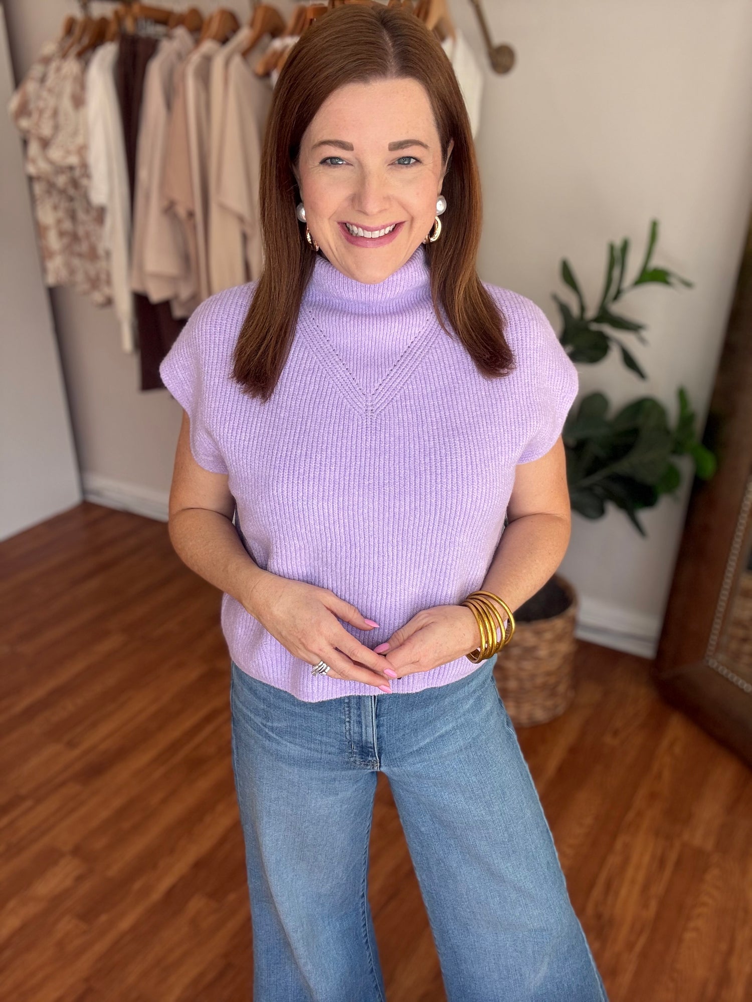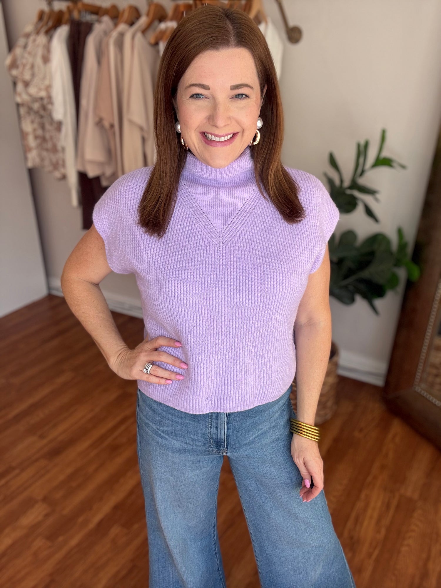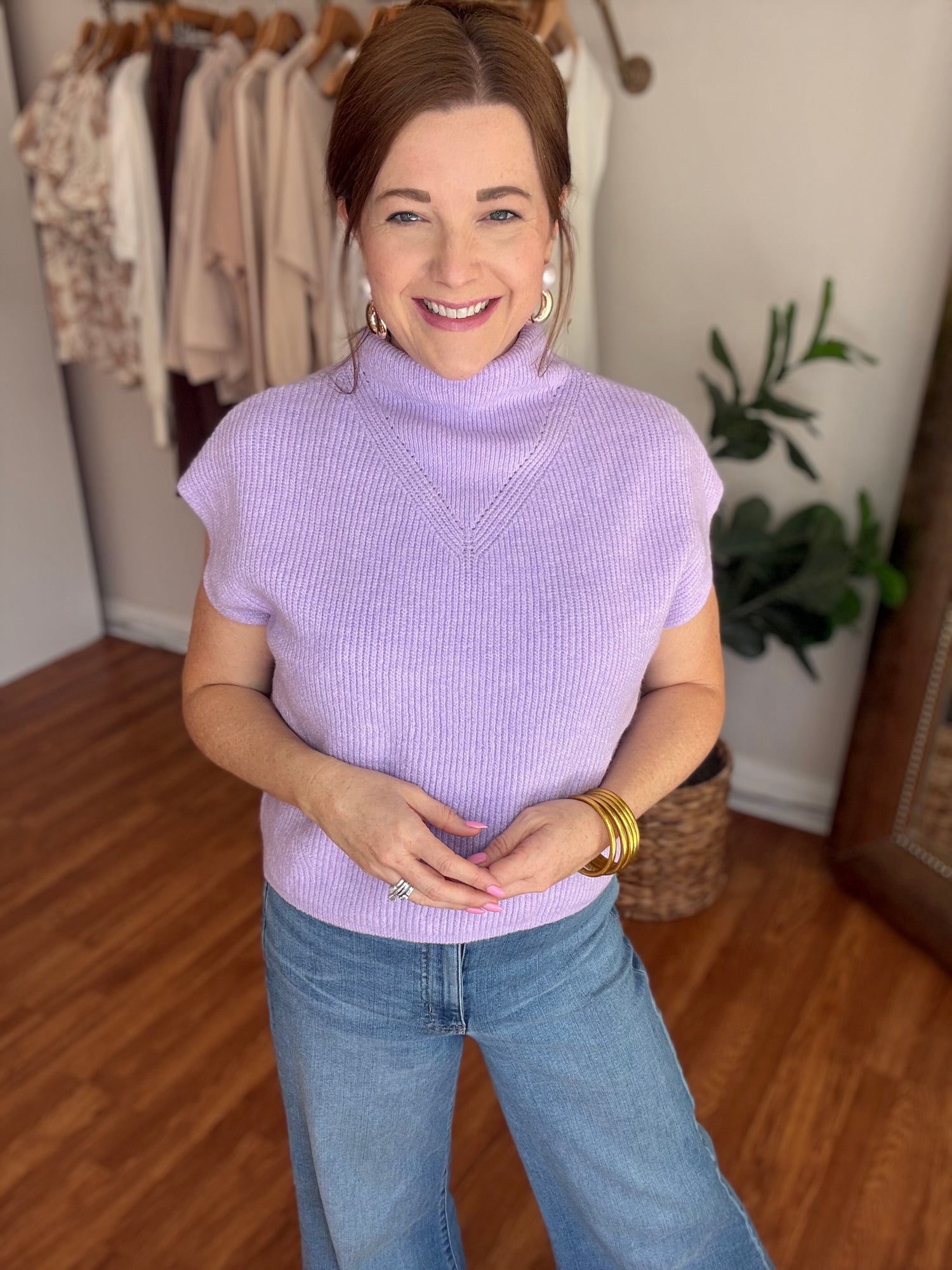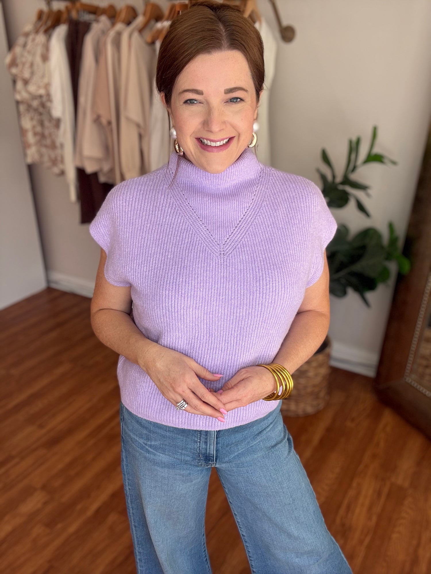Embrace effortless elegance with the Smile About It Sweater. This charming short sleeve design features a sophisticated high neckline that flatters every frame. Crafted in a gorgeous spring lilac hue, it's the perfect layering piece for transitional weather. Soft, comfortable, and versatile enough to pair with your favorite denim or skirts. A wardrobe essential that brings joy to your everyday style. These run true to size. Candace is 5'4", size 6/8, bra 38c, and wearing a small.
