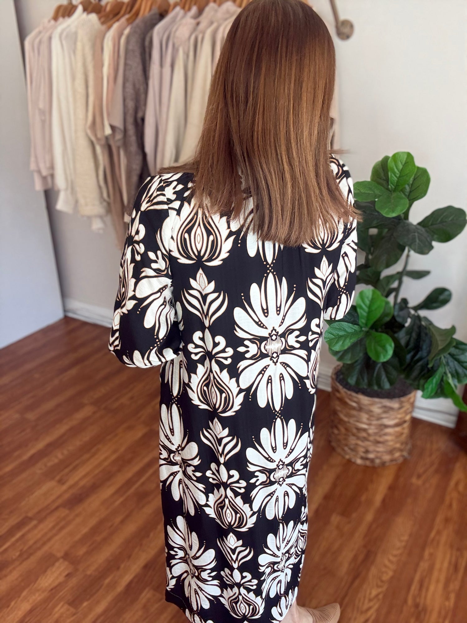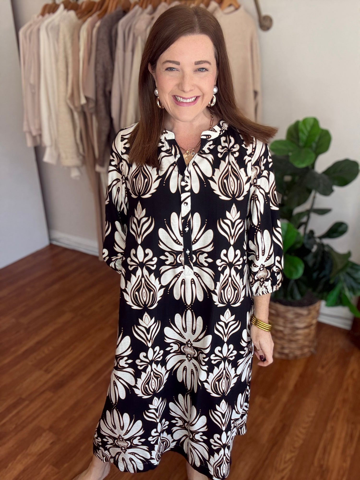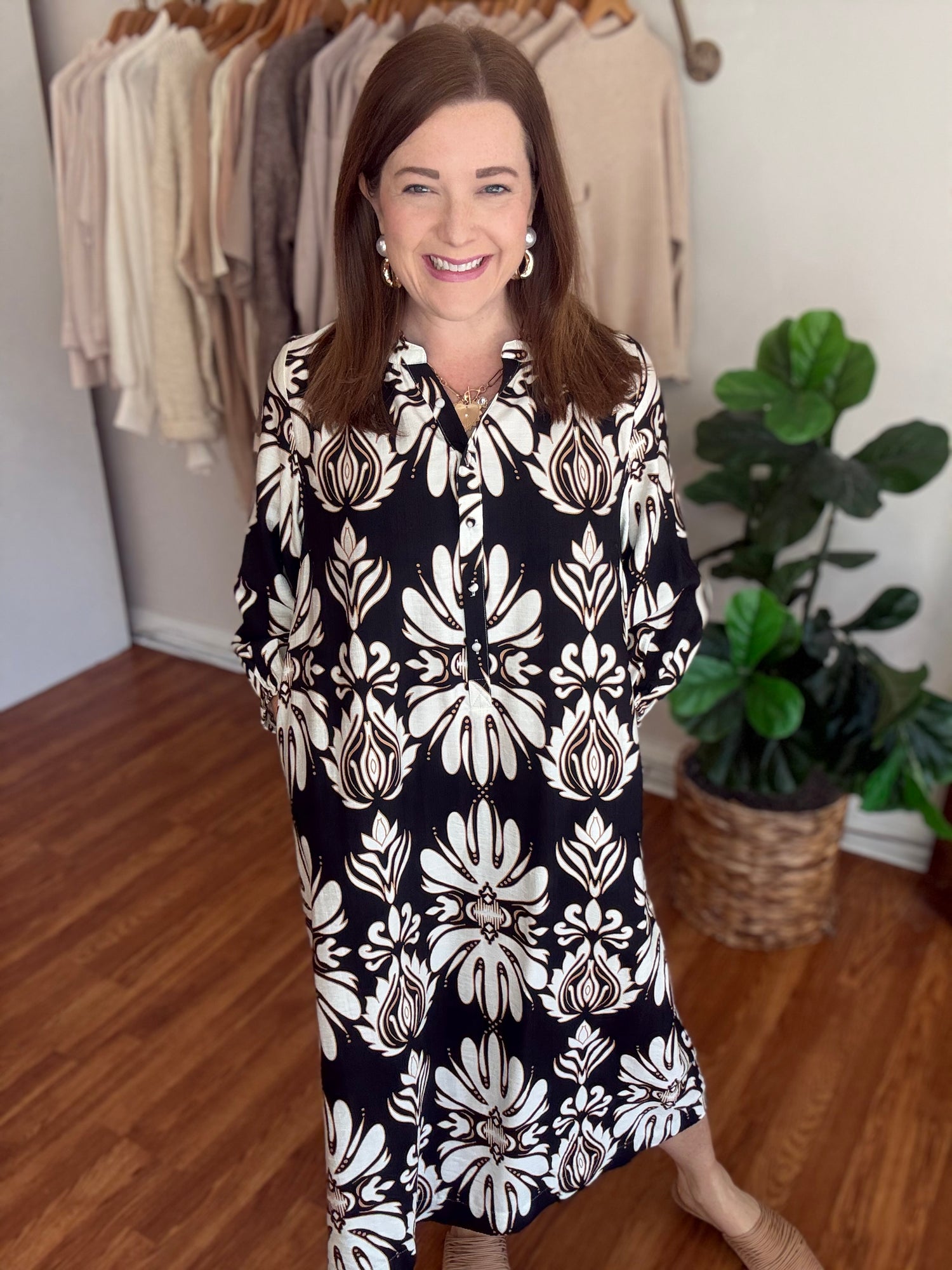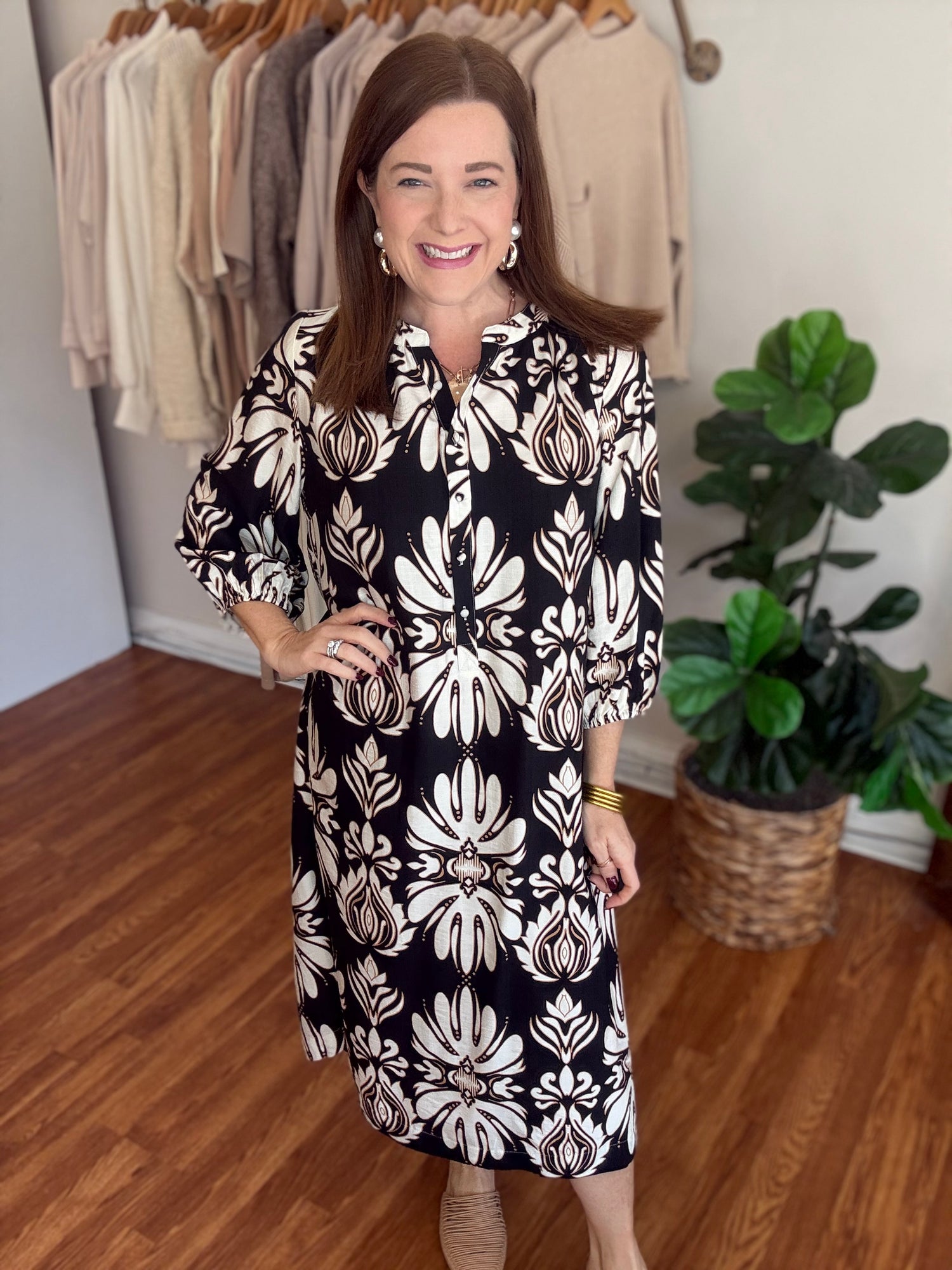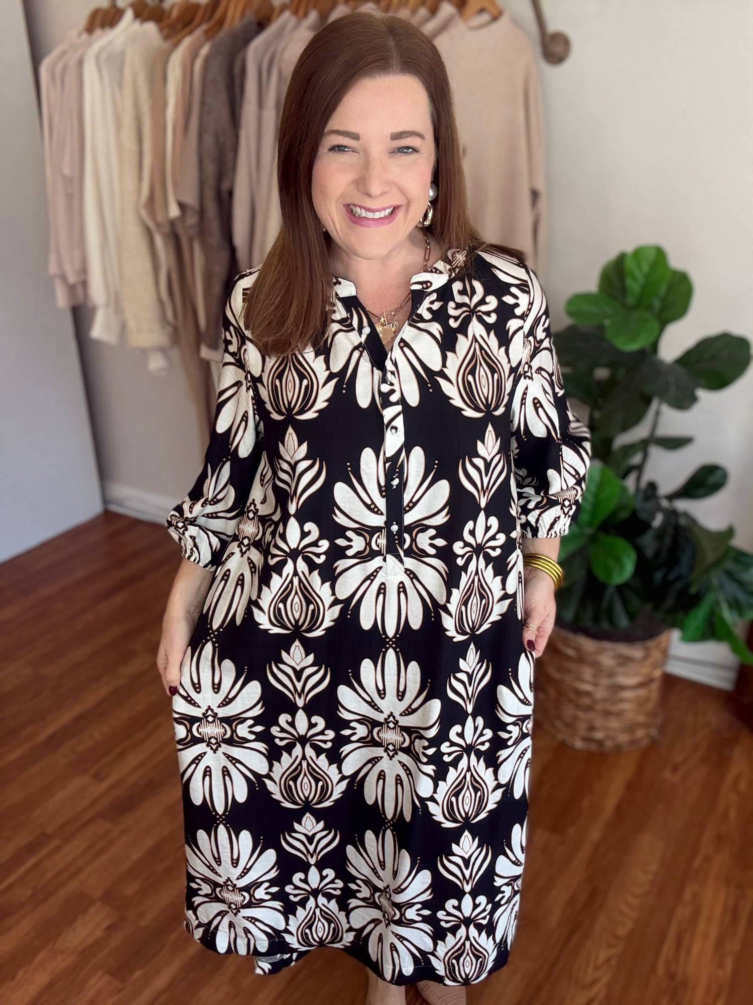 Turn heads with our Speak Up Dress! The trendy print in classic black and white will make a statement wherever you go. Plus, it features pockets and a classic, straight fit midi for comfort and style. Be confident and stylish with this must-have dress! These have no stretch and fit loosely. Candace is 5’4”, size 6/8, bra 38c, and wearing a small.