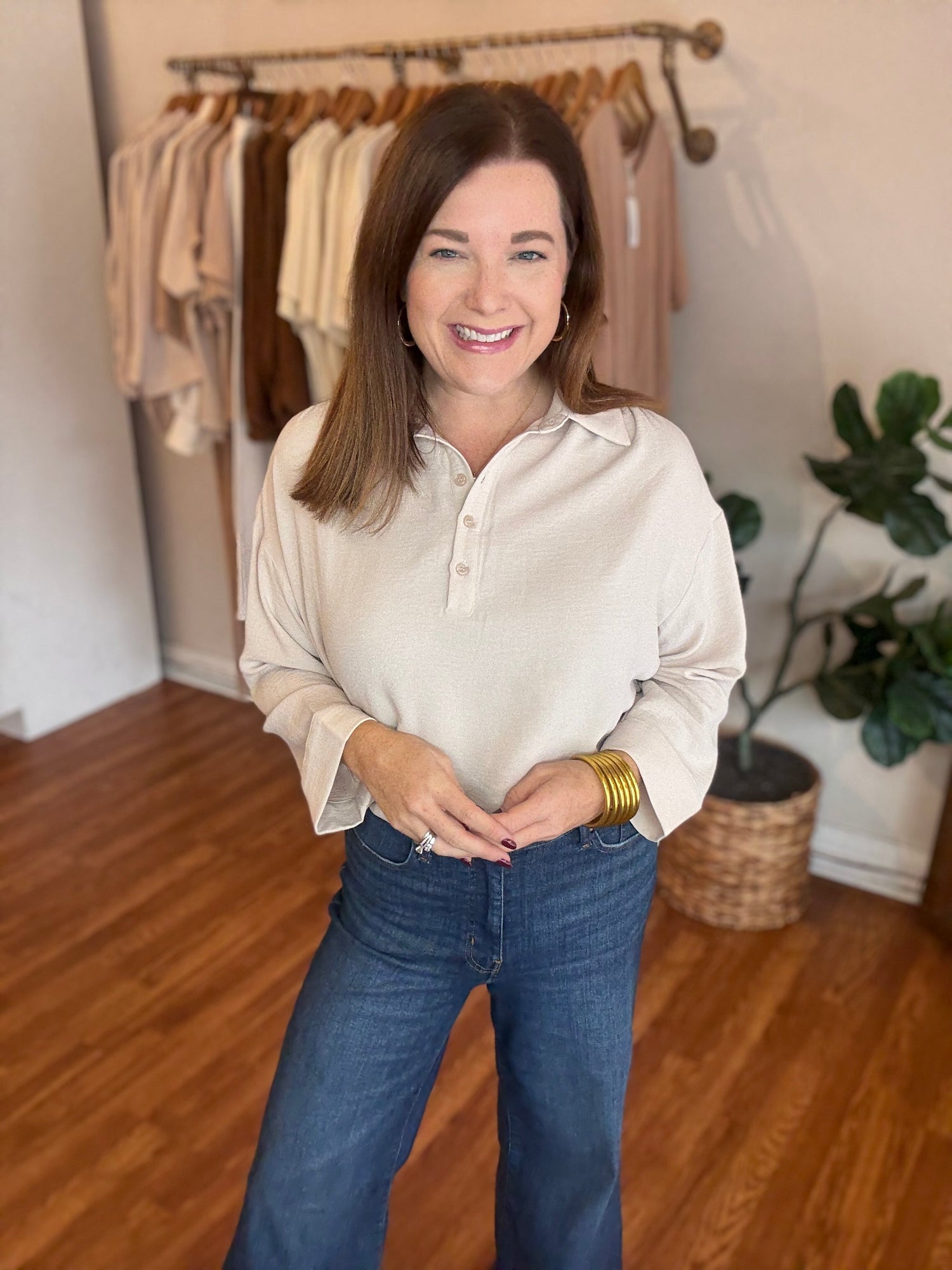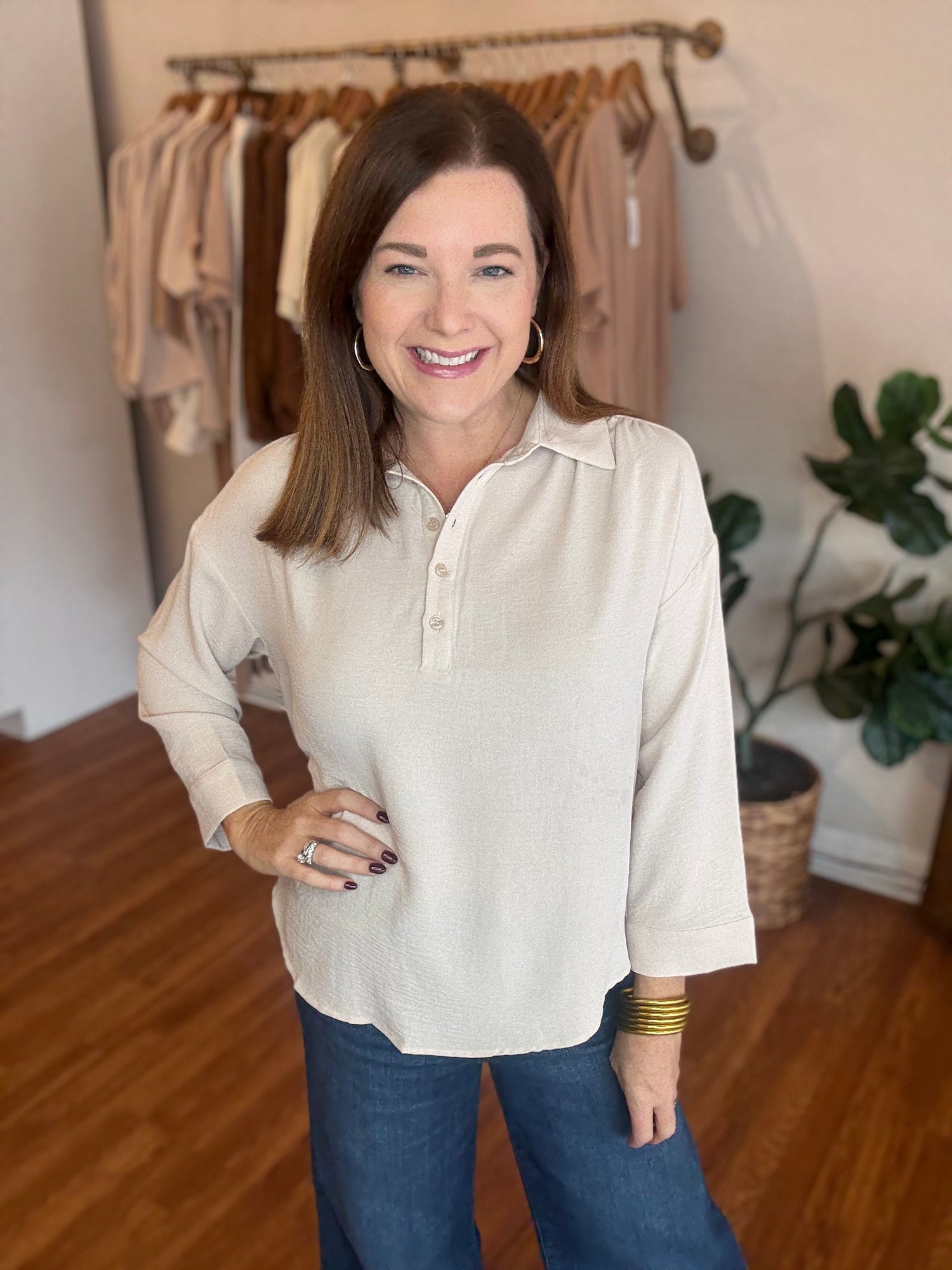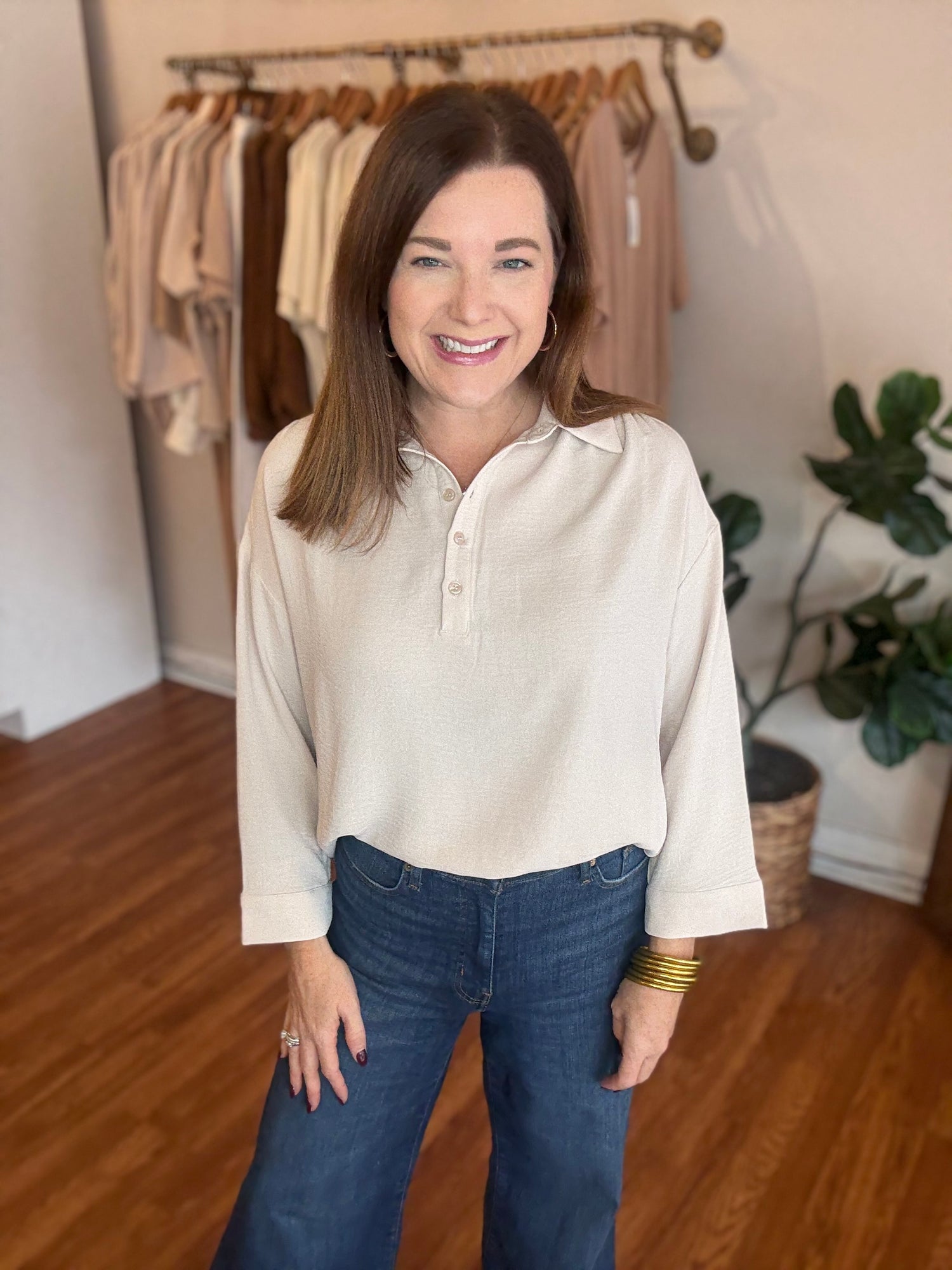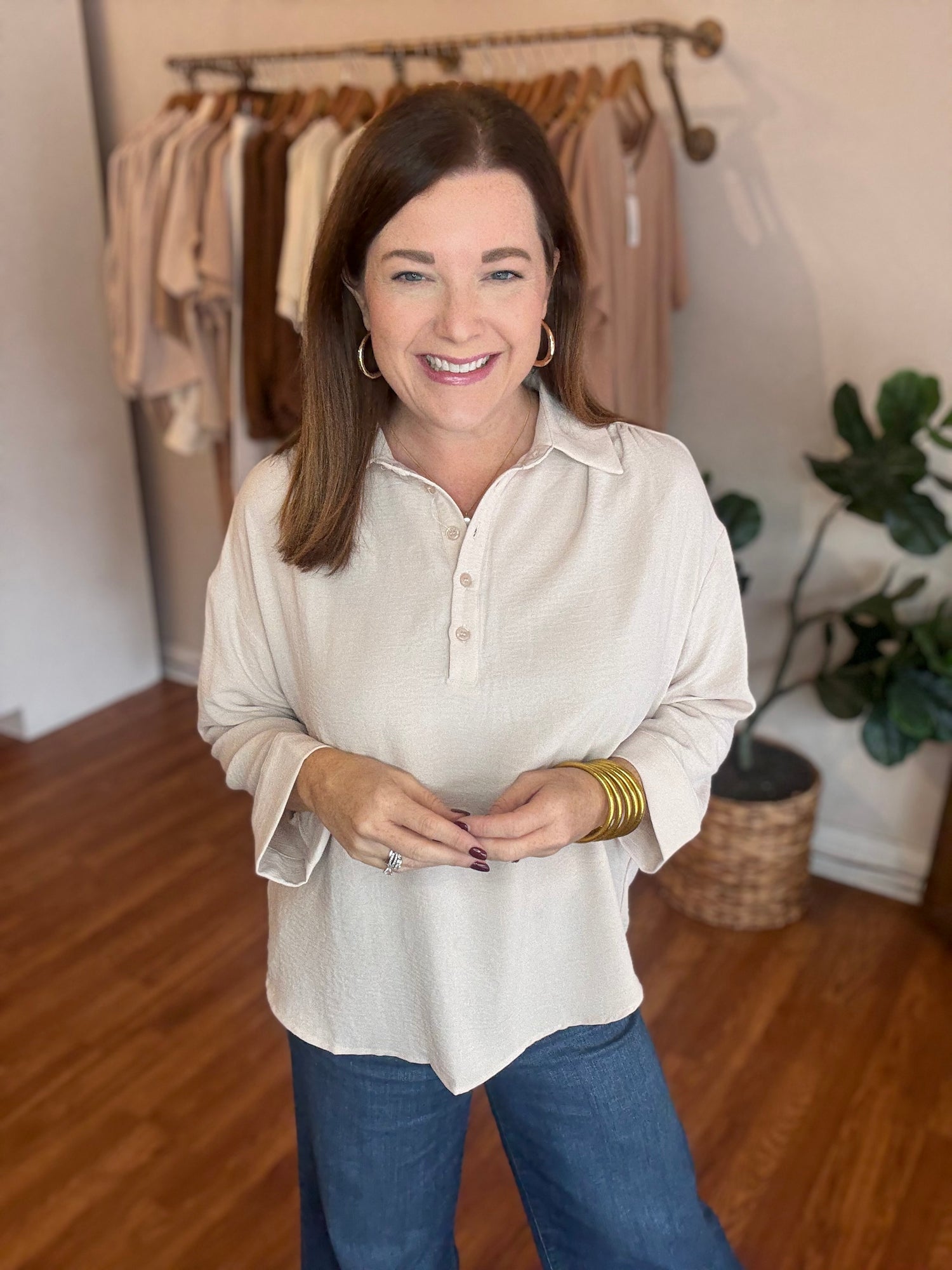 Effortlessly stylish with a classic fit, this neutral top is a must-have for any wardrobe. The buttons and collar add a touch of sophistication while the loose fit ensures maximum comfort. Stay in your sights with this eye-catching top! These have no stretch and run true to size. Candace is 5’4”, size 6/8, bra 38c, and wearing a small.