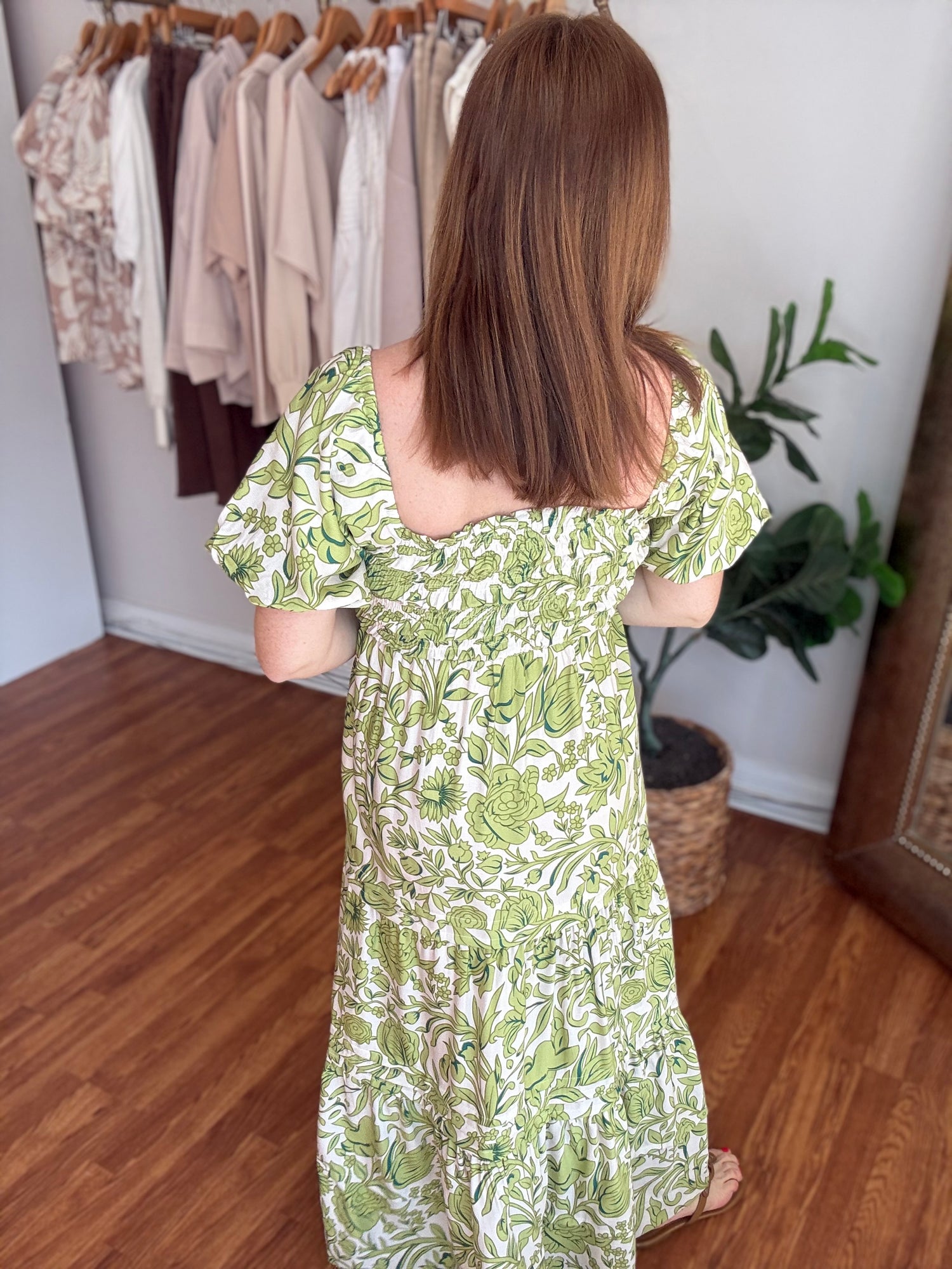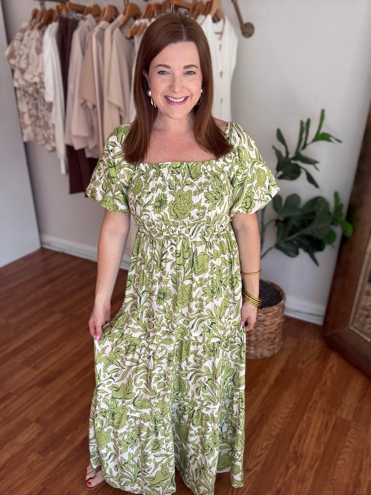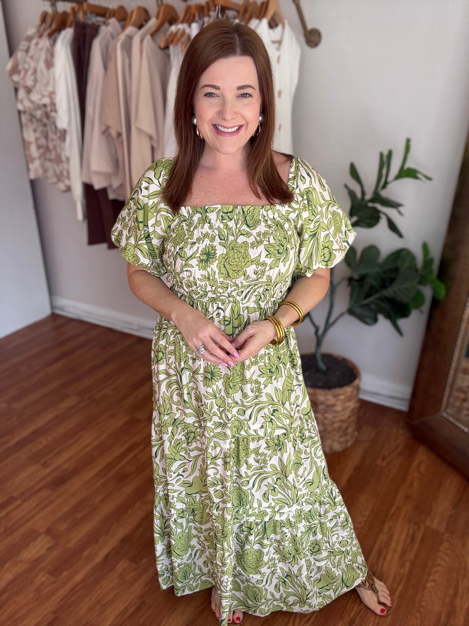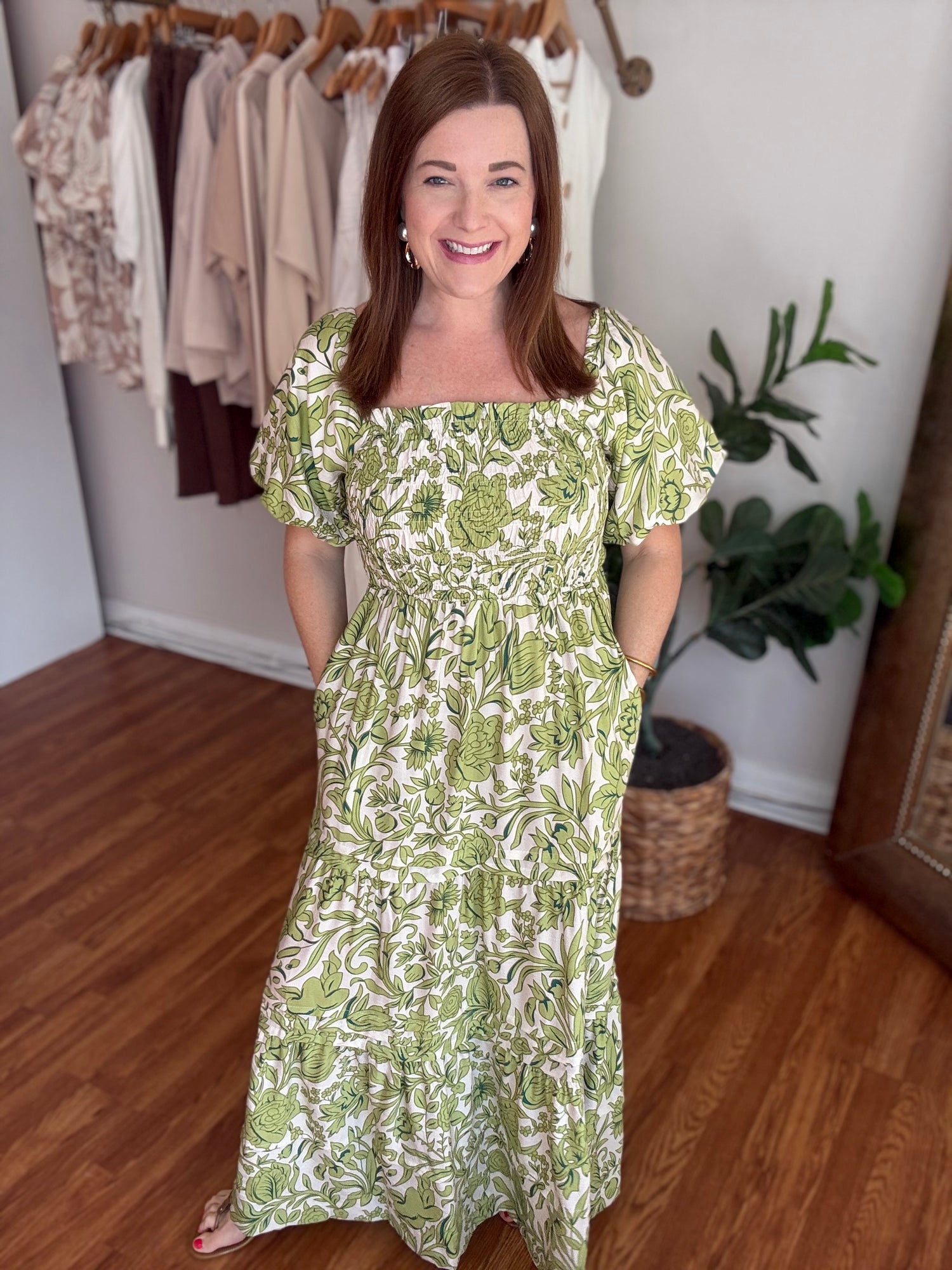 Embrace effortless elegance in this Sunshine Season Maxi, featuring a vibrant green floral print that captures the essence of warm weather style. The stretchy smocking across the top provides a flattering, comfortable fit that moves with you throughout the day. Practical hidden pockets keep your essentials within reach without compromising the dress's graceful silhouette. Perfect for garden parties, casual outings, or any occasion that calls for relaxed sophistication. These have no stretch and run true to size. Candace is 5'4", size 6/8, bra 38c, and wearing a small.