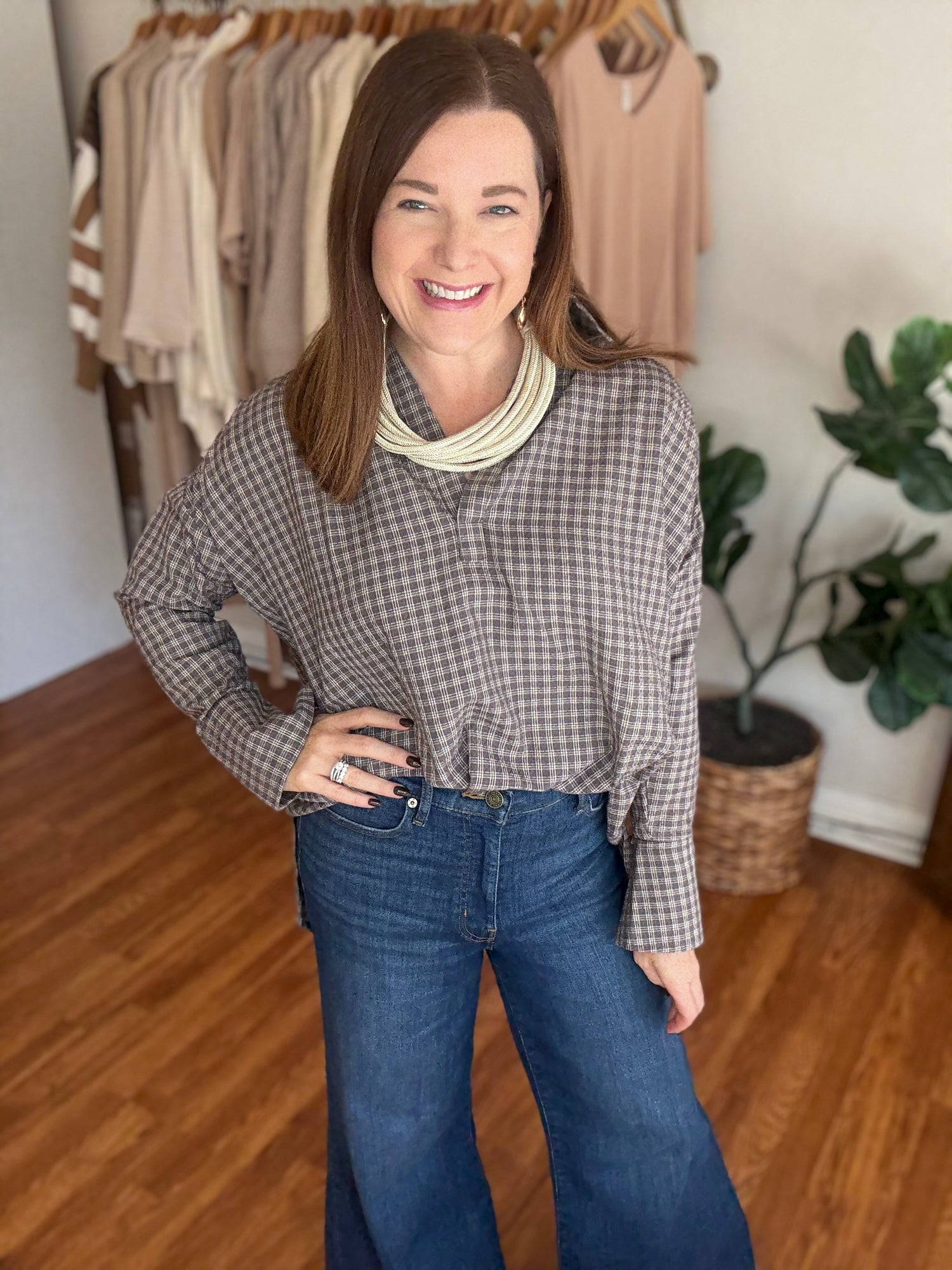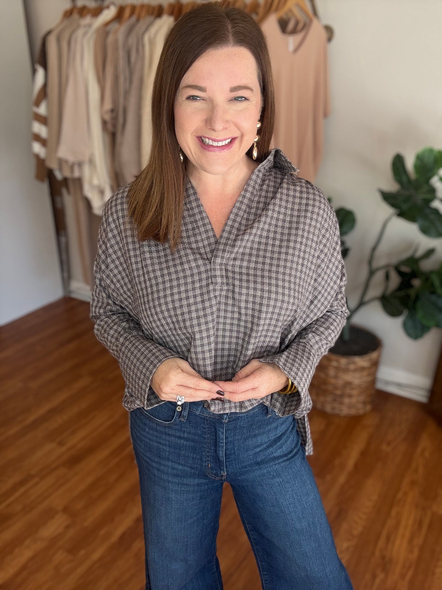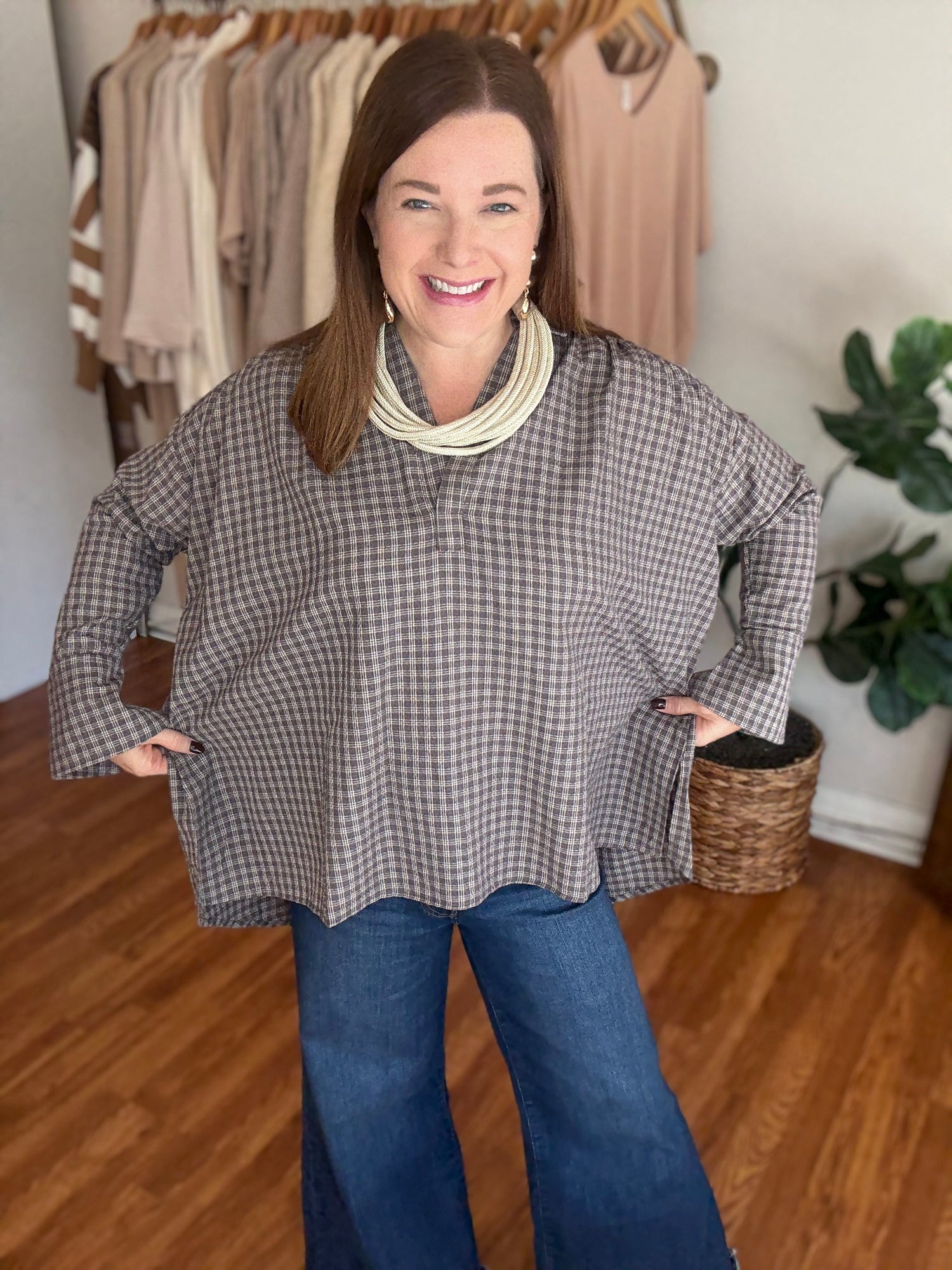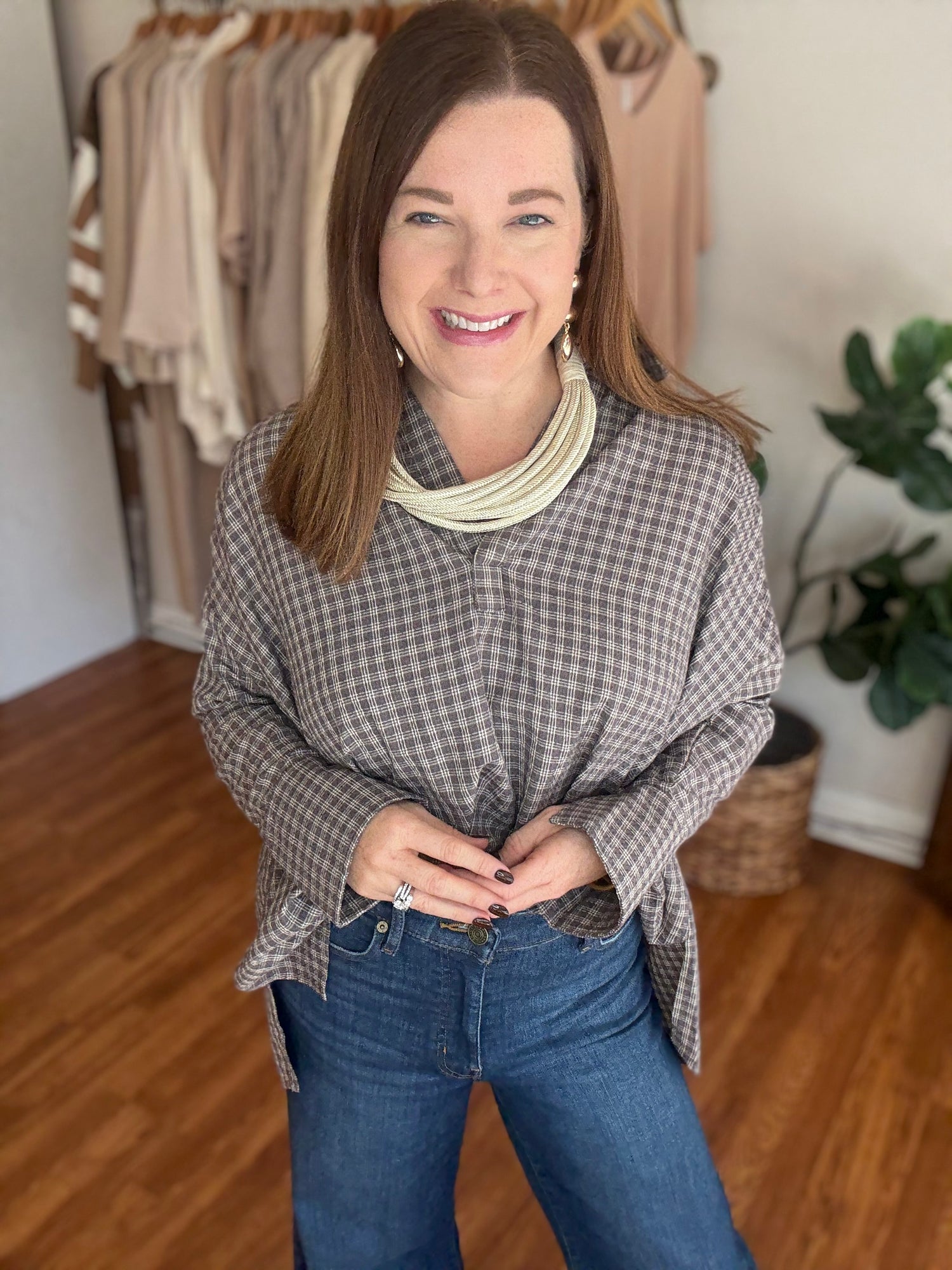 Step into style with our Take Your Chance Top! This loose, oversized top in a neutral plaid design offers both comfort and fashion. Complete with cuff sleeves, this top will quickly become your go-to choice for a chic and effortless look. Don't miss your chance to elevate your wardrobe! These have no stretch and run very generous in size. We recommend sizing down. Candace is 5’4”, size 6/8, bra 38c, and wearing a small.