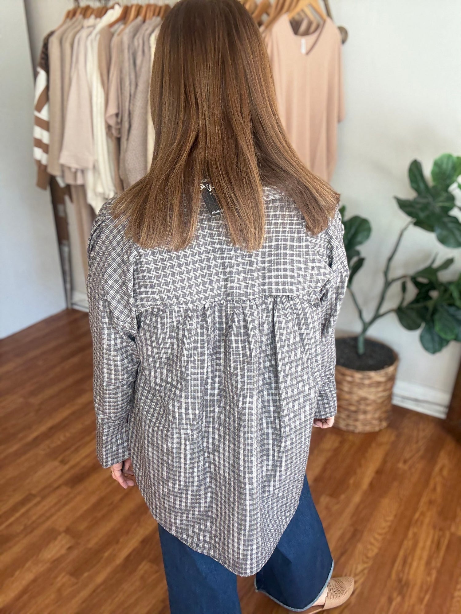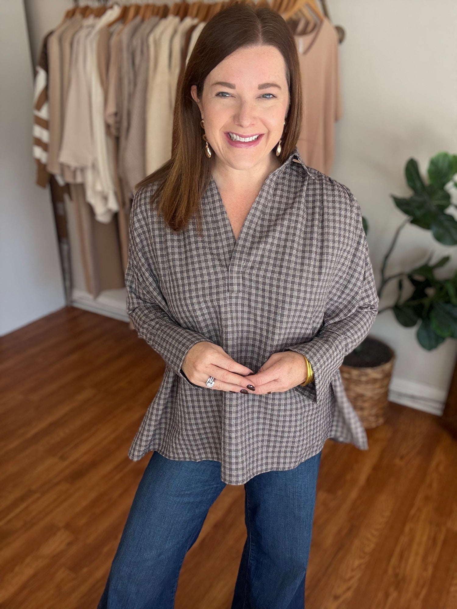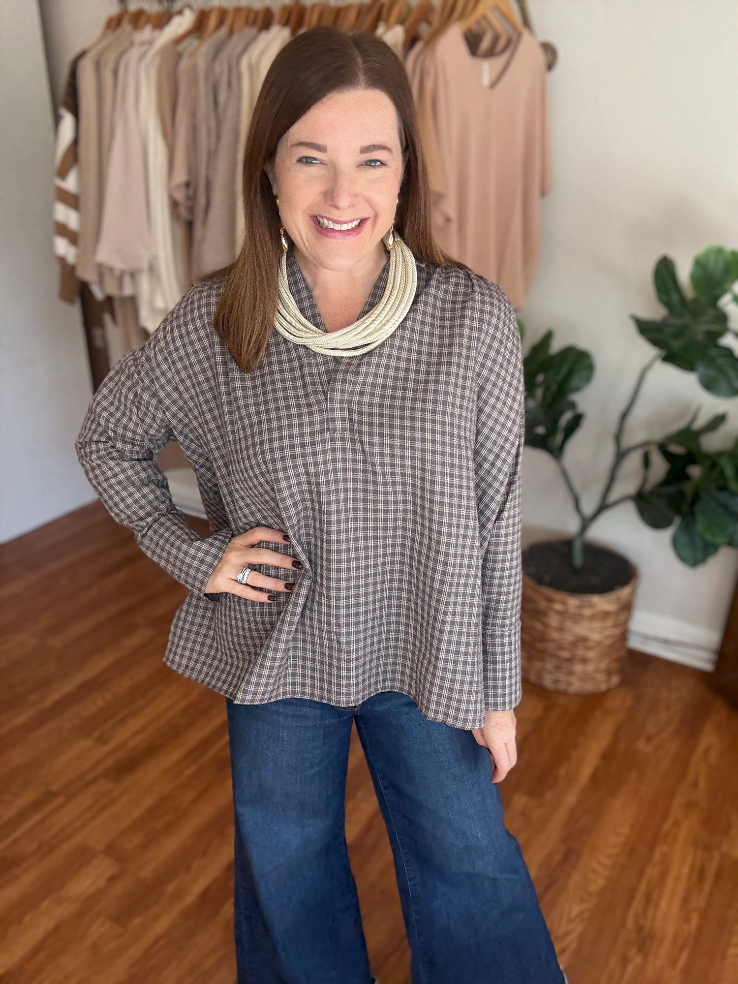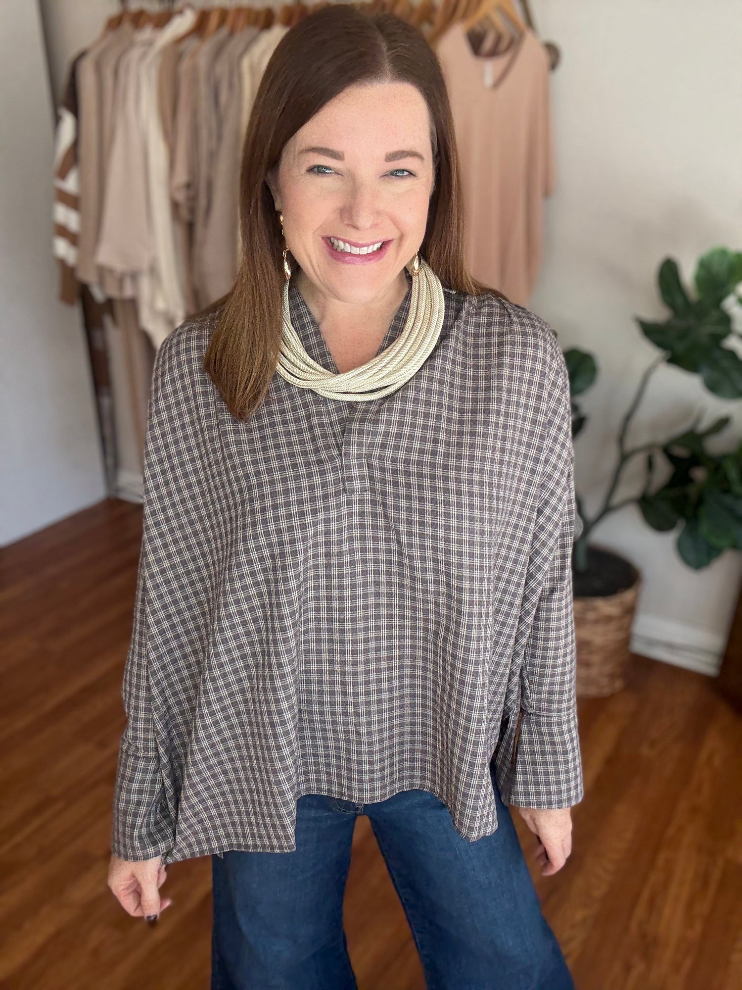 Step into style with our Take Your Chance Top! This loose, oversized top in a neutral plaid design offers both comfort and fashion. Complete with cuff sleeves, this top will quickly become your go-to choice for a chic and effortless look. Don't miss your chance to elevate your wardrobe! These have no stretch and run very generous in size. We recommend sizing down. Candace is 5’4”, size 6/8, bra 38c, and wearing a small.