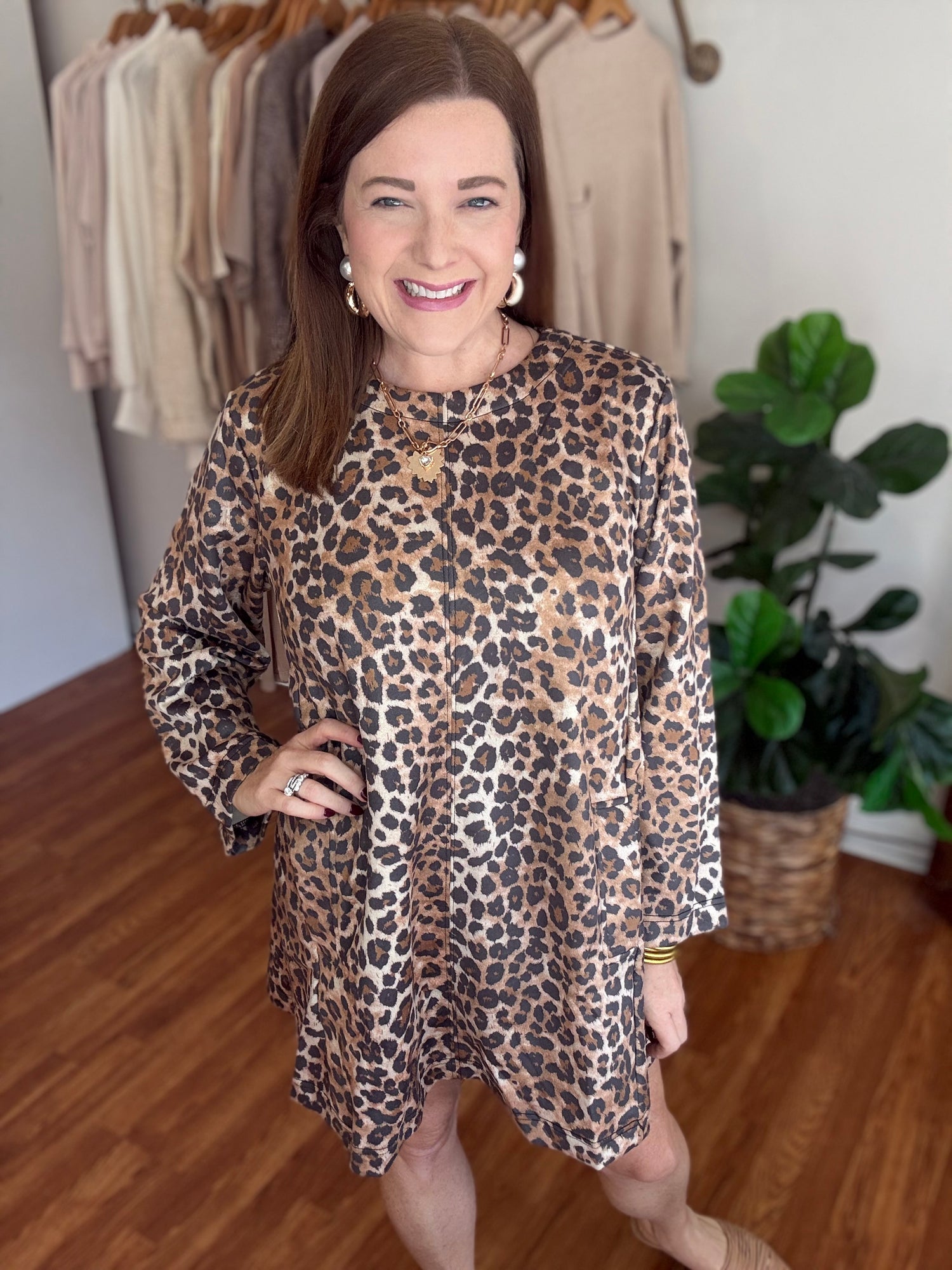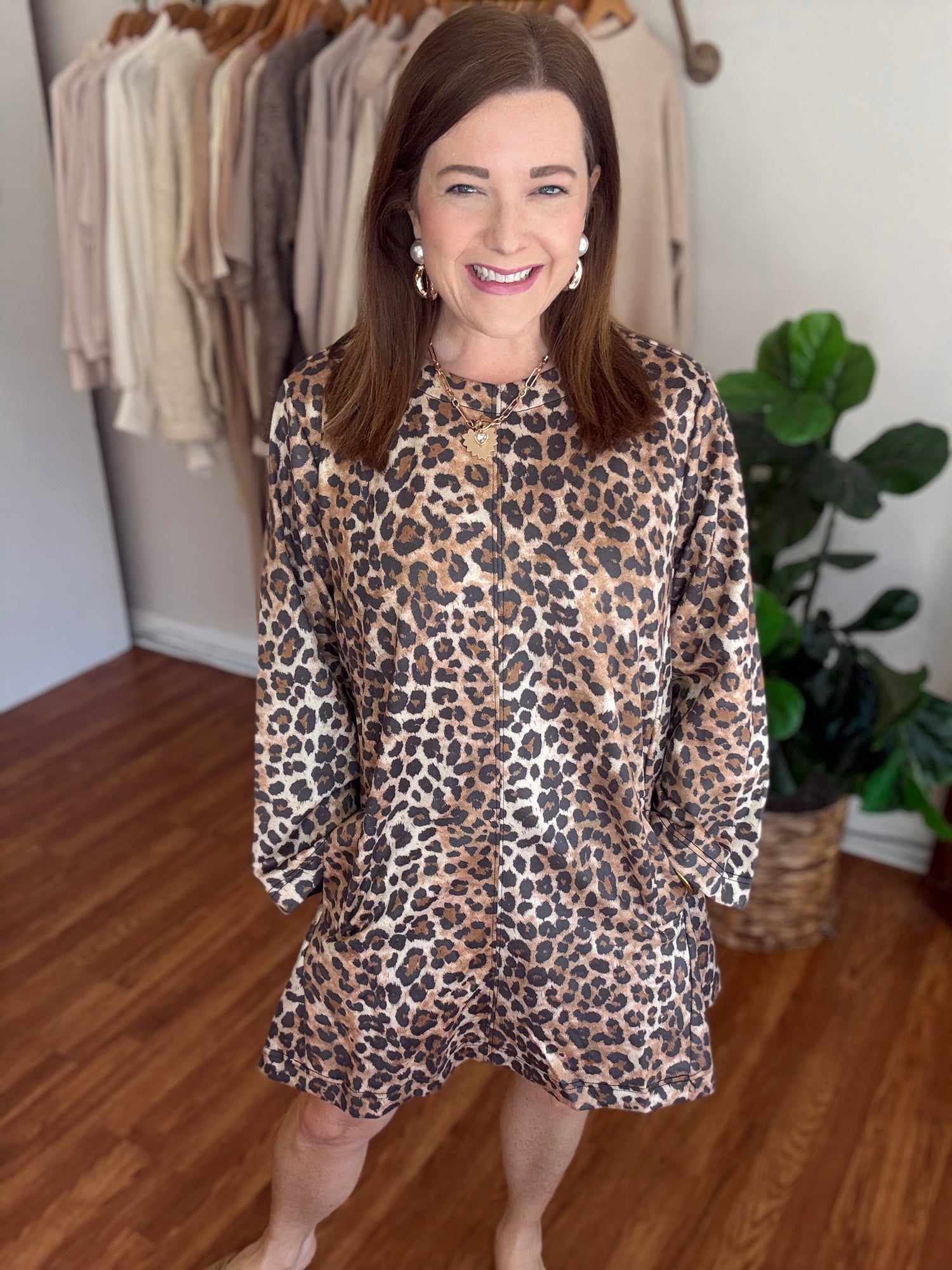 Get ready to turn heads with the This Is It Dress! Featuring a classic animal print and convenient pockets, this dress combines style and functionality. The loose fit design ensures comfort and confidence, making it the perfect choice for any occasion. Make a statement with this must-have dress now! These have a slight amount of stretch and run true to size. Candace is 5’4”, size 6/8, bra 38c, and wearing a small.
