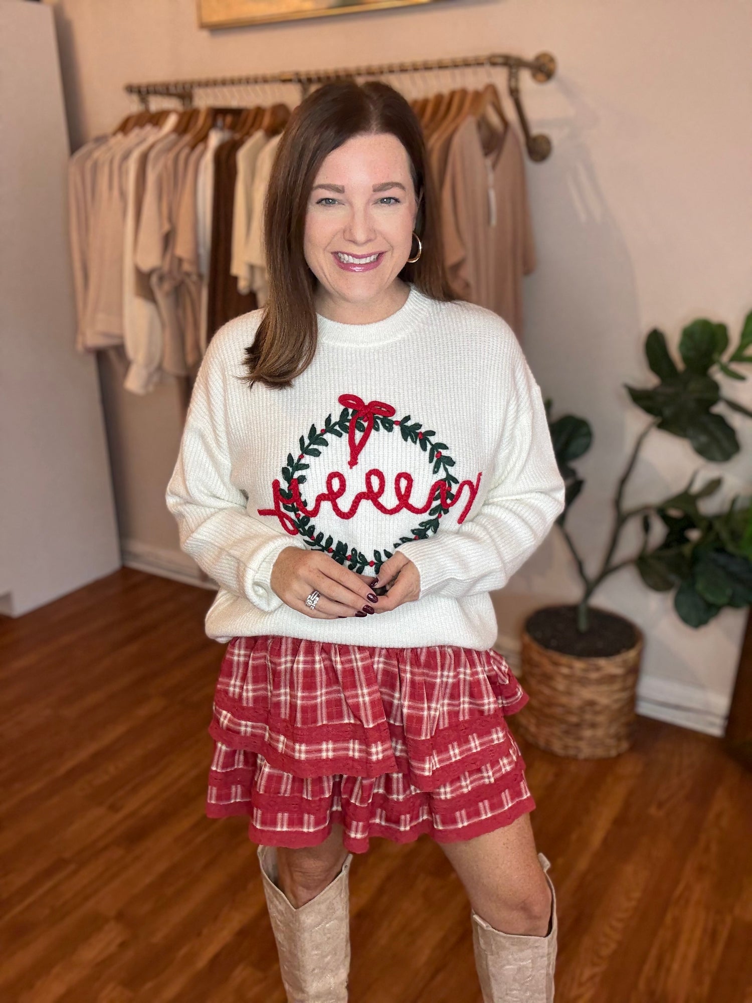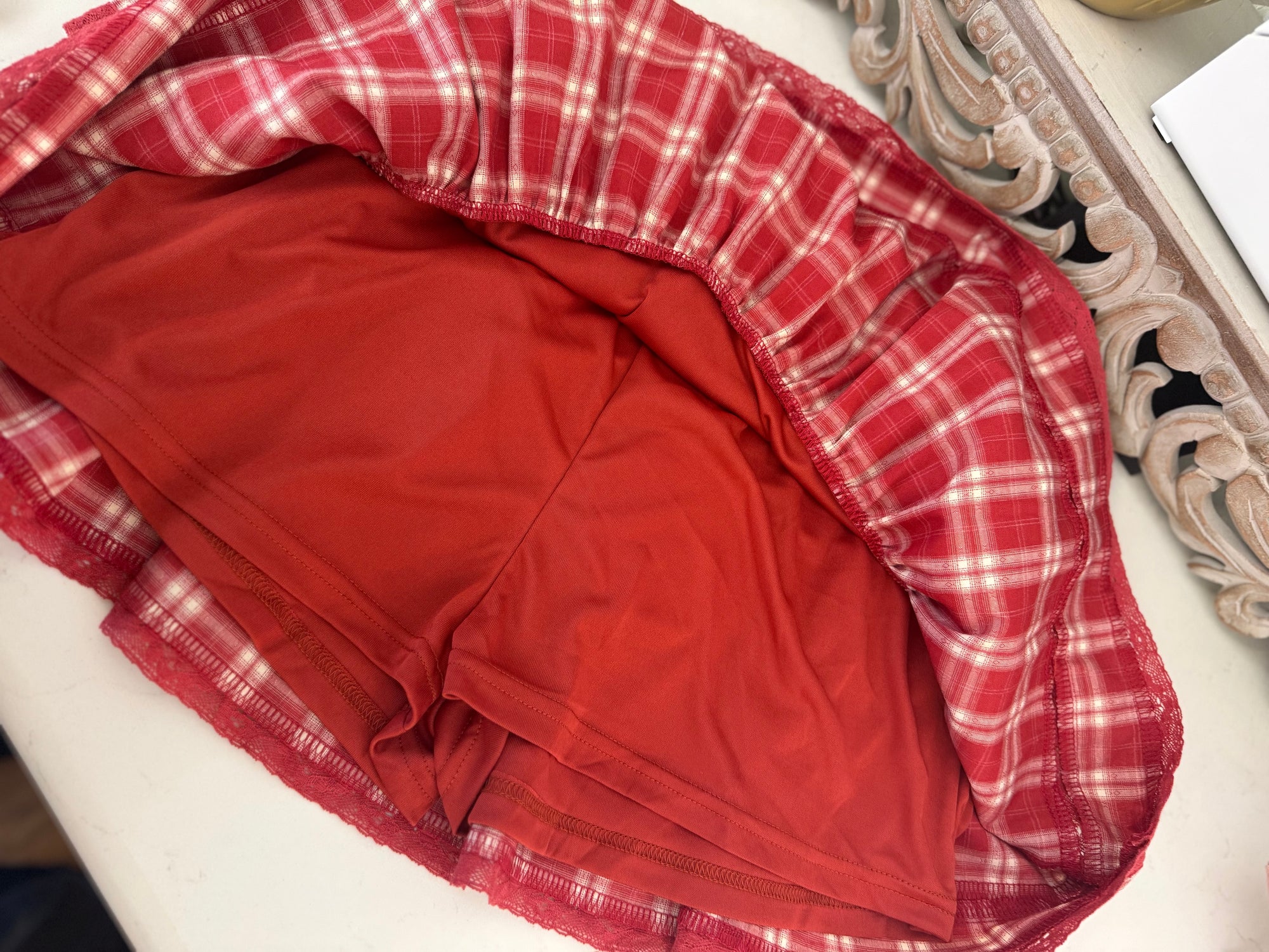 This playful plaid skort combines classic style with comfort. Featuring a soft, stretchy pair of shorts underneath, it offers freedom of movement and confidence all day long. The elastic waistband ensures a perfect fit, making it an ideal choice for both casual outings and festive occasions. Add a touch of charm and ease to your wardrobe with this versatile piece. These run true to size. Candace is 5'4", size 6/8, bra 38c, and wearing a small.
