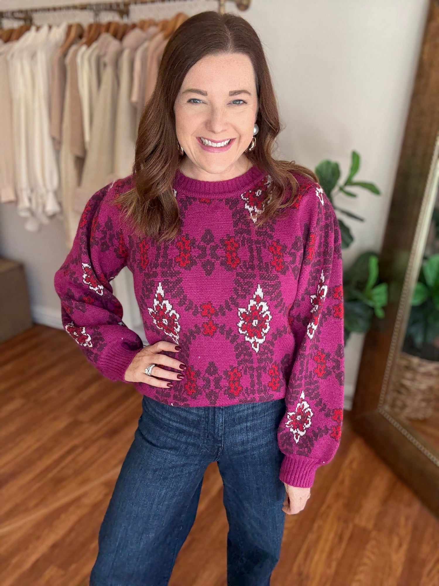 Experience the alluring style and warmth of our Why Wait Sweater! Featuring a trendy print and gorgeous colors, this soft and cozy sweater is perfect for any occasion. Don't wait any longer, upgrade your wardrobe today! These run true to size. Candace is 5’4”, size 6/8, bra 38c, and wearing a small.