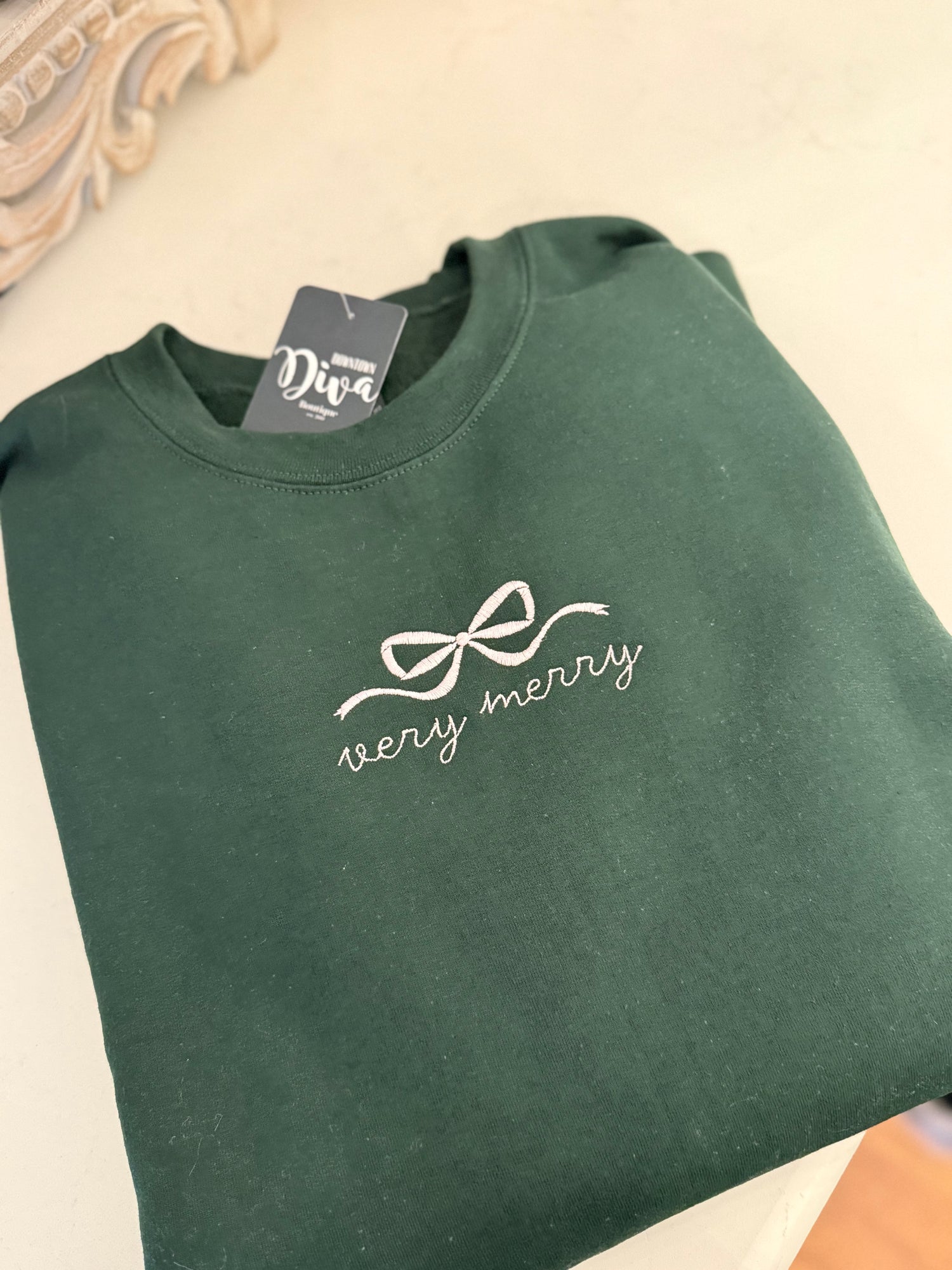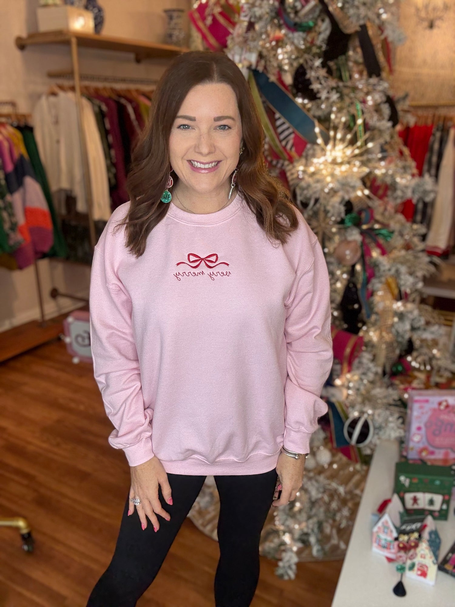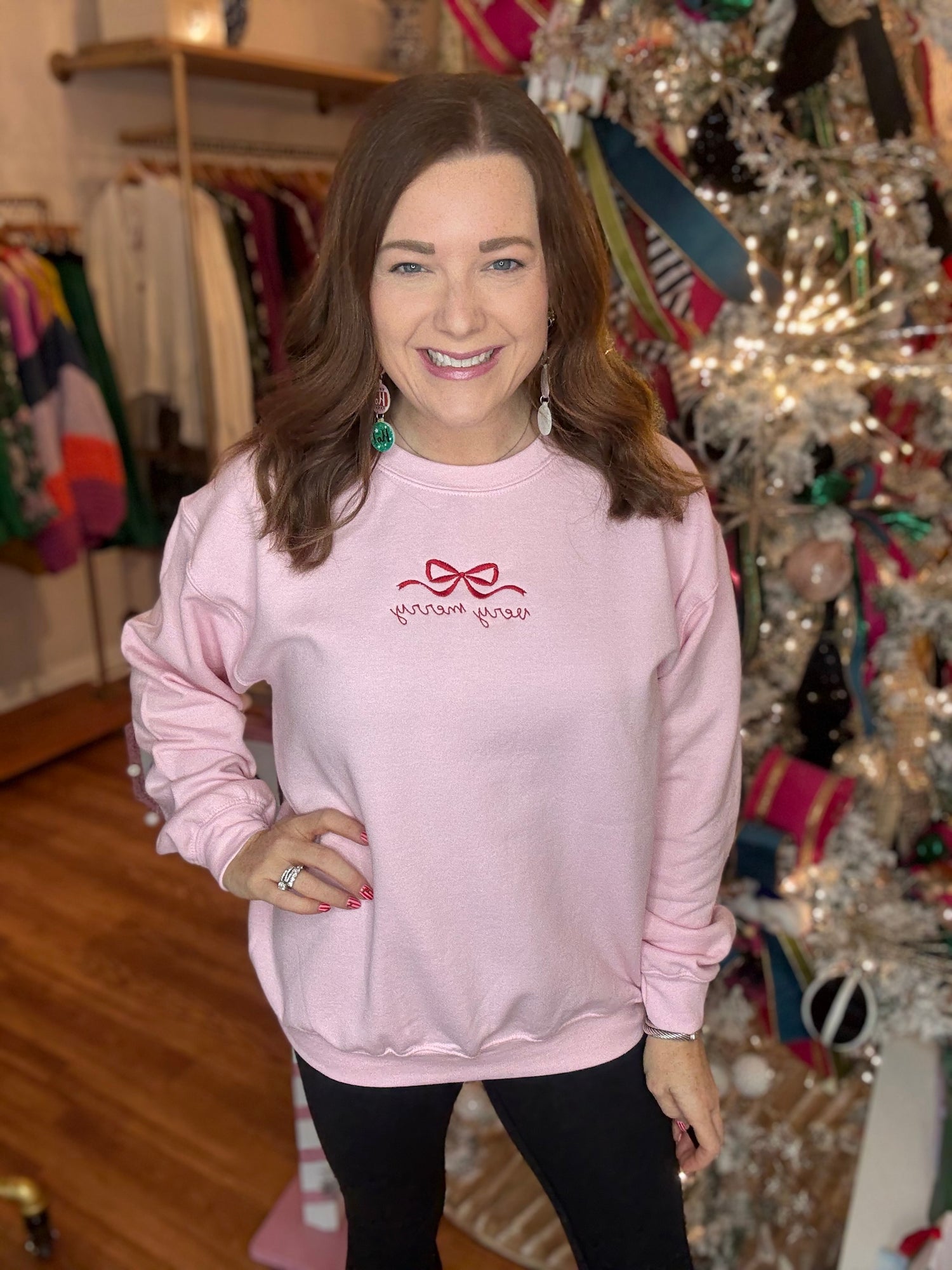 Celebrate the season in style with this classic sweatshirt showcasing a beautiful embroidered Christmas design. The timeless silhouette pairs effortlessly with your favorite jeans or leggings, making it ideal for holiday parties, family gatherings, or relaxed winter days. Quality embroidery detailing adds sophistication and personality to an essential wardrobe staple. Comfortable enough for all-day wear and durable enough to become a cherished seasonal favorite year after year, this sweatshirt delivers both festive flair and practical everyday appeal. We recommend sizing up for a more relaxed fit. Candace is 5'4", size 6/8, bra 38c, and wearing a medium.