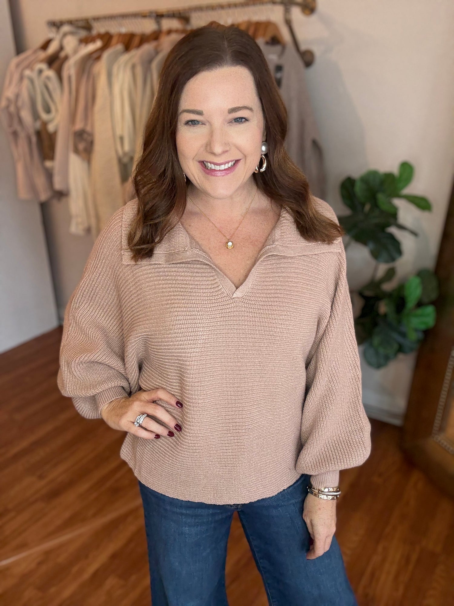 Wrap yourself in effortless elegance with this Tried & True Sweater. Crafted from sumptuous soft fabric that feels like a gentle embrace, this piece combines comfort with contemporary style. The standout oversized collar frames your face beautifully while the flattering V-neck elongates your silhouette. Bubble sleeves add a playful, on-trend touch that elevates any casual outfit. In a versatile taupe hue, this cozy sweater transitions seamlessly from weekend lounging to coffee dates. It's the wardrobe essential you'll reach for again and again. These run generous in size. Candace is 5'4", size 6/8, bra 38c, and wearing a small.