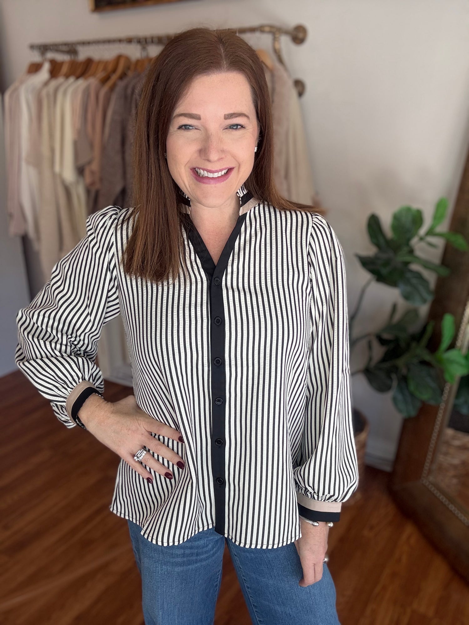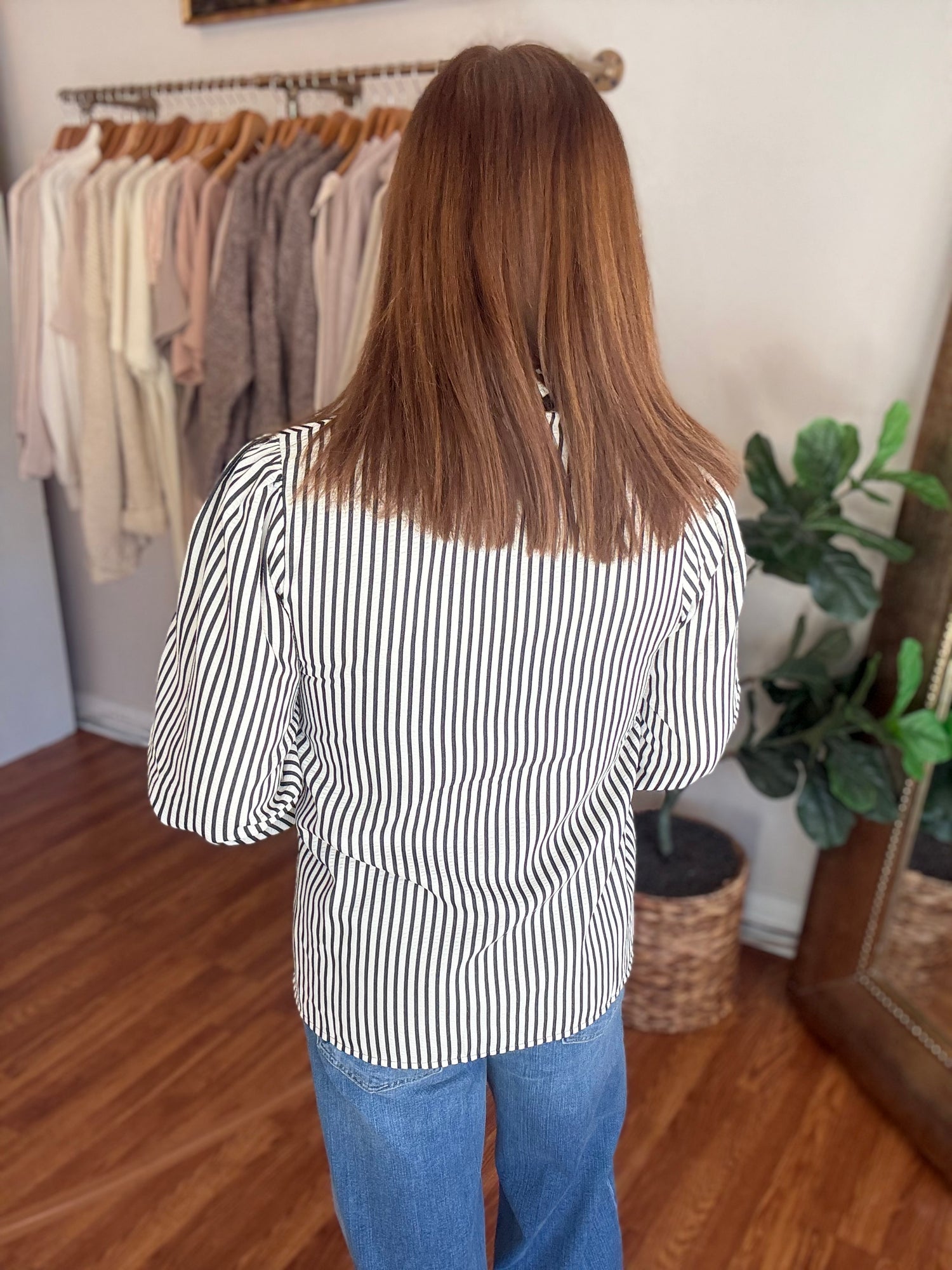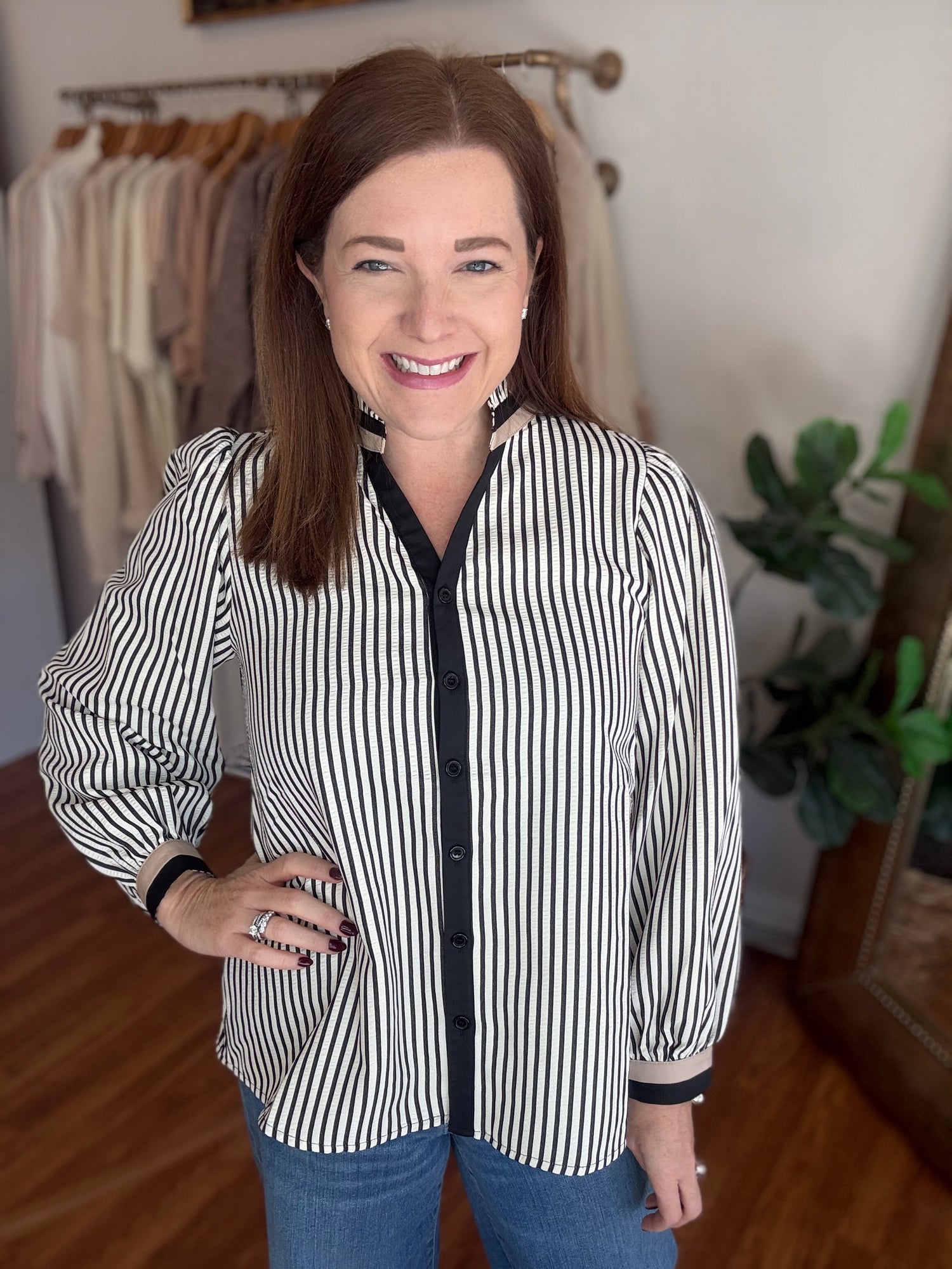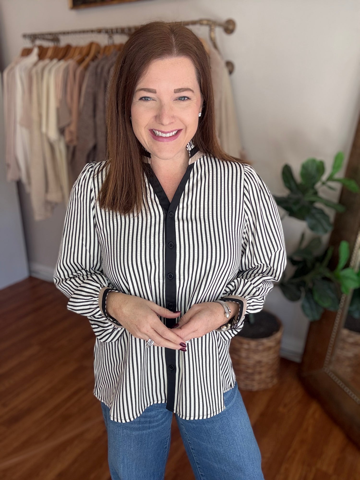 Introducing our A New Day Top! Made from classic seersucker with a button up style and contrasting trim, this top is the perfect combination of timeless and modern. Look effortlessly put-together and stylish in any setting. These have no stretch and run true to size to slightly small through the bust. Candace is 5’4”, size 6/8, bra 38c, and wearing a small.