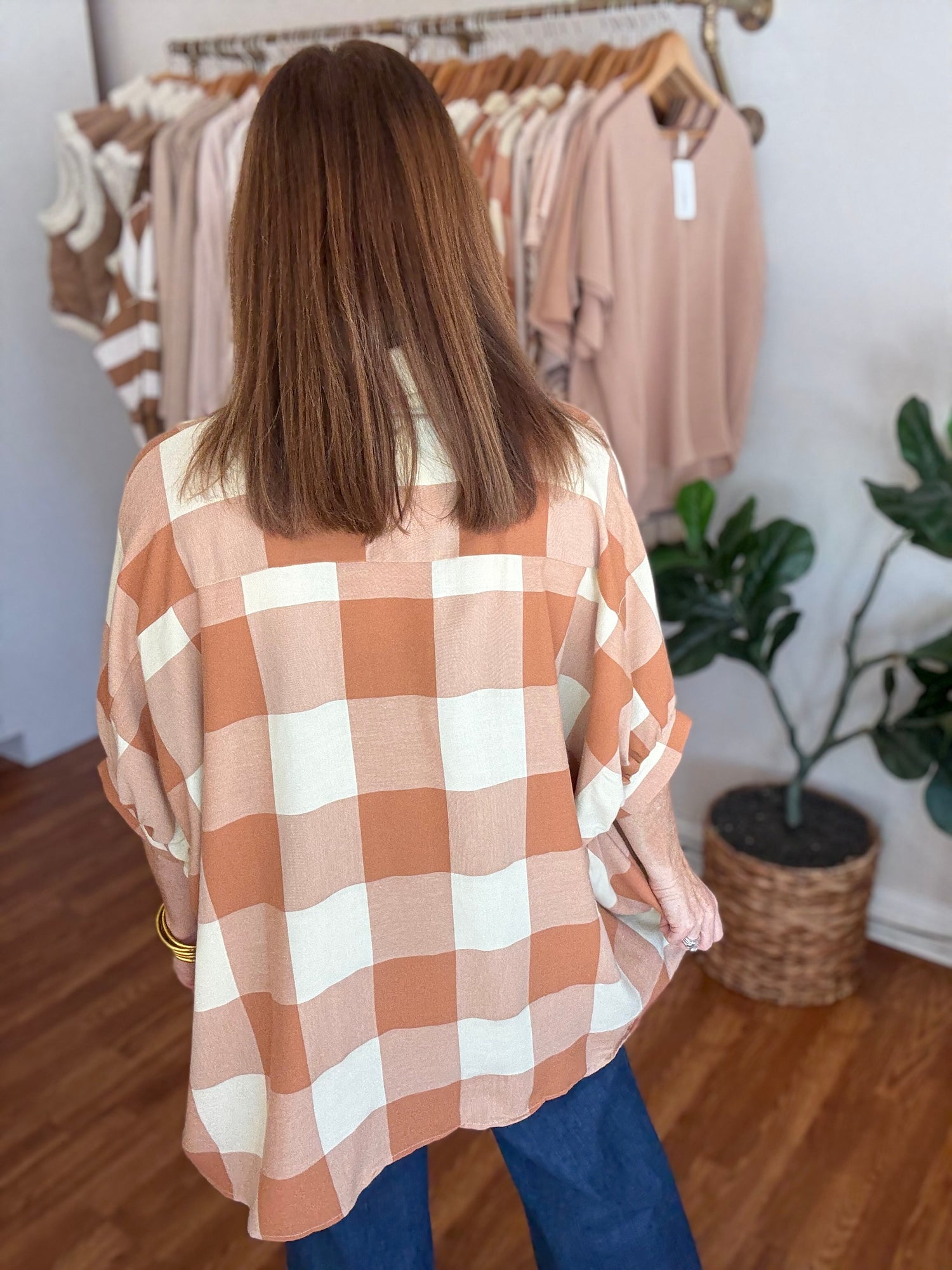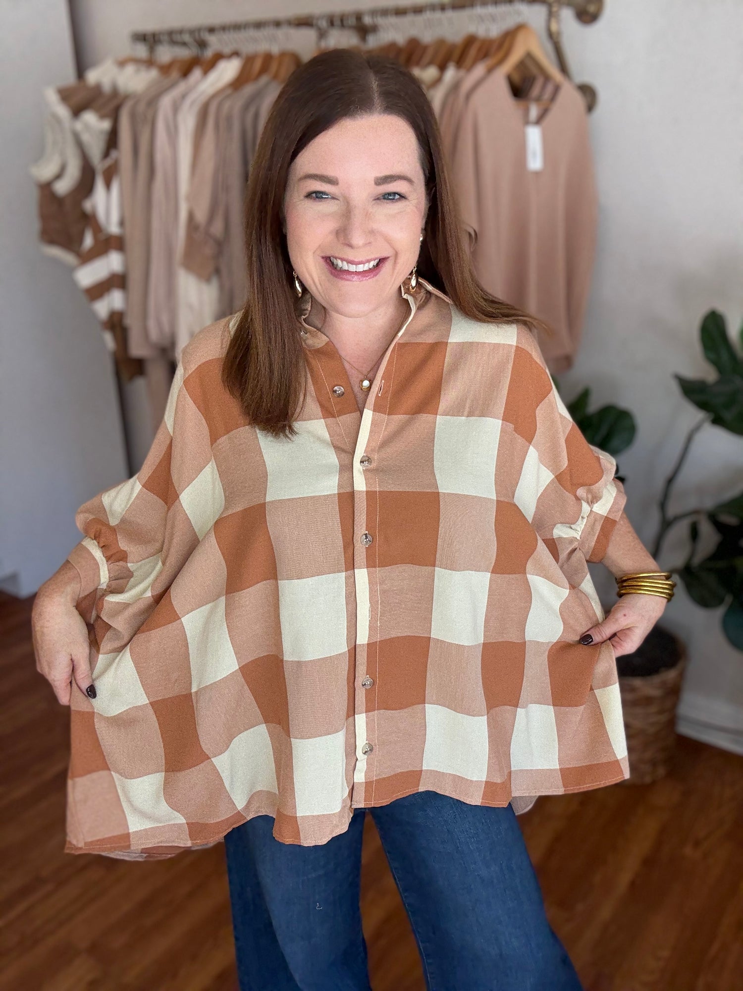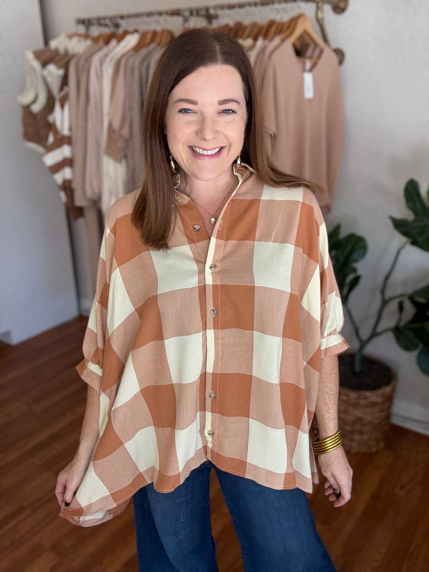 Introducing the All Up to You Top, the perfect blend of style and comfort! With its fall gingham pattern and oversized fit, this button up top allows you to make a statement while staying cozy. Step up your wardrobe and make it all up to you! These have not stretch and run generous in size. We recommend sizing down. Candace is 5’4”, size 6/8, bra 38c, and wearing a small/medium.