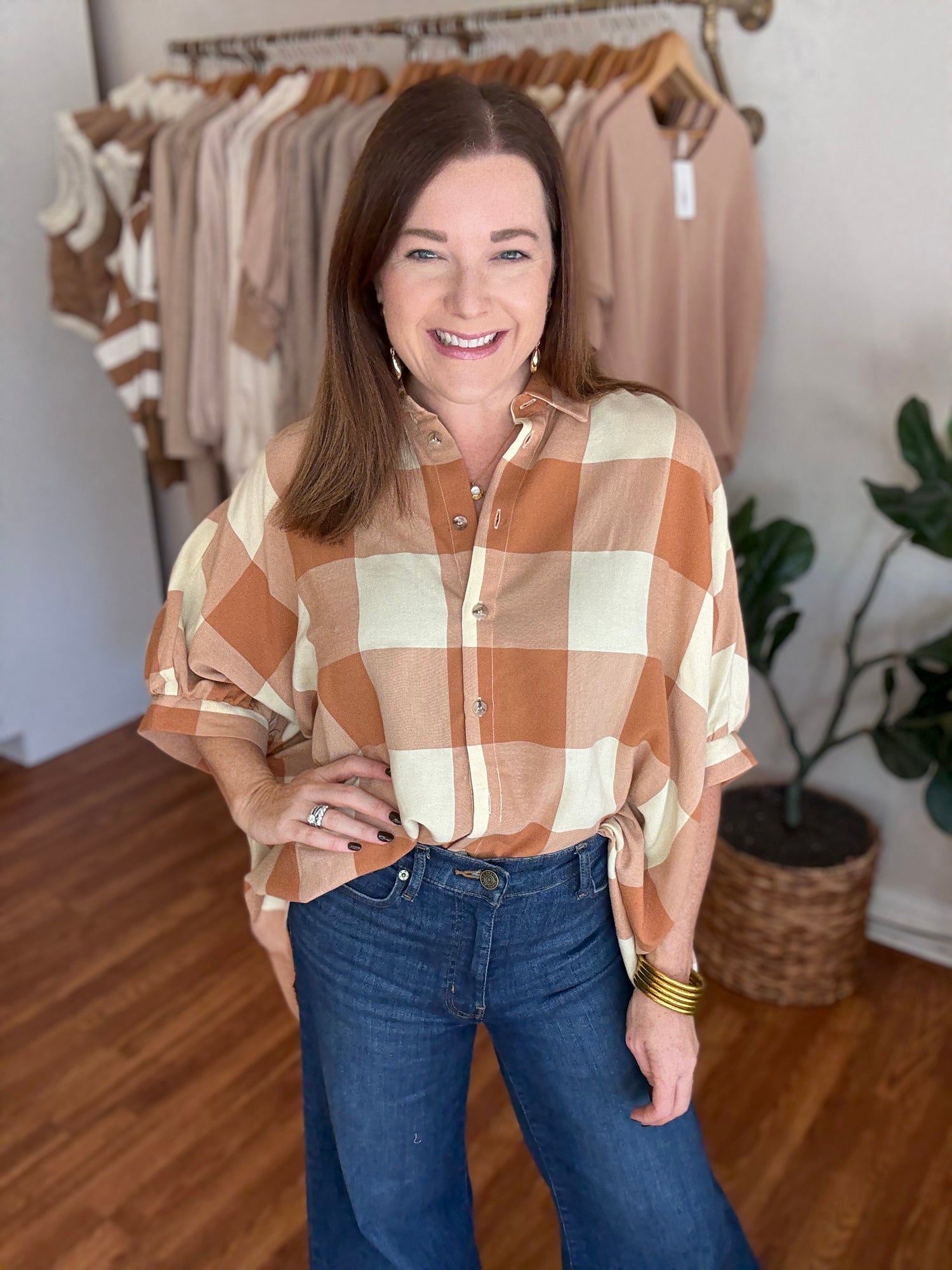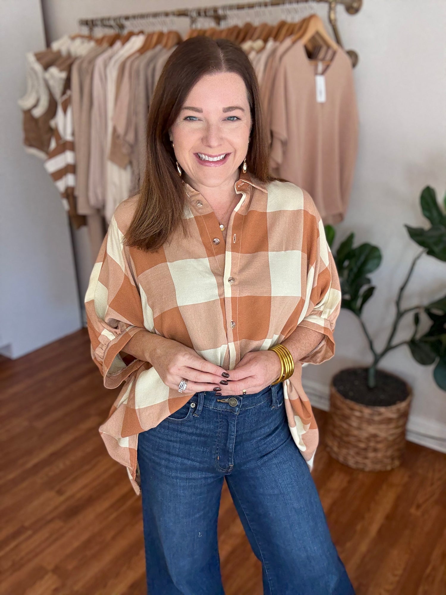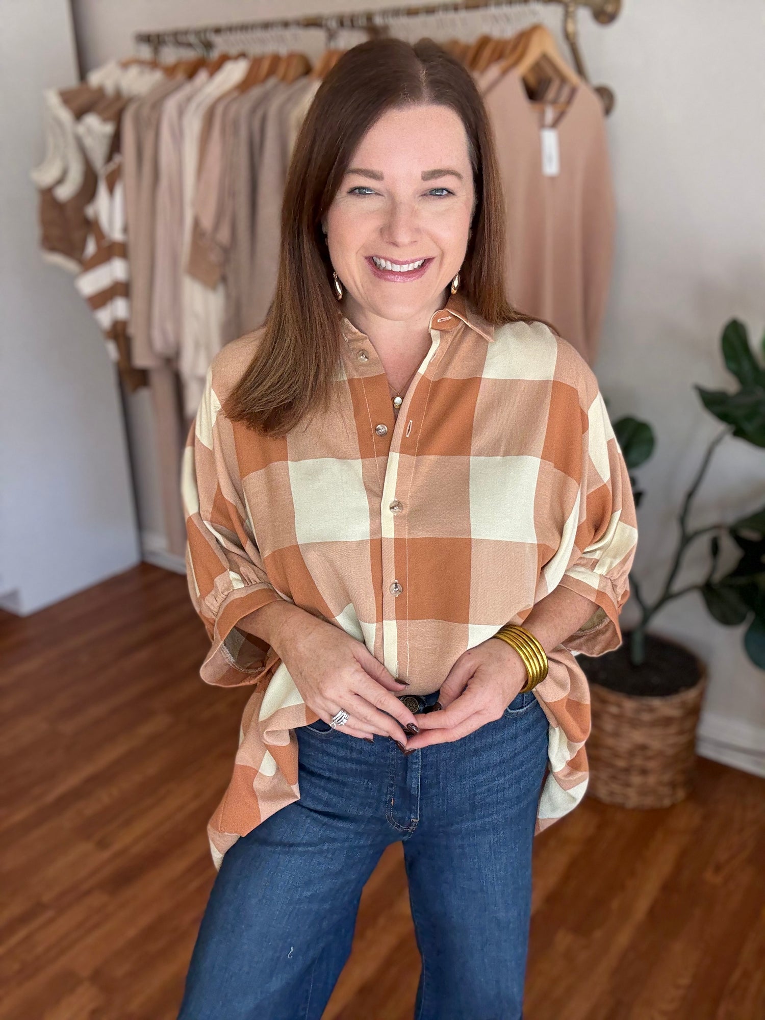 Introducing the All Up to You Top, the perfect blend of style and comfort! With its fall gingham pattern and oversized fit, this button up top allows you to make a statement while staying cozy. Step up your wardrobe and make it all up to you! These have not stretch and run generous in size. We recommend sizing down. Candace is 5’4”, size 6/8, bra 38c, and wearing a small/medium.