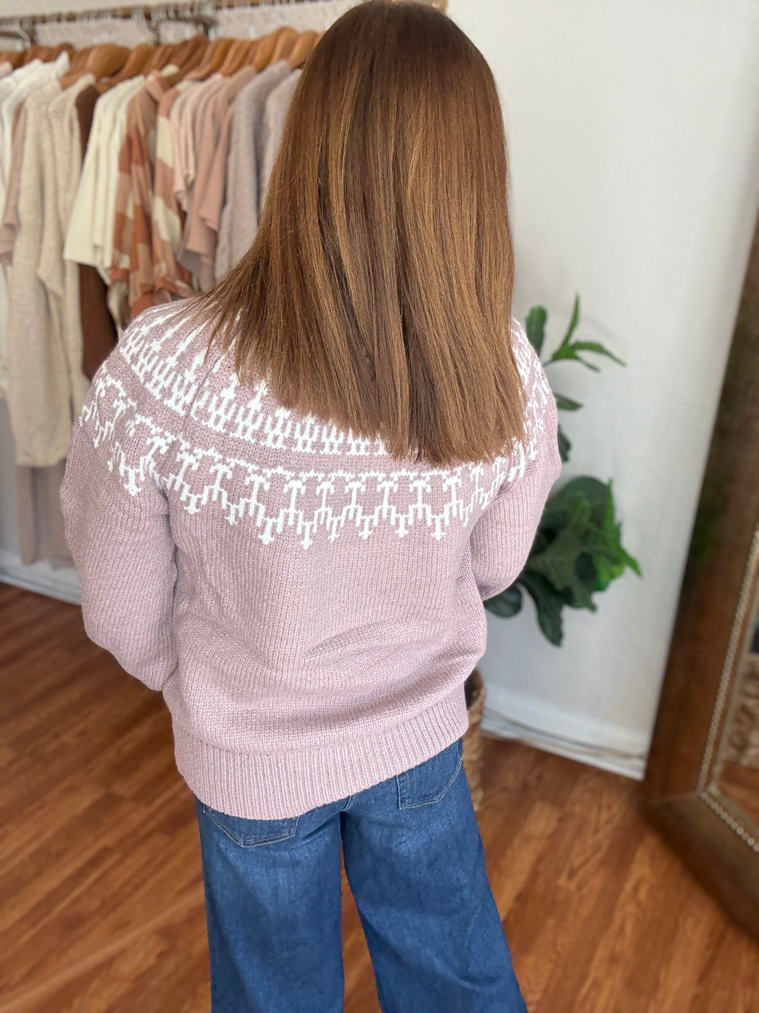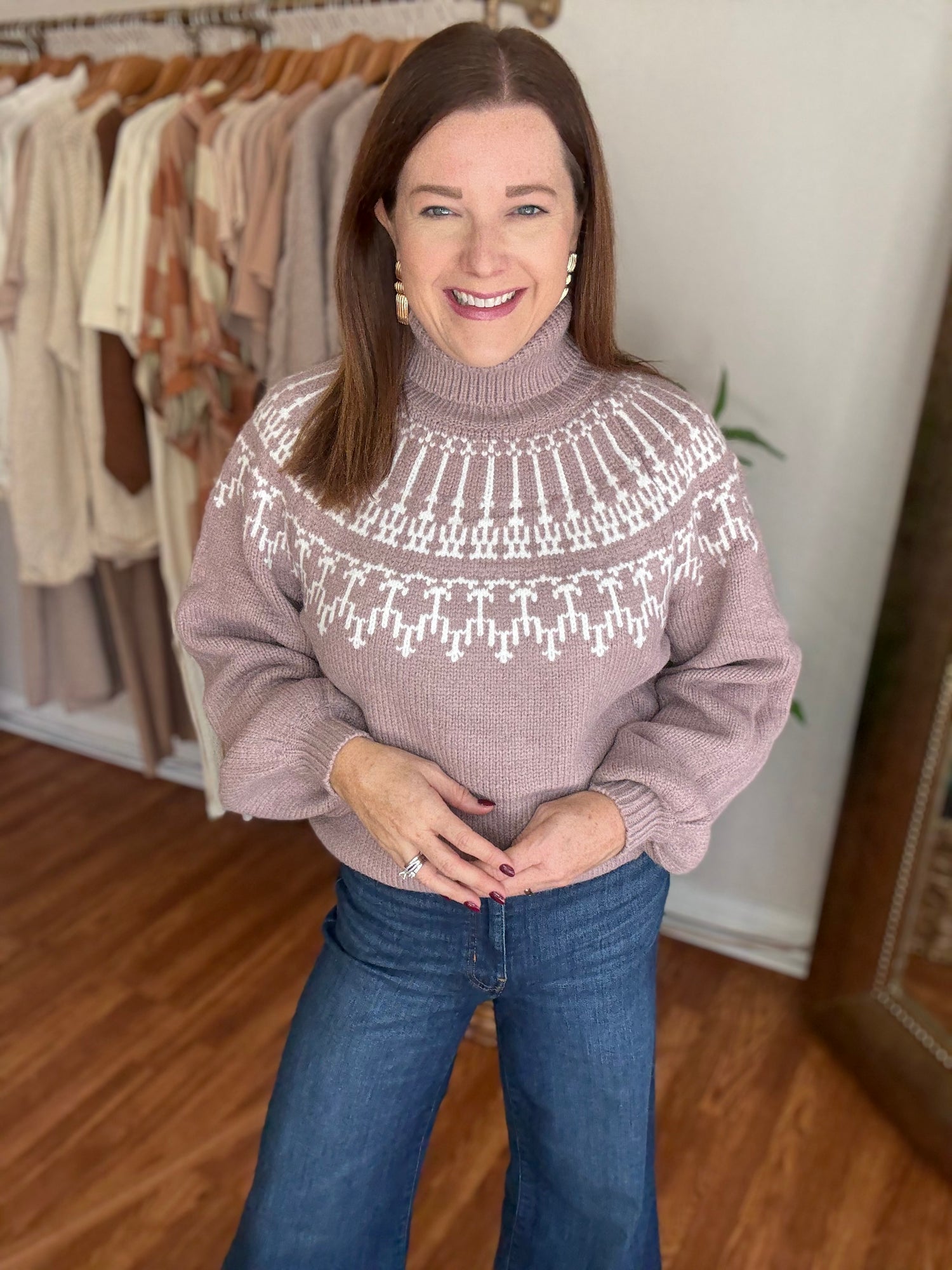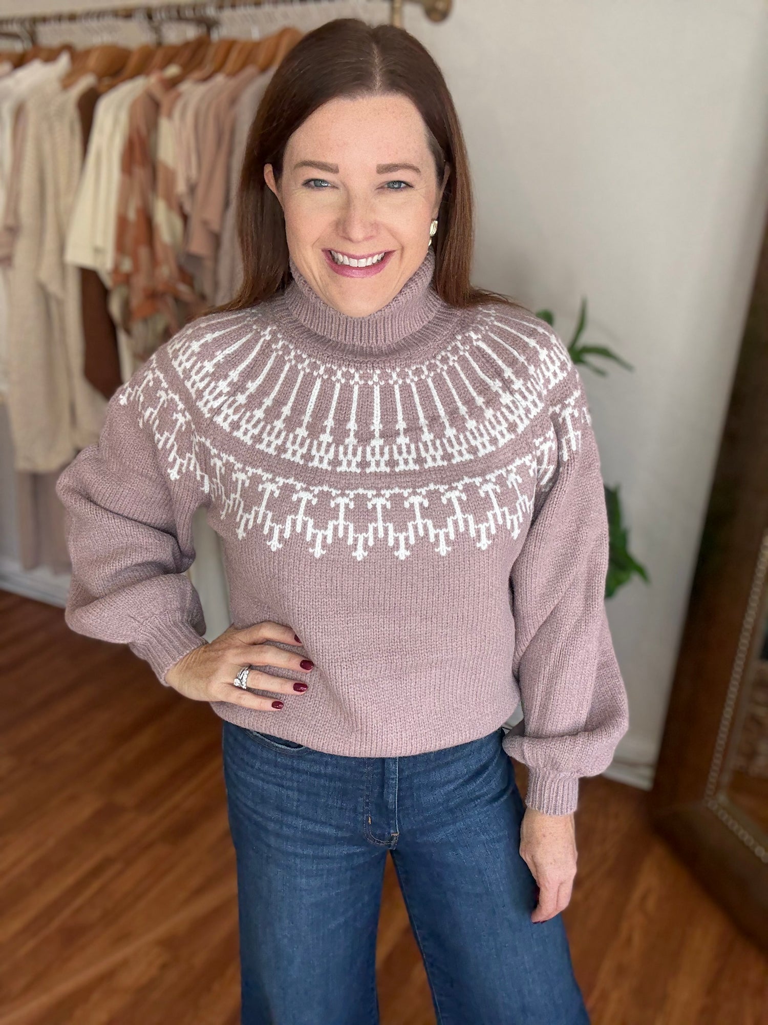 Embrace timeless elegance with this classic fair isle print turtle neck sweater in a sophisticated mauve hue. Perfect for crisp autumn days and cozy winter nights, this piece combines traditional Nordic-inspired patterns with modern comfort. The soft, warm fabric wraps you in coziness while the versatile color pairs effortlessly with your existing wardrobe. Whether you're settling in by the fireplace or heading out for a casual gathering, this sweater delivers both style and the comfort you crave. A wardrobe essential that never goes out of style. These run true to size. Candace is 5'4", size 6/8, bra 38c, and wearing a small.