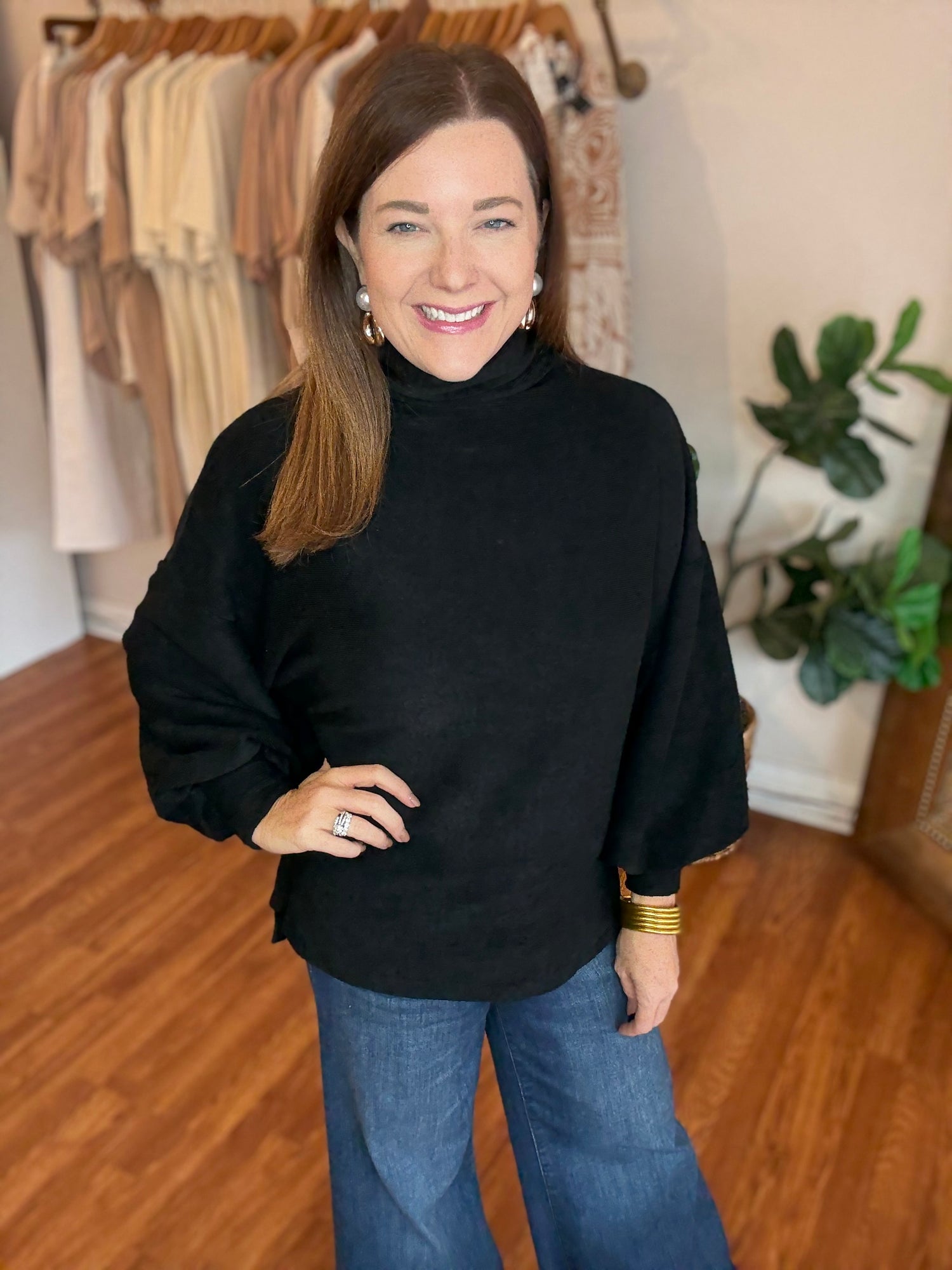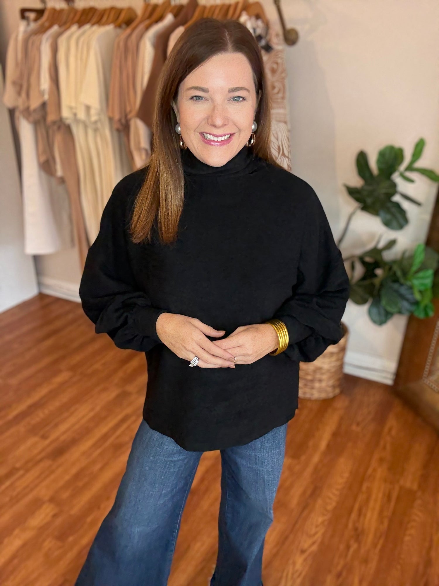 Experience effortless style and comfort with the Cloud Nine Top. It's loose fit and mock neck create a relaxed yet refined silhouette, while the balloon sleeves add a trendy, voluminous touch. Crafted from soft, ribbed knit fabric, this top offers cozy warmth and a flattering textured finish perfect for any season. Elevate your wardrobe with this versatile piece that combines fashion and comfort seamlessly. These are a soft, stretchy knit and run generous in size. Candace is 5'4", size 6/8, bra 38c, and wearing a small.